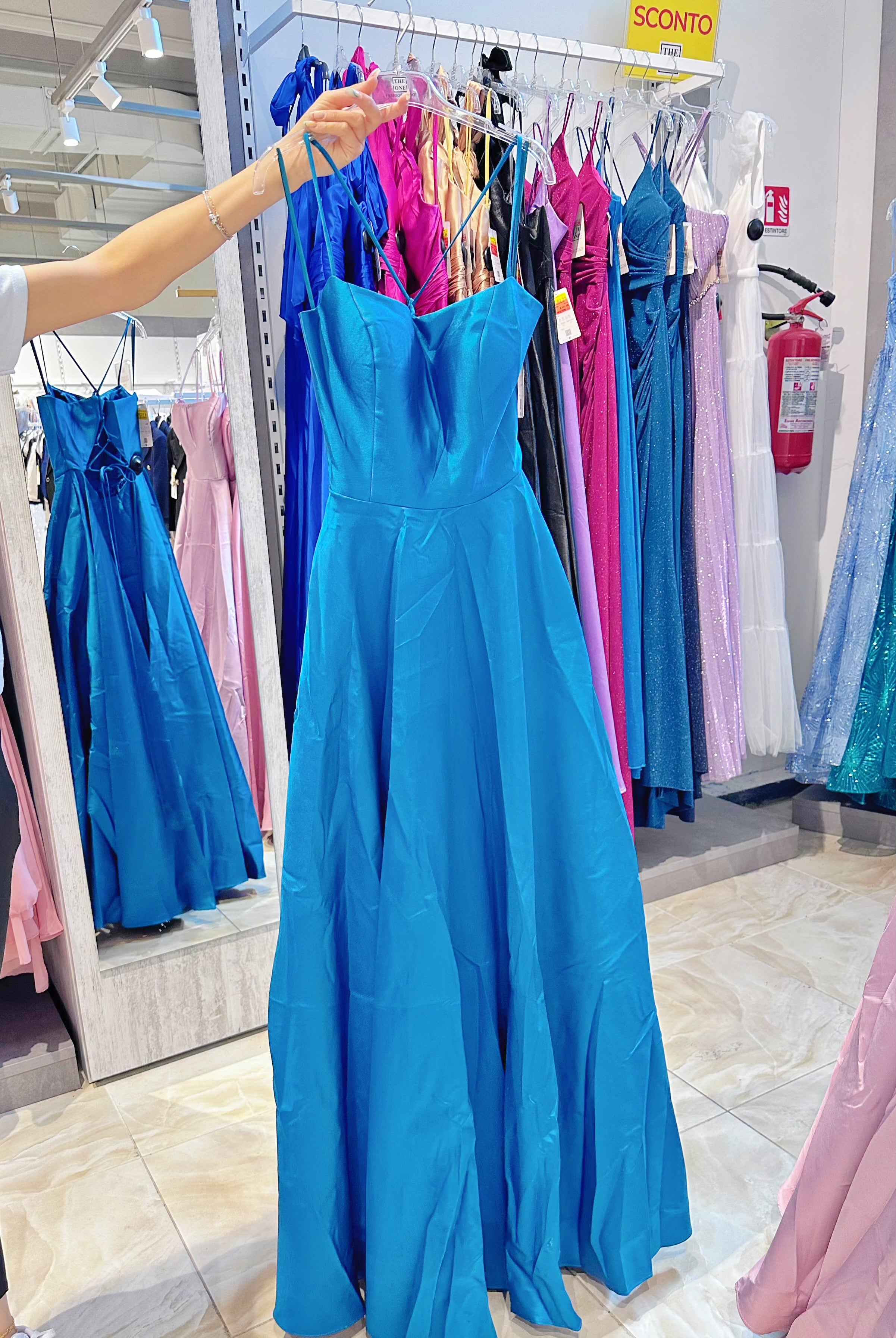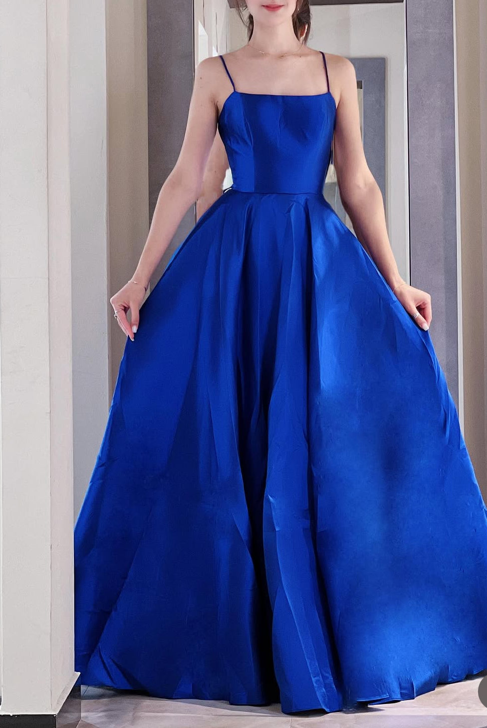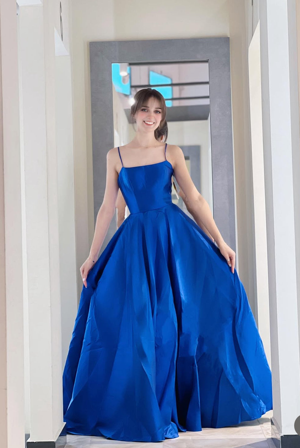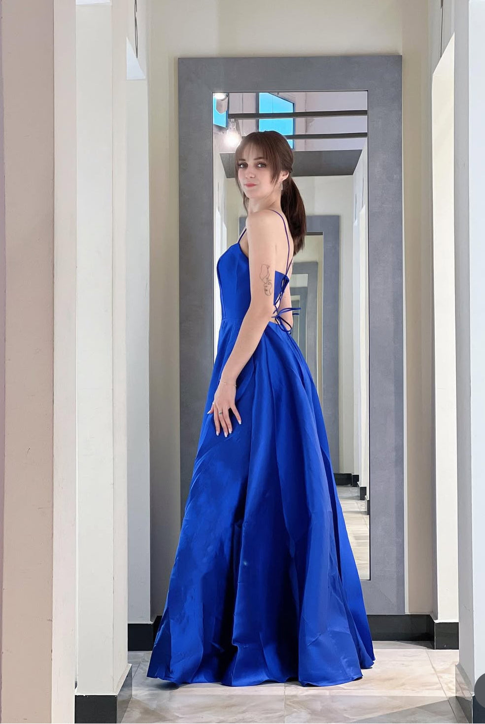 Abito lungo elegante blu royal con spalline sottili e schiena allacciata – con tasche