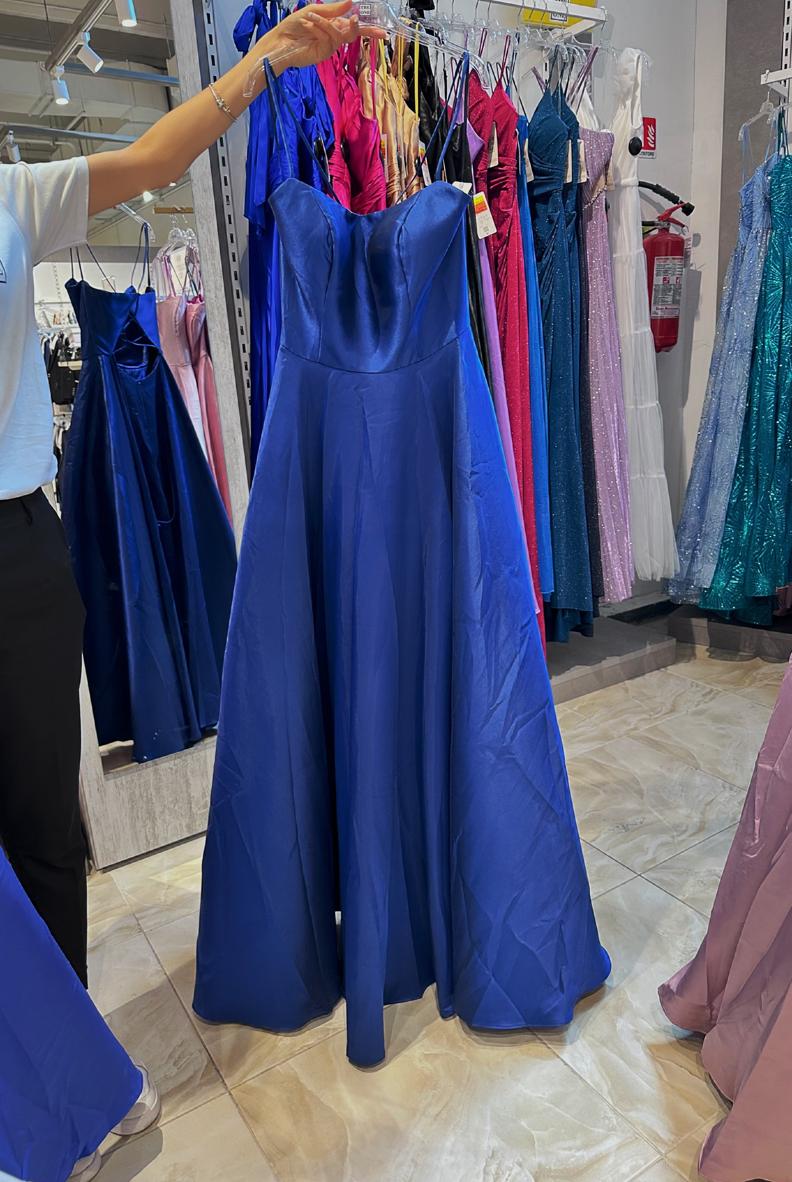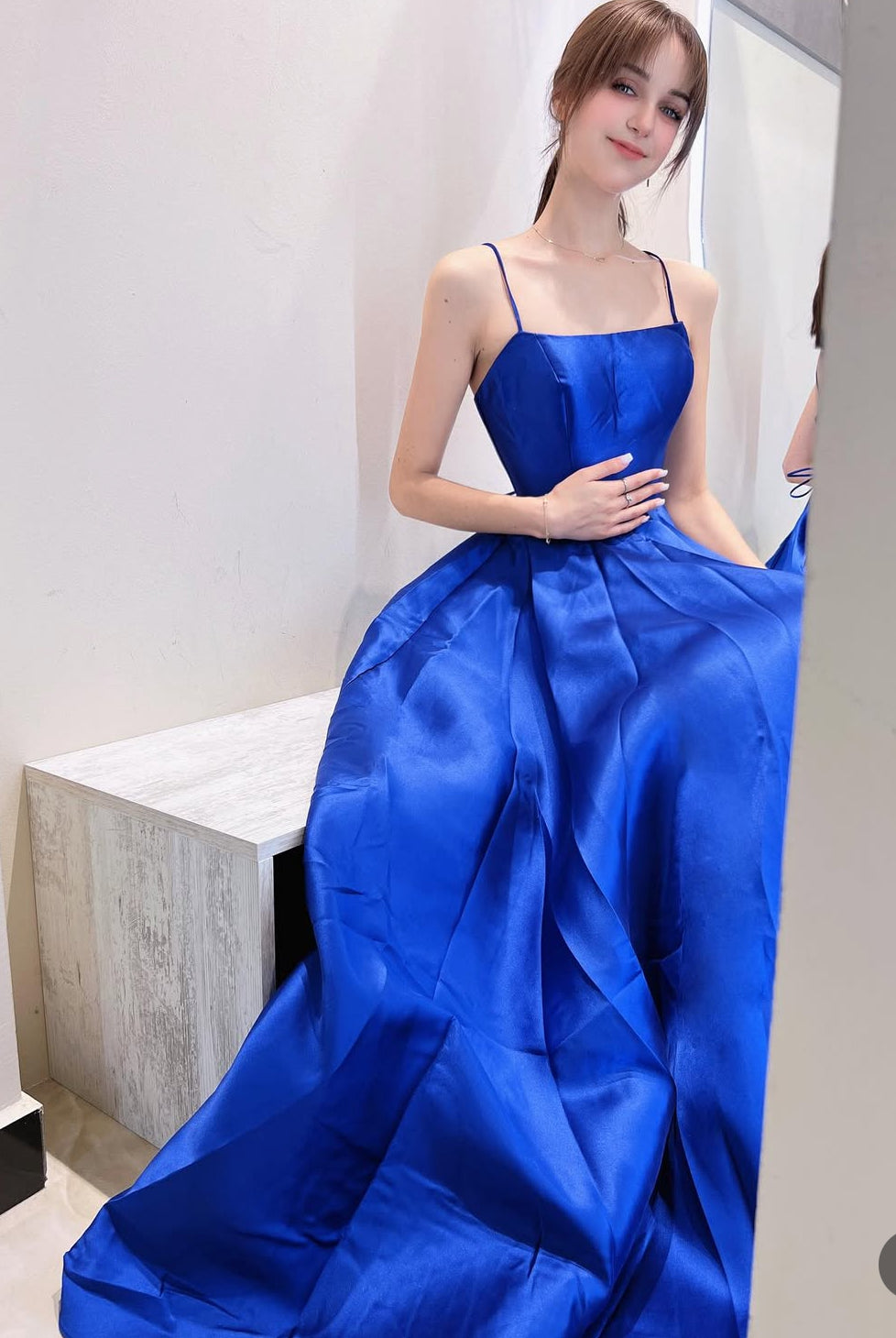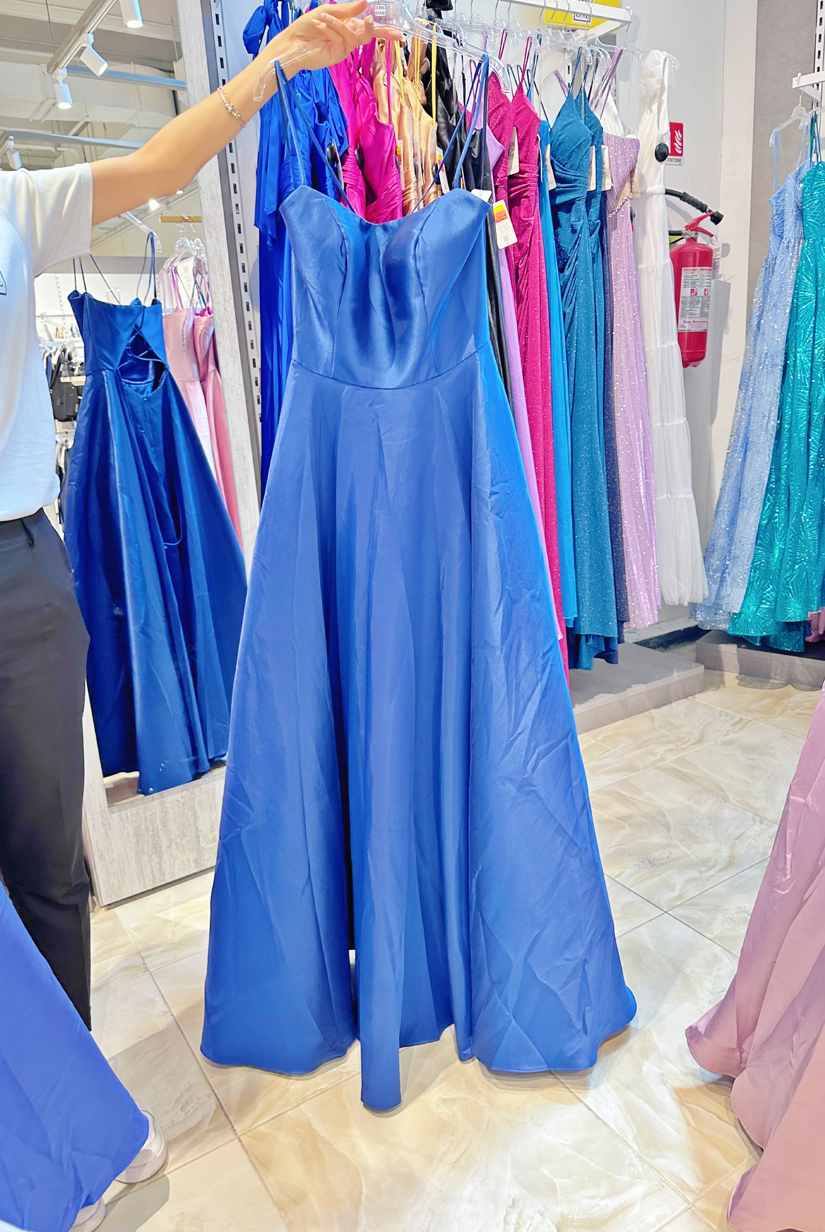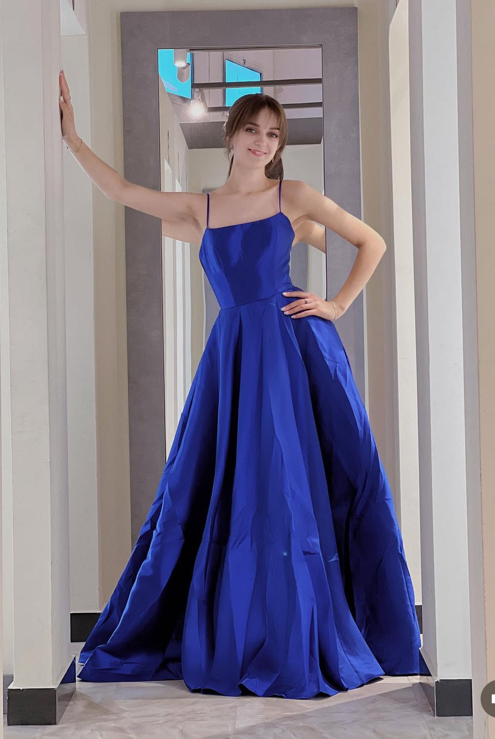 Abito lungo elegante blu royal con spalline sottili e schiena allacciata – con tasche