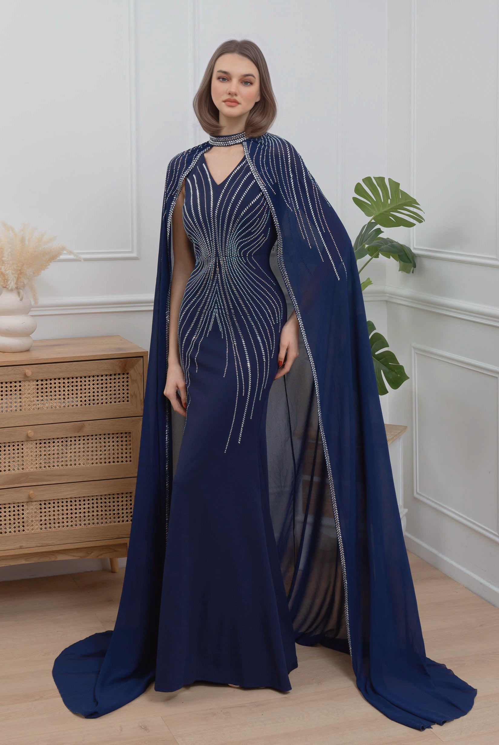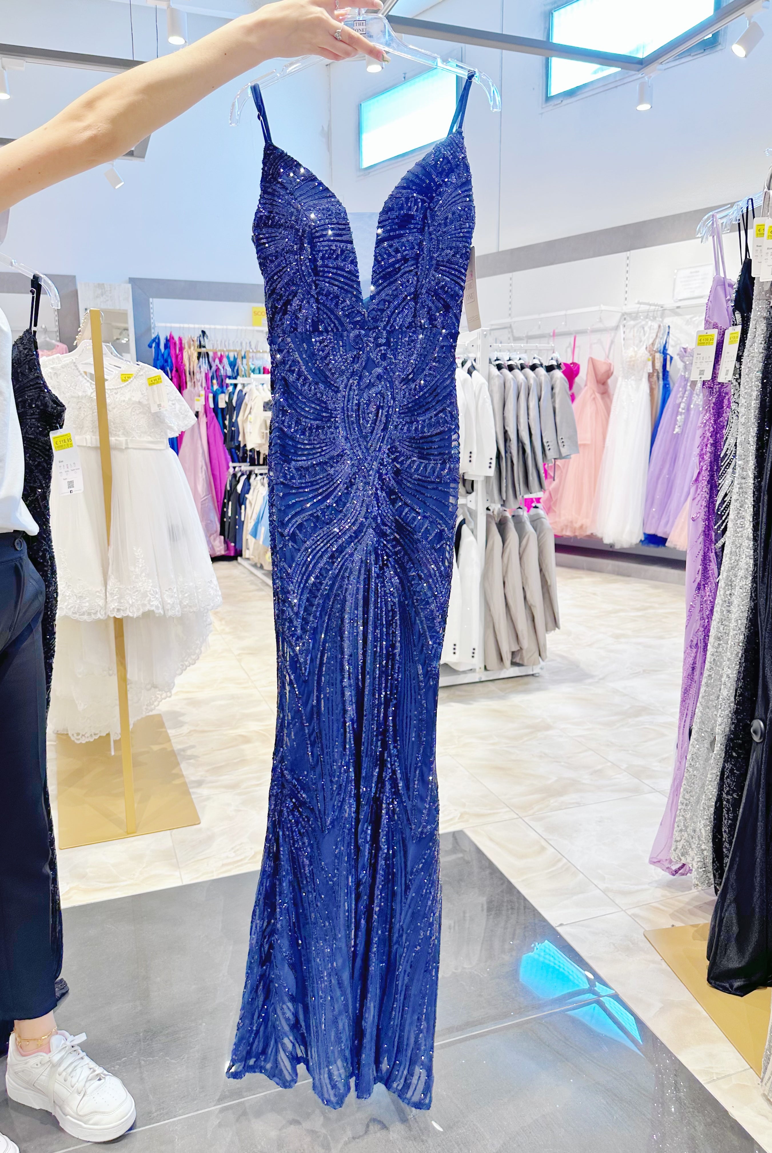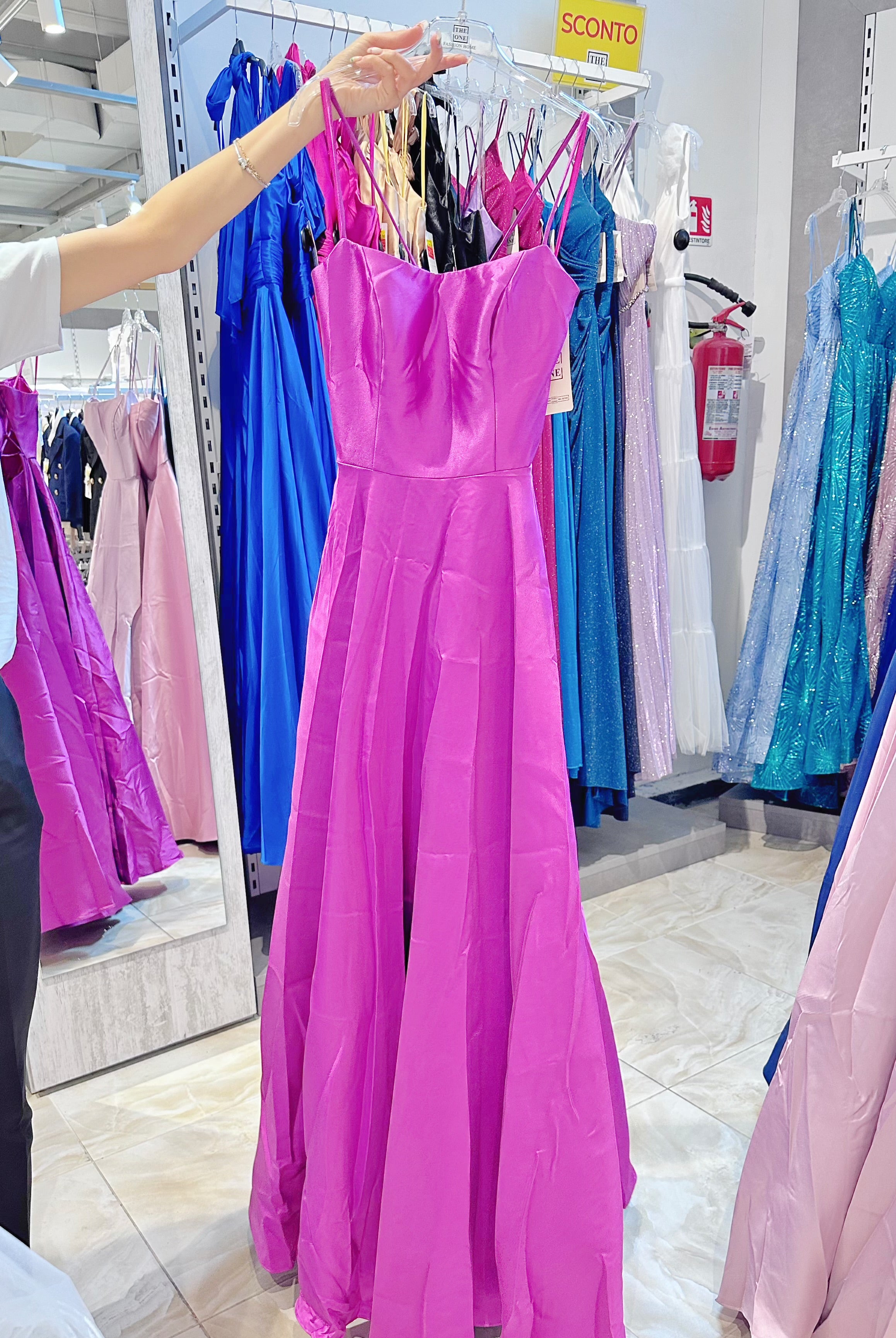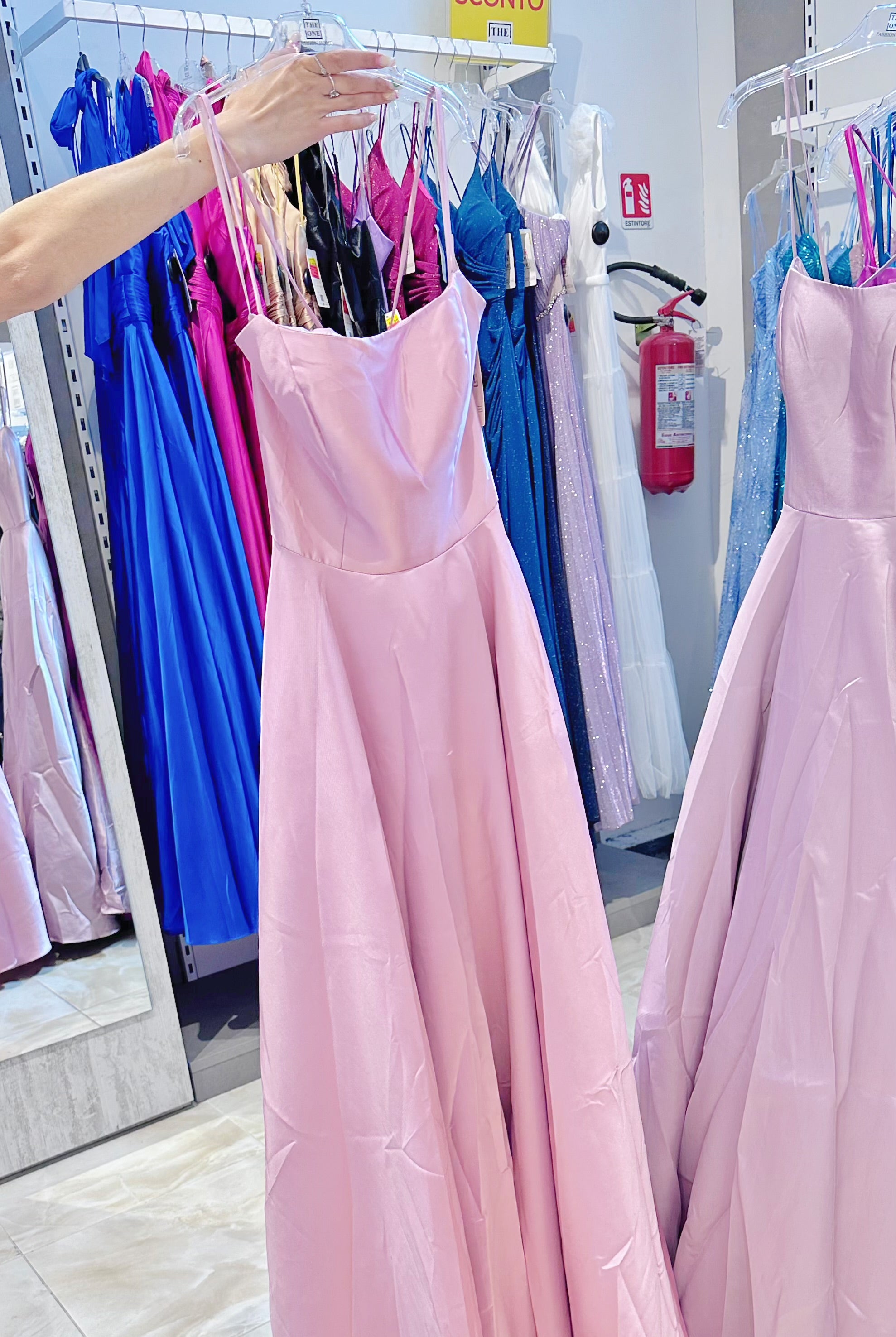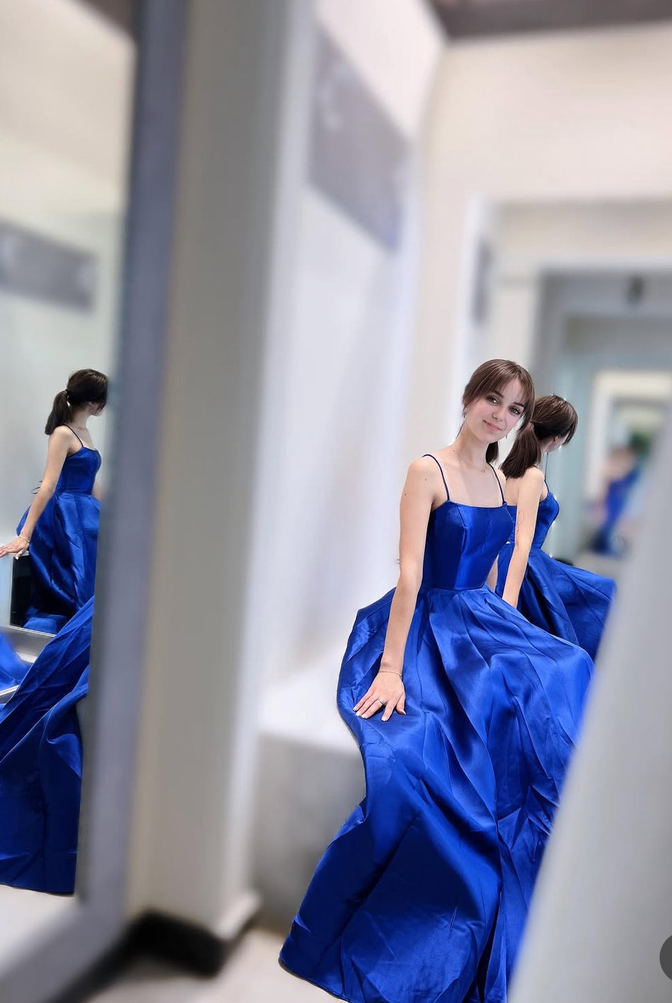 Abito lungo elegante blu royal con spalline sottili e schiena allacciata – con tasche