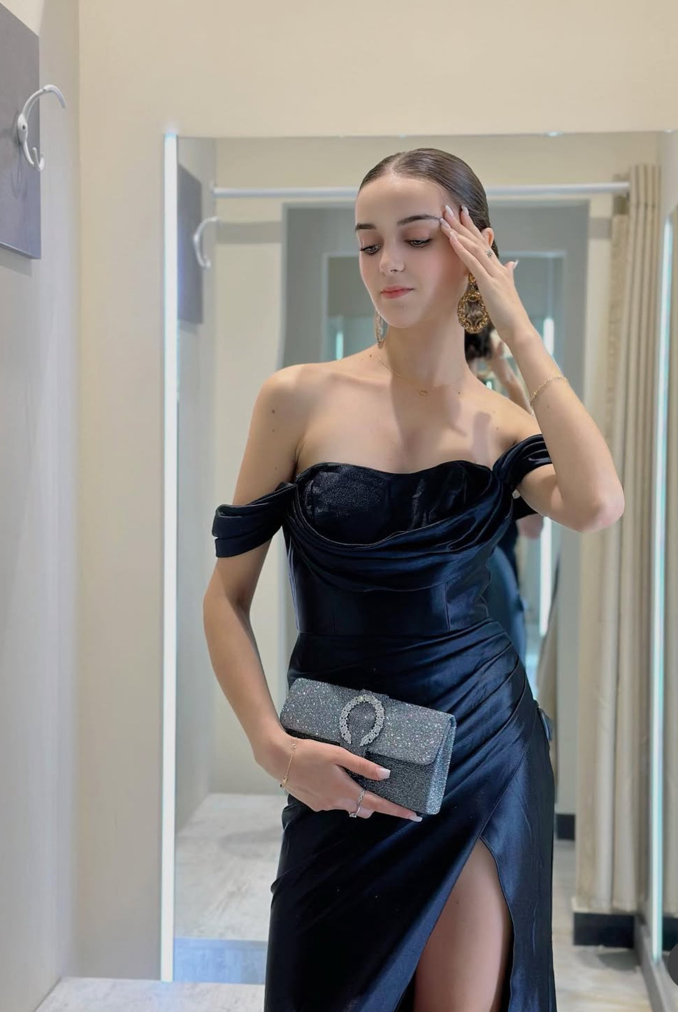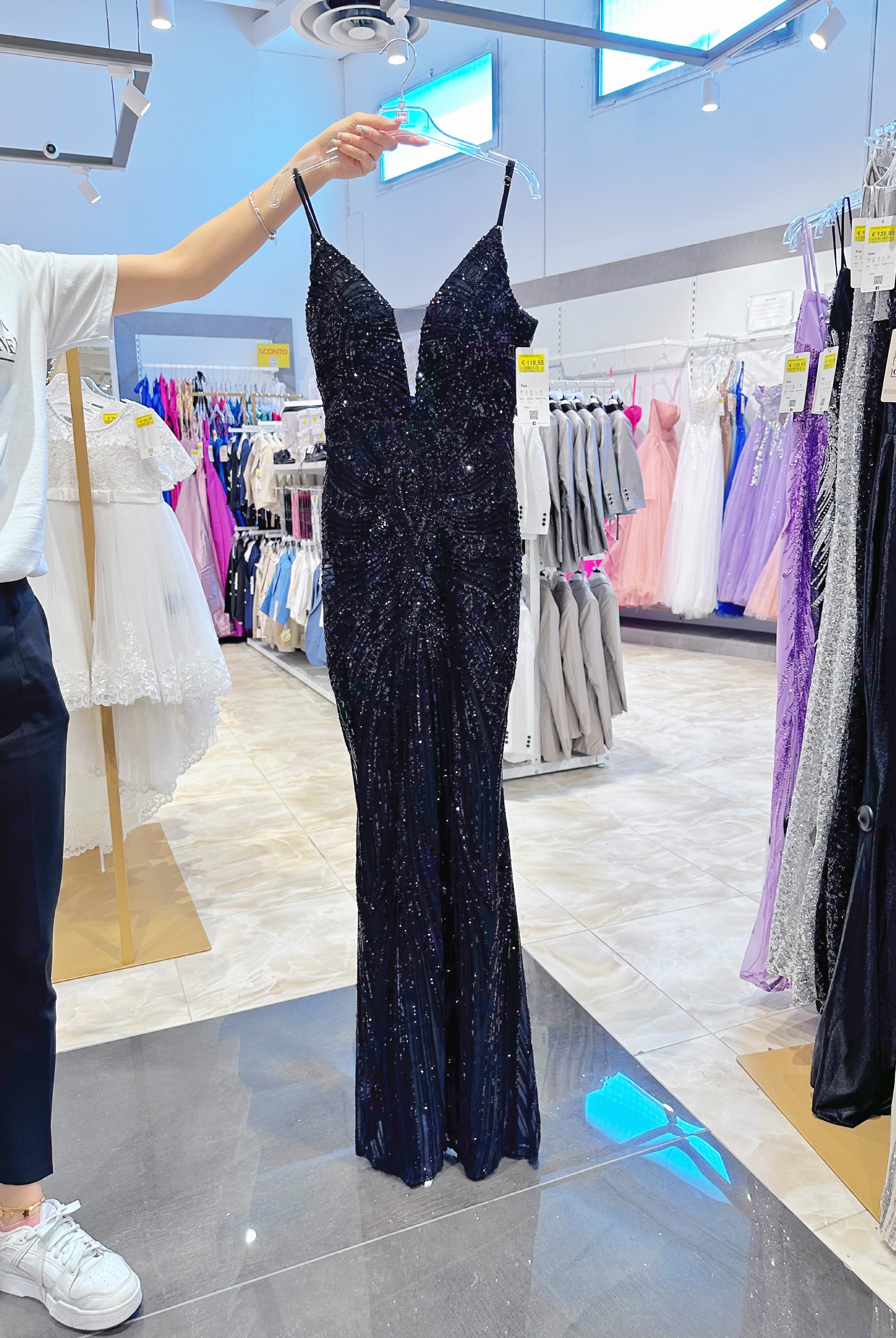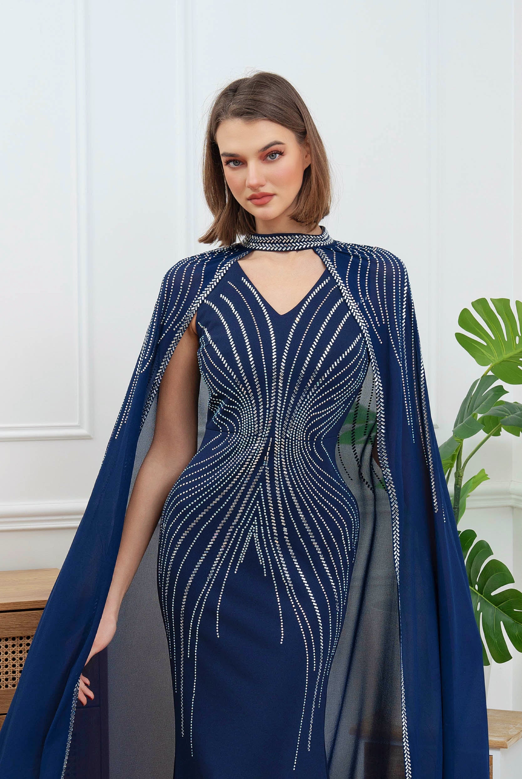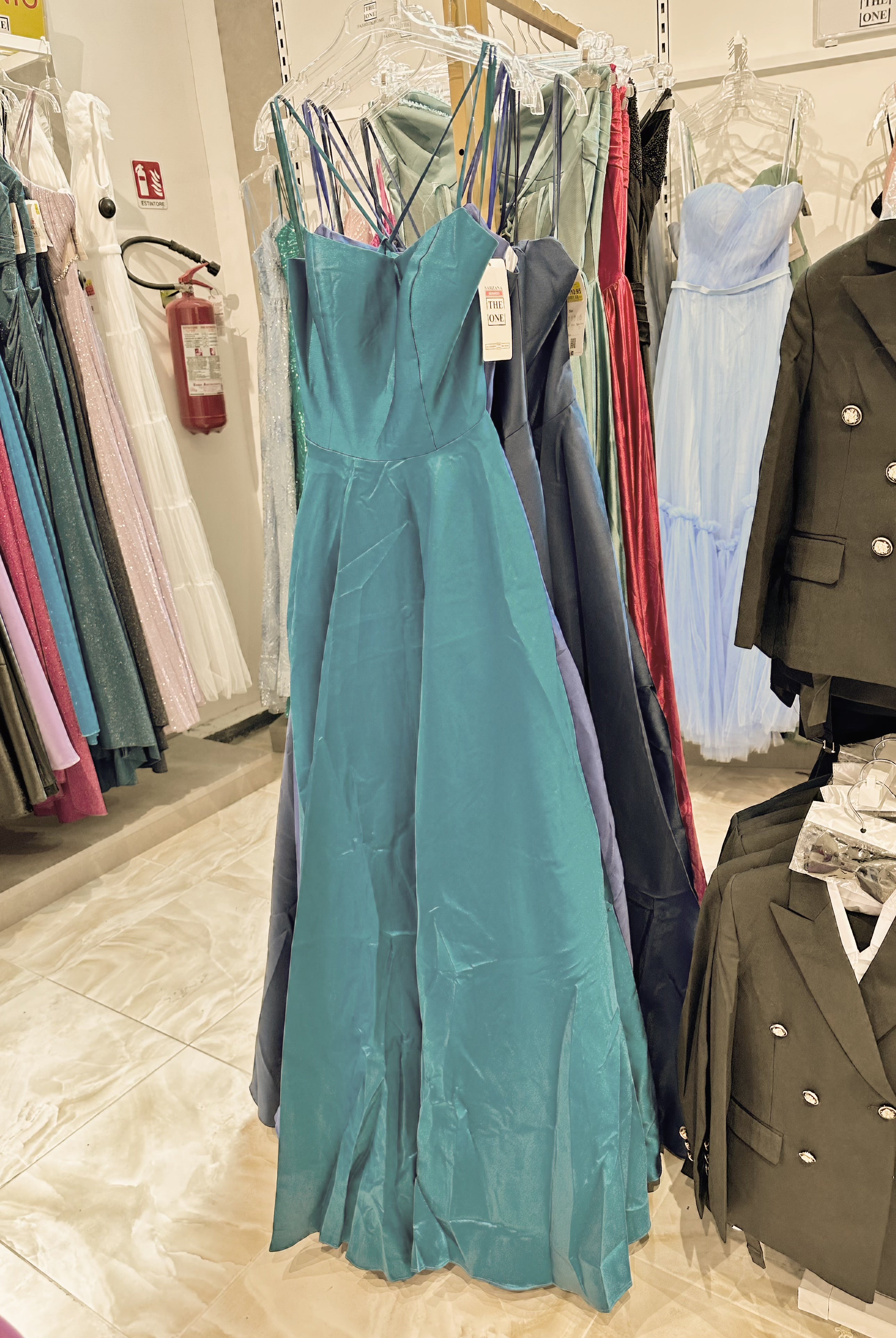 Abito lungo elegante blu royal con spalline sottili e schiena allacciata – con tasche