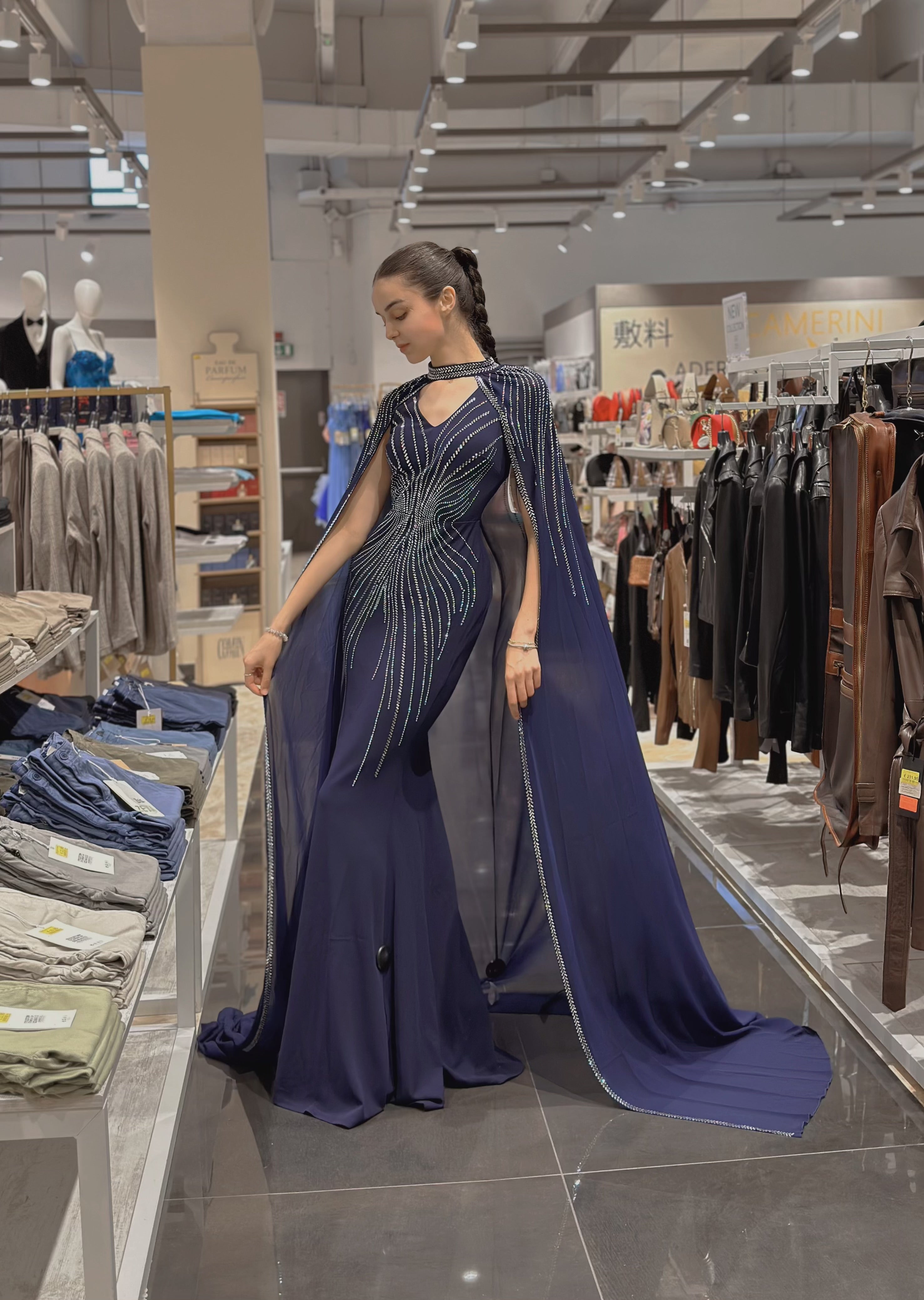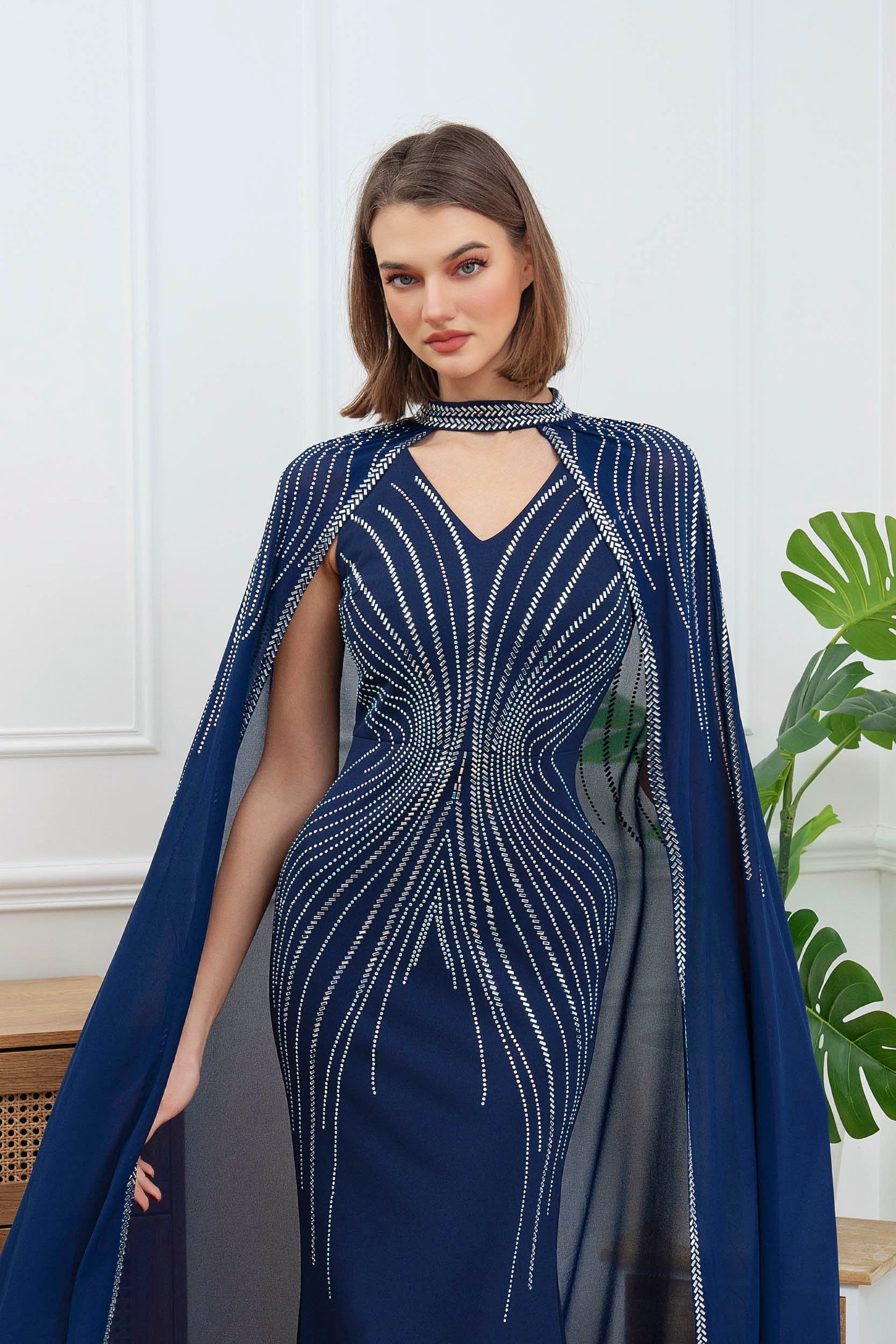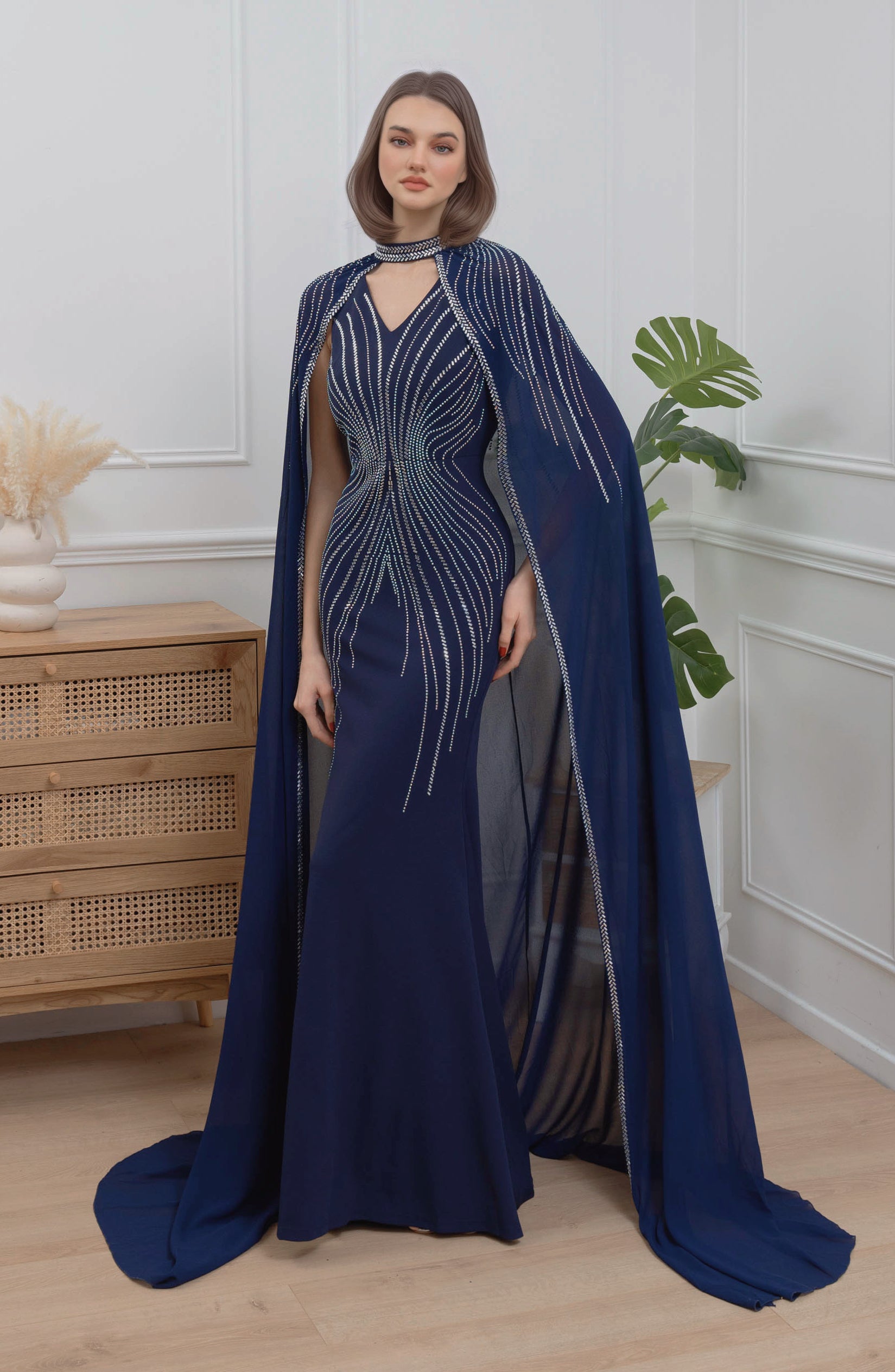 Abito blu royal con strass e mantello