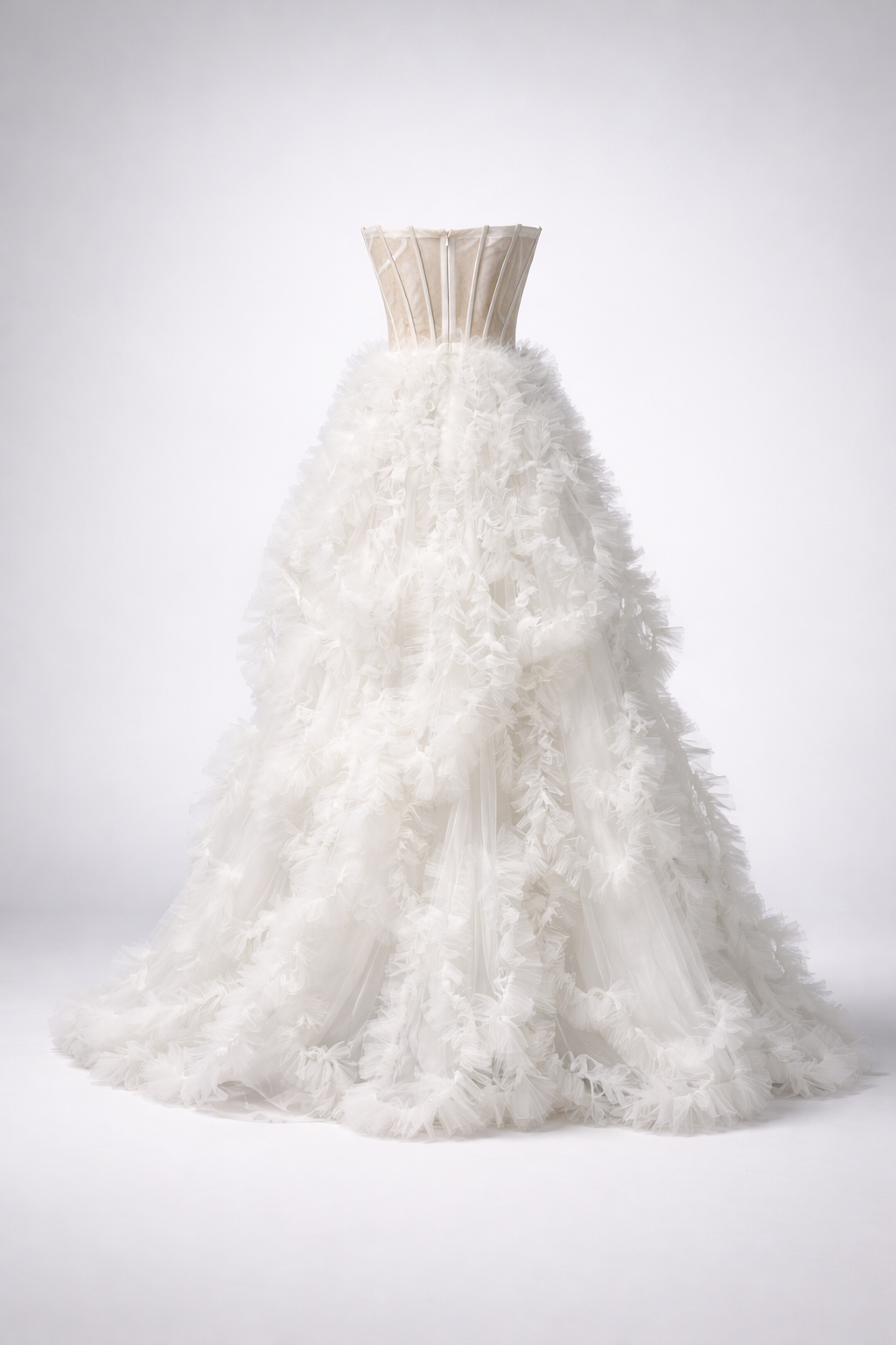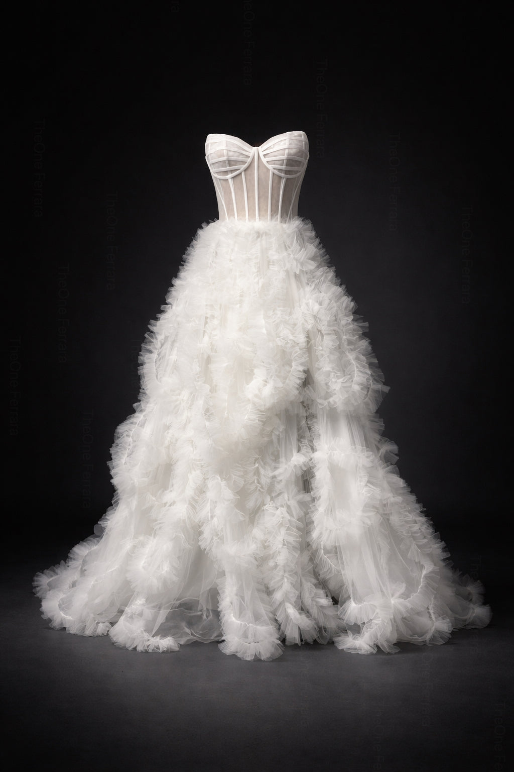 La gonna lunga in tulle voluminoso con lavorazione morbida effetto piuma crea movimento e leggerezza scenografica, donando un’allure eterea perfetta per eventi esclusivi o occasioni speciali.