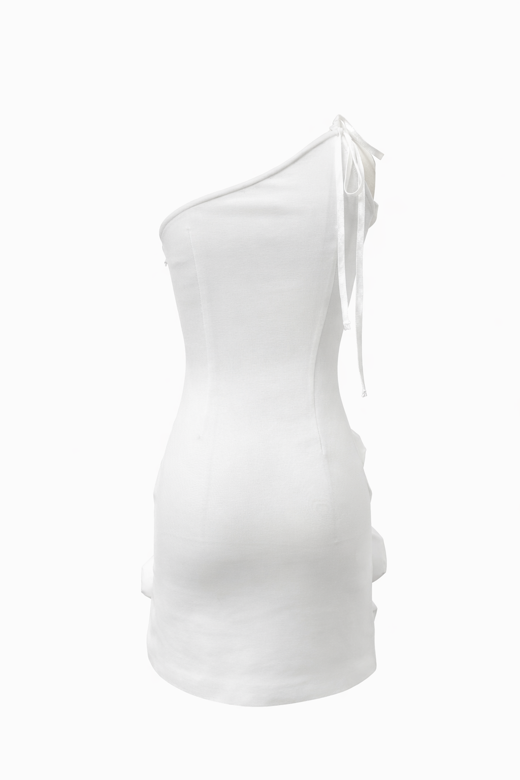 Questo abito corto bianco monospalla rappresenta l’incontro perfetto tra eleganza contemporanea e stile couture.