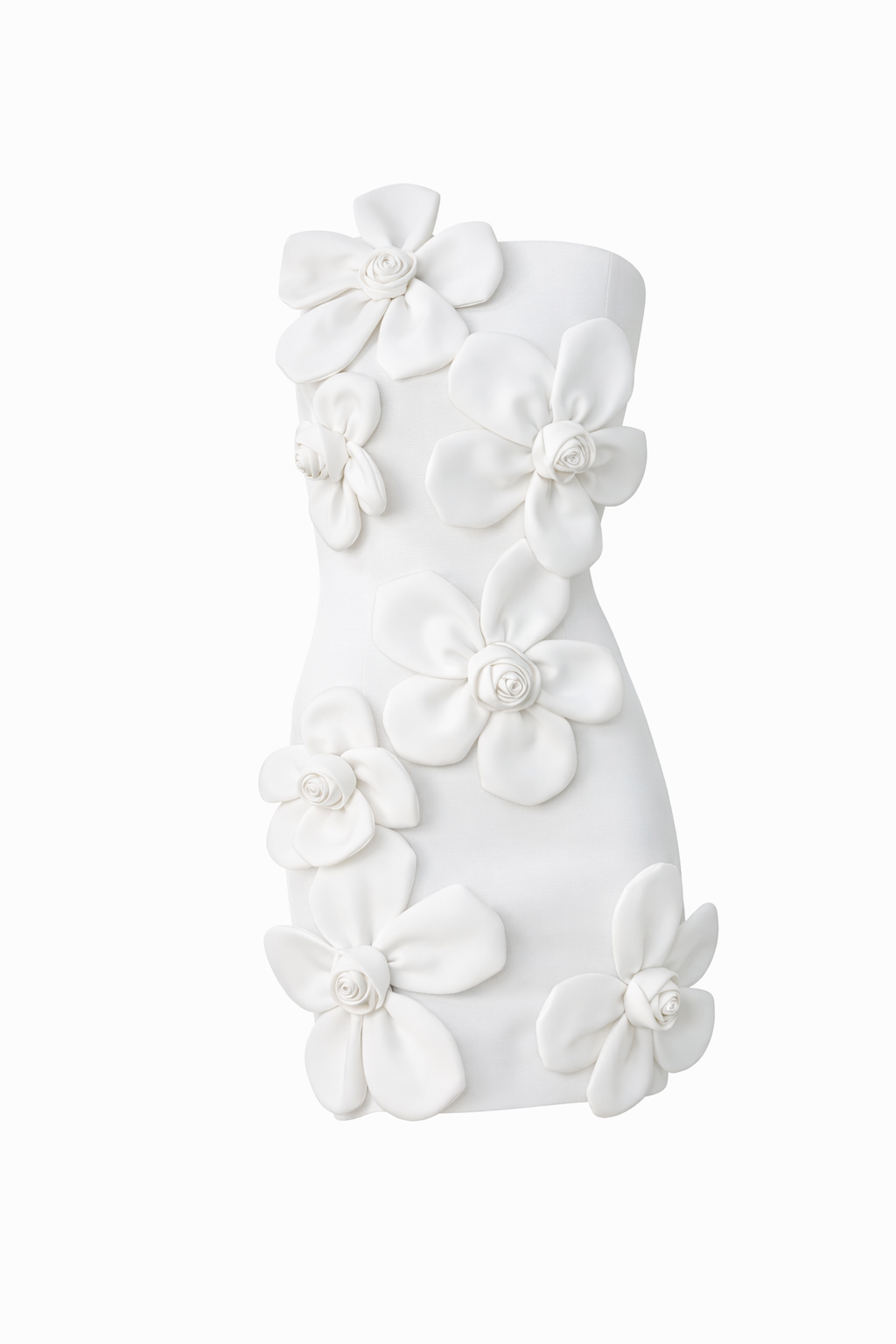 La silhouette aderente scolpisce la figura con delicatezza, mentre le applicazioni floreali 3D creano profondità visiva e un effetto artistico unico.