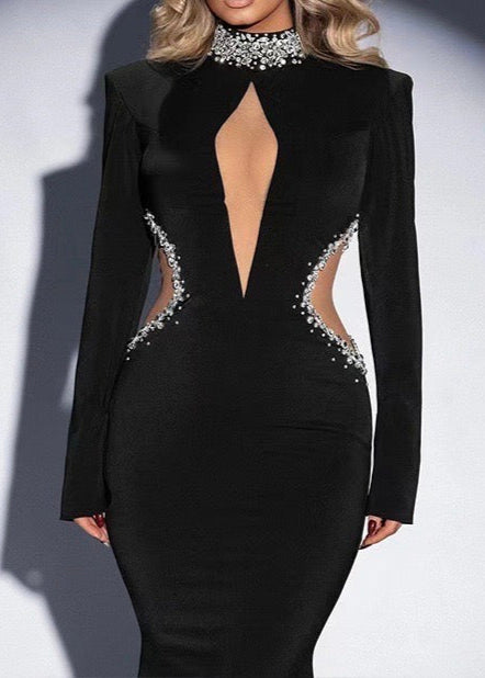 Lasciati conquistare dal fascino sofisticato di questo abito lungo nero firmato ShoppingFive. Un design ultra femminile con scollo a goccia frontale, maniche lunghe e silhouette a sirena che scolpisce e valorizza la figura. I dettagli in tulle laterali trasparenti decorati con cristalli scintillanti donano un tocco glamour e seducente, mentre il colletto alto interamente impreziosito di strass dona eleganza regale. Perfetto per eventi esclusivi, gala, red carpet o cerimonie serali.