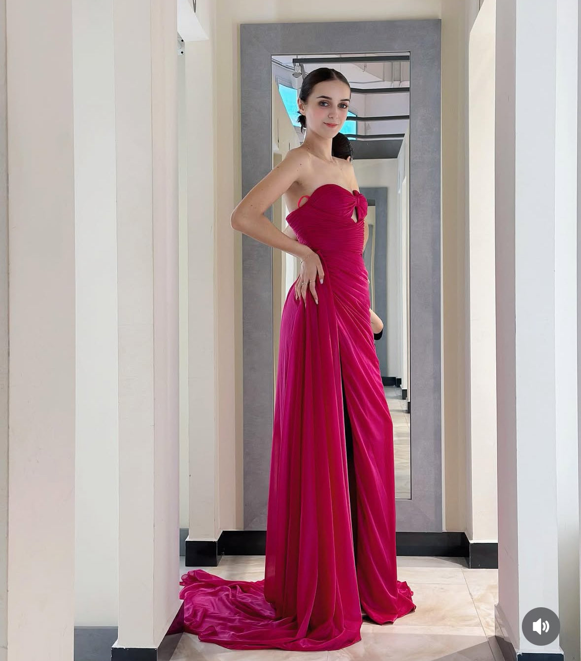 Un abito che non passa inosservato. Il rosa fucsia intenso, lo scollo a cuore con drappeggio e il maxi spacco laterale rendono questo vestito da sera l’emblema della femminilità audace. Il tessuto scivola leggero creando un movimento fluido e seducente ad ogni passo.