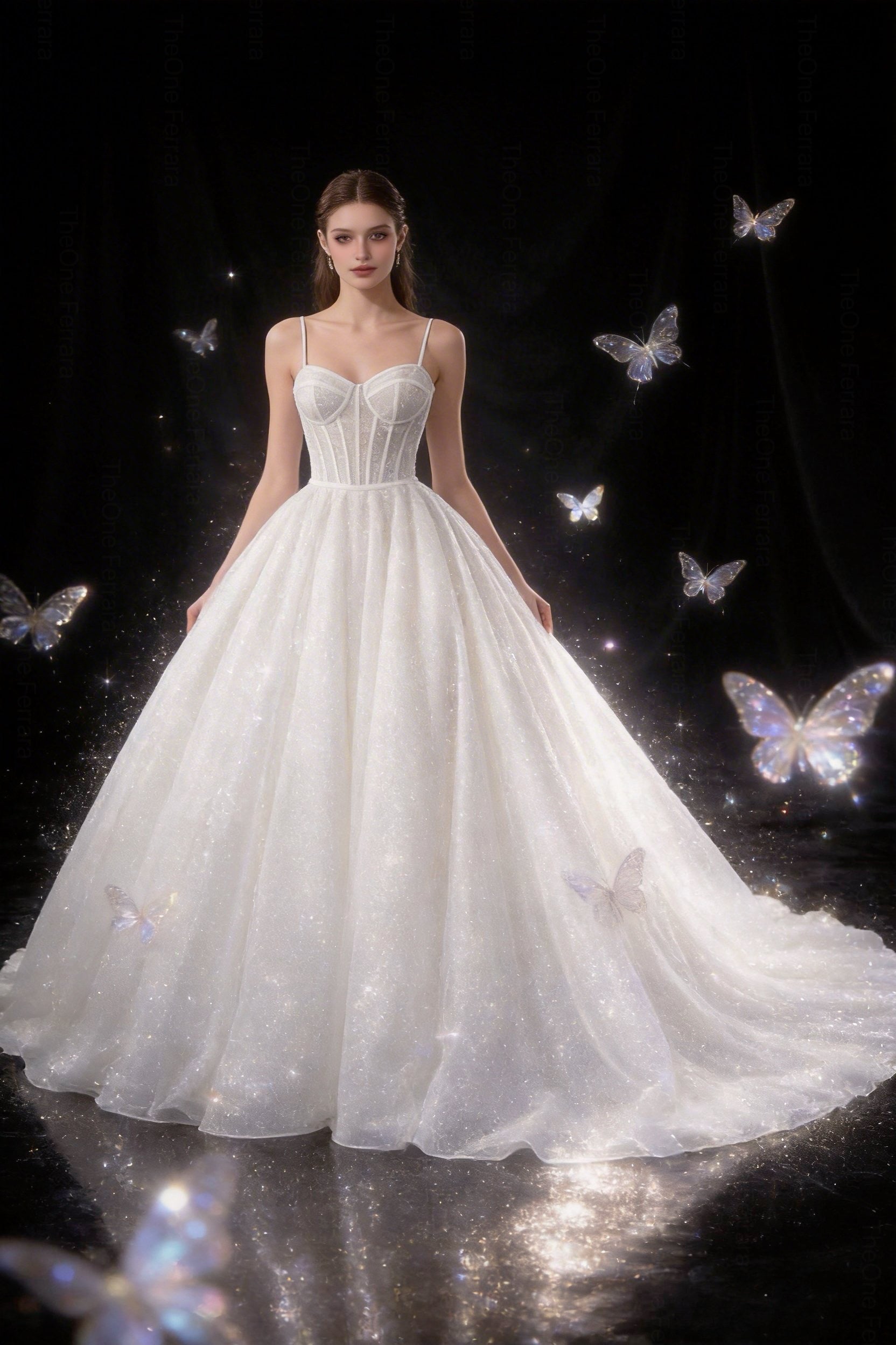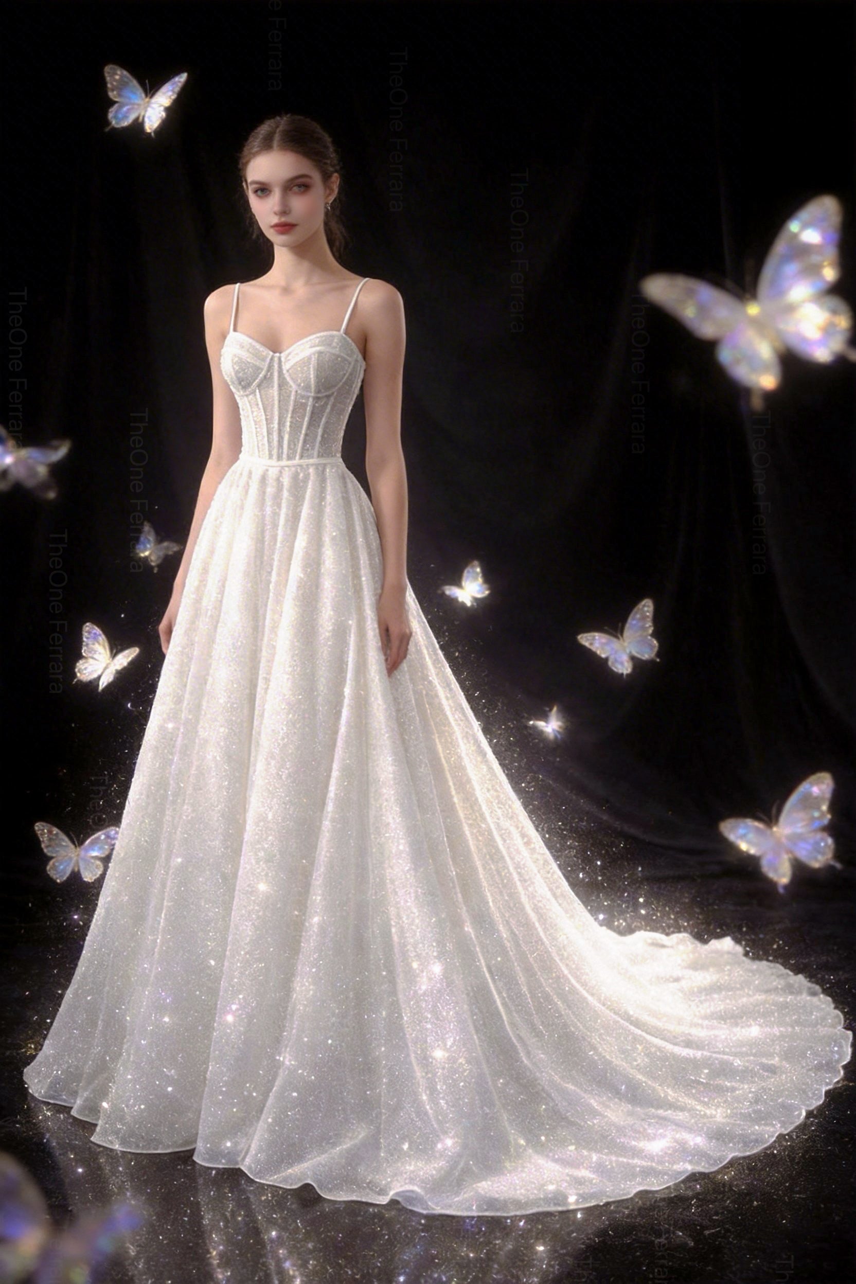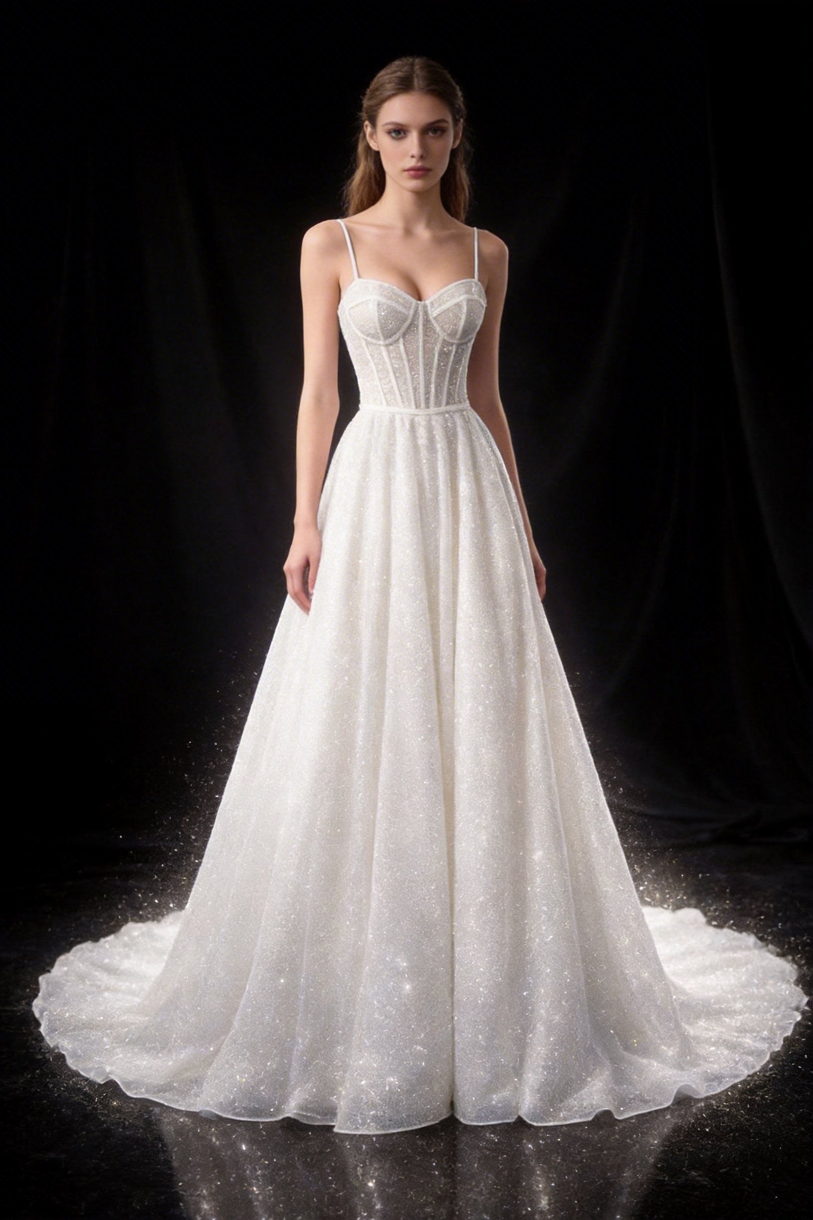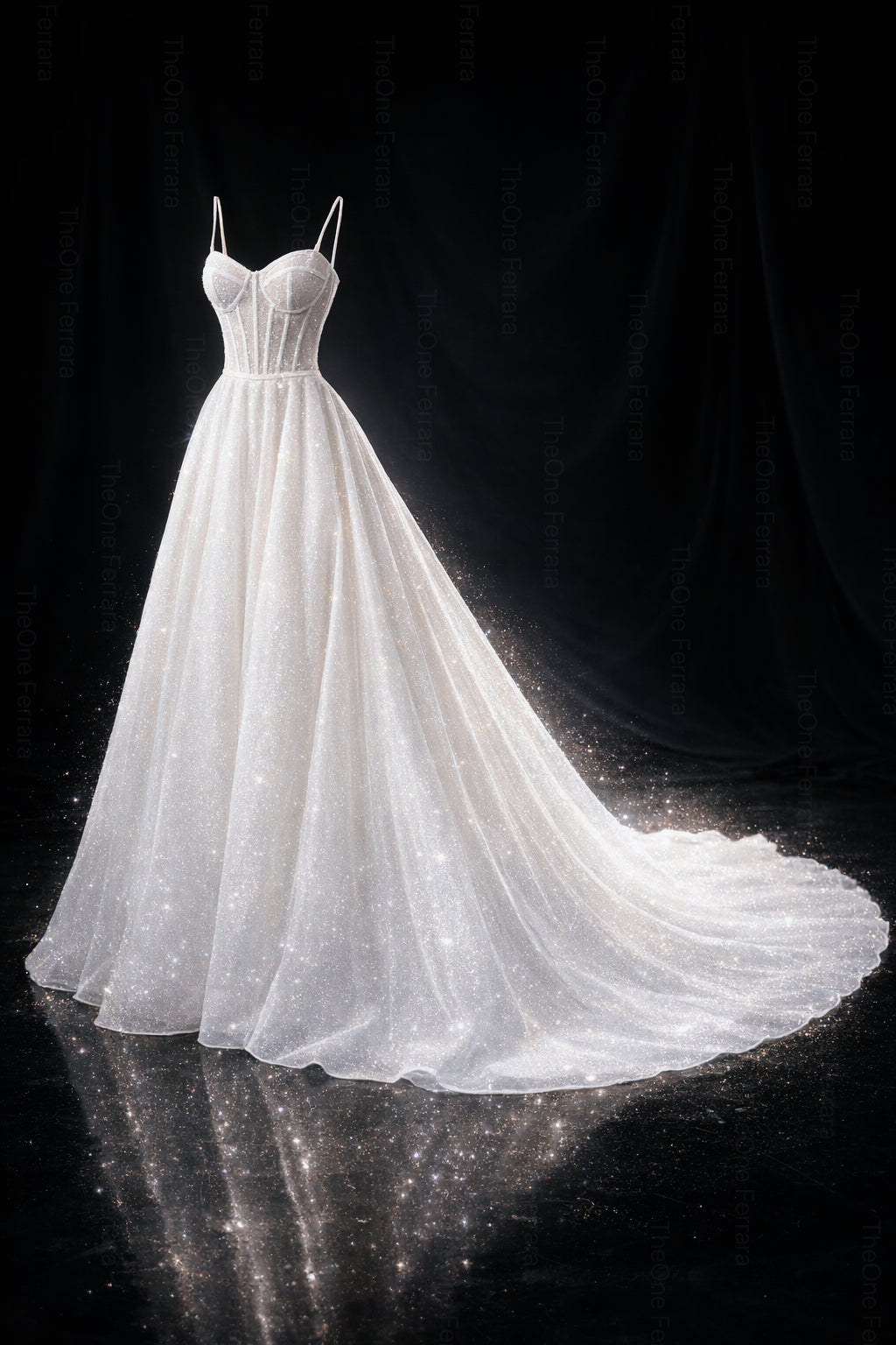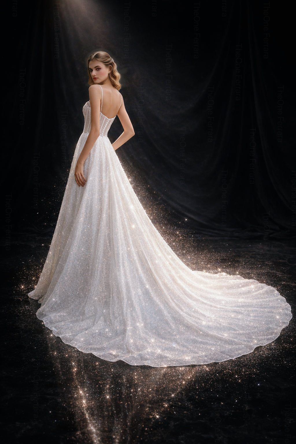 La gonna ampia in tulle glitter scende con leggerezza fino allo strascico, creando movimento e luminosità naturale. Perfetto per matrimonio in chiesa, villa o location di lusso.