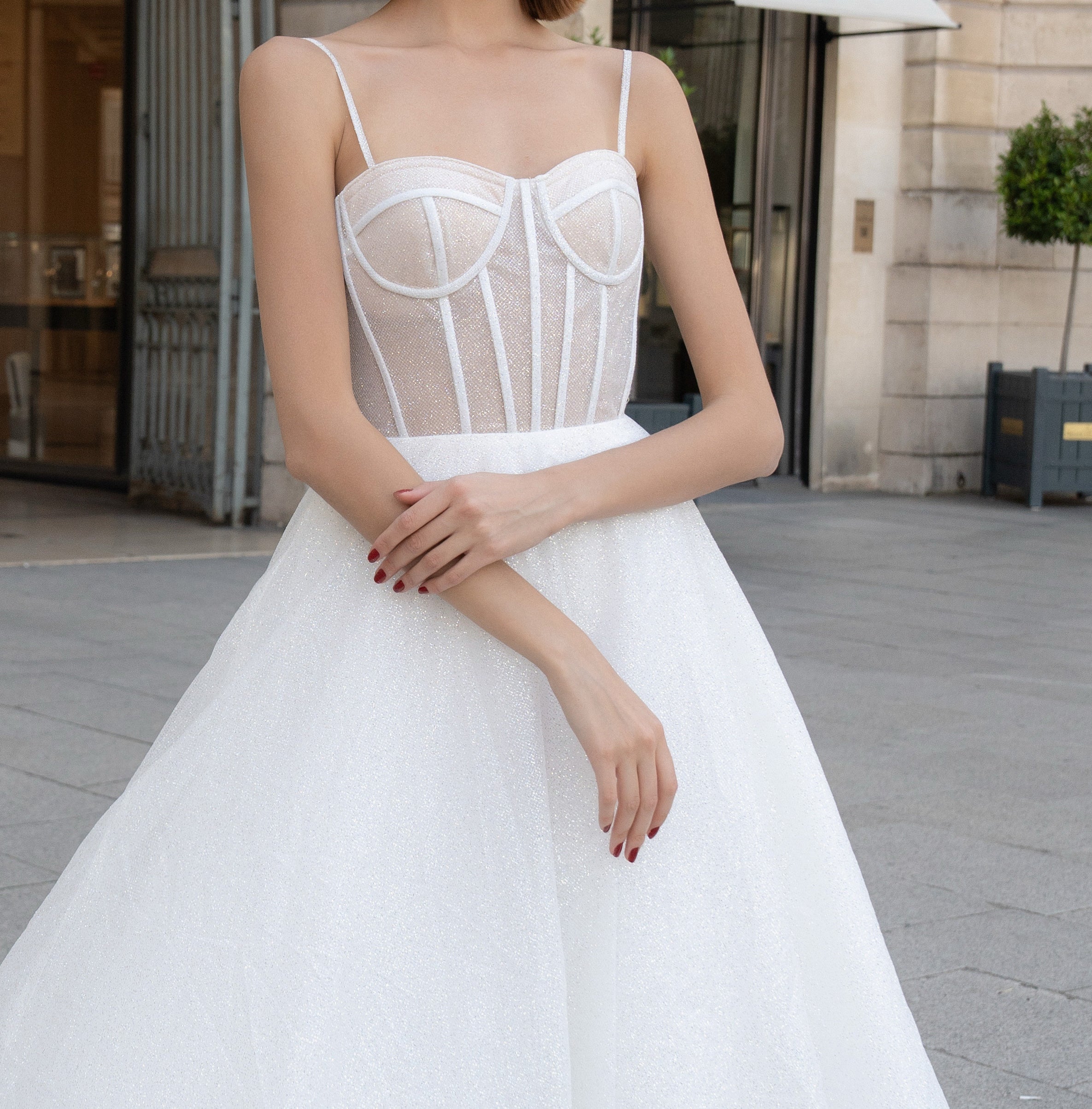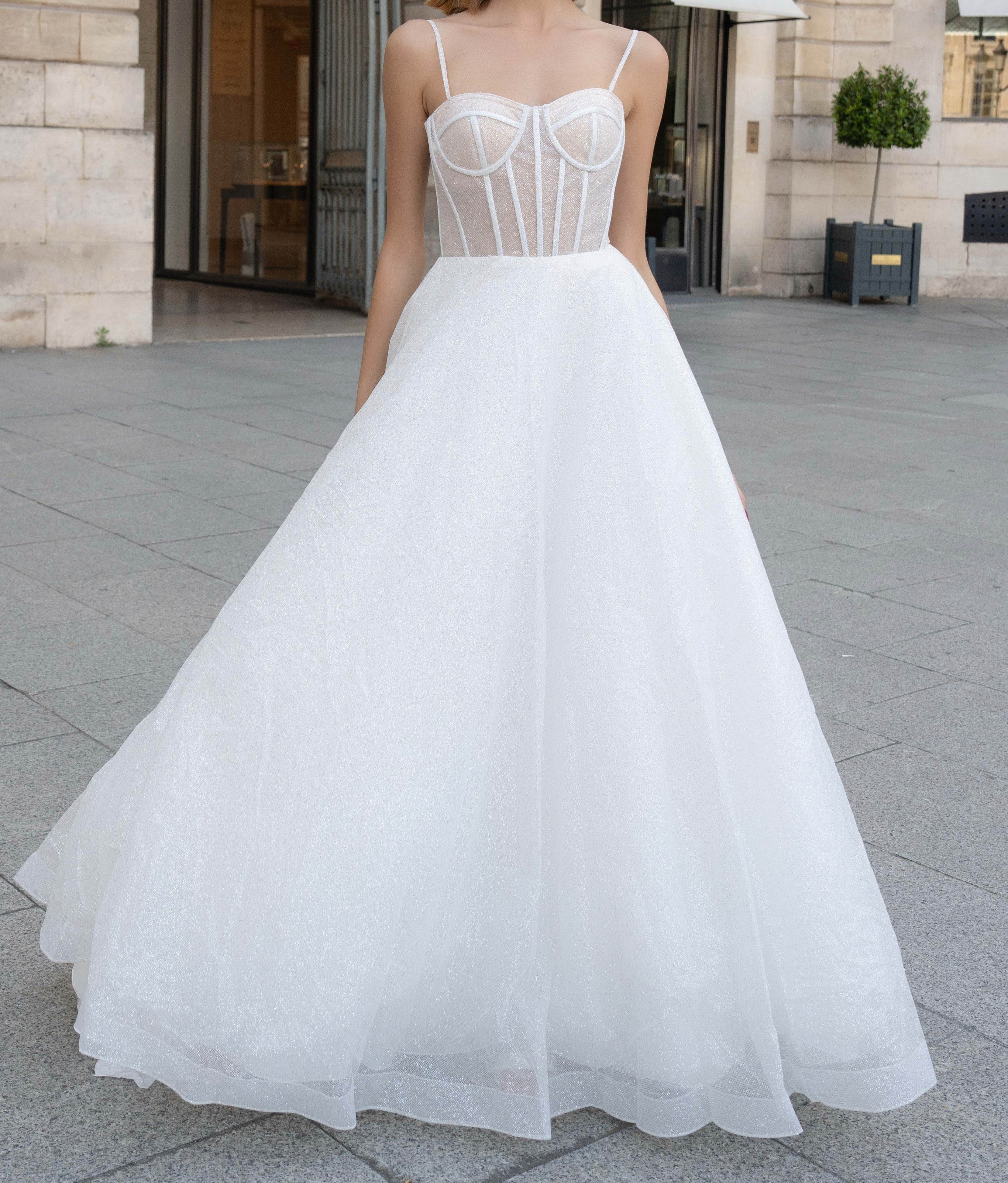 La parte del bustino presenta un sottostrato color nude sotto il tulle bianco glitterato. Questo dettaglio crea profondità visiva e un raffinato effetto trasparenza, mantenendo un look bridal sofisticato.