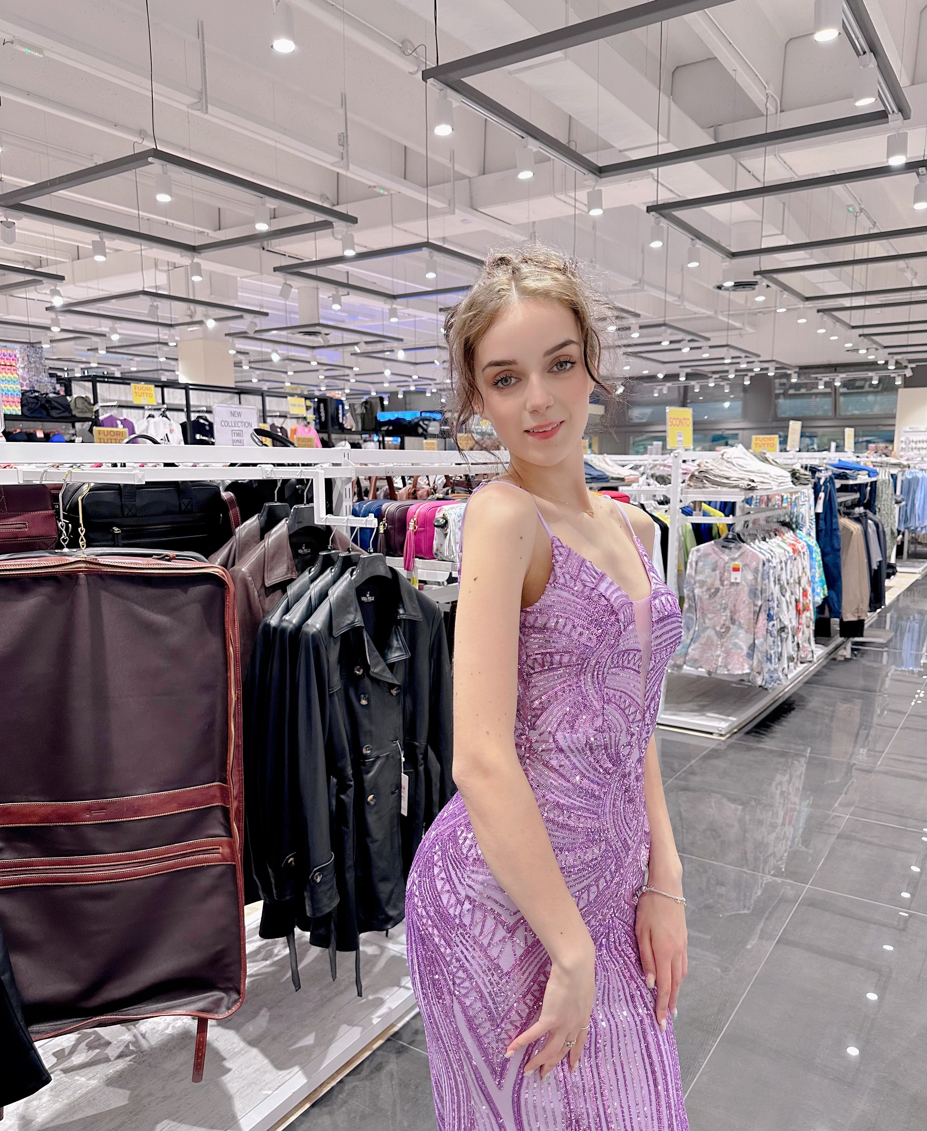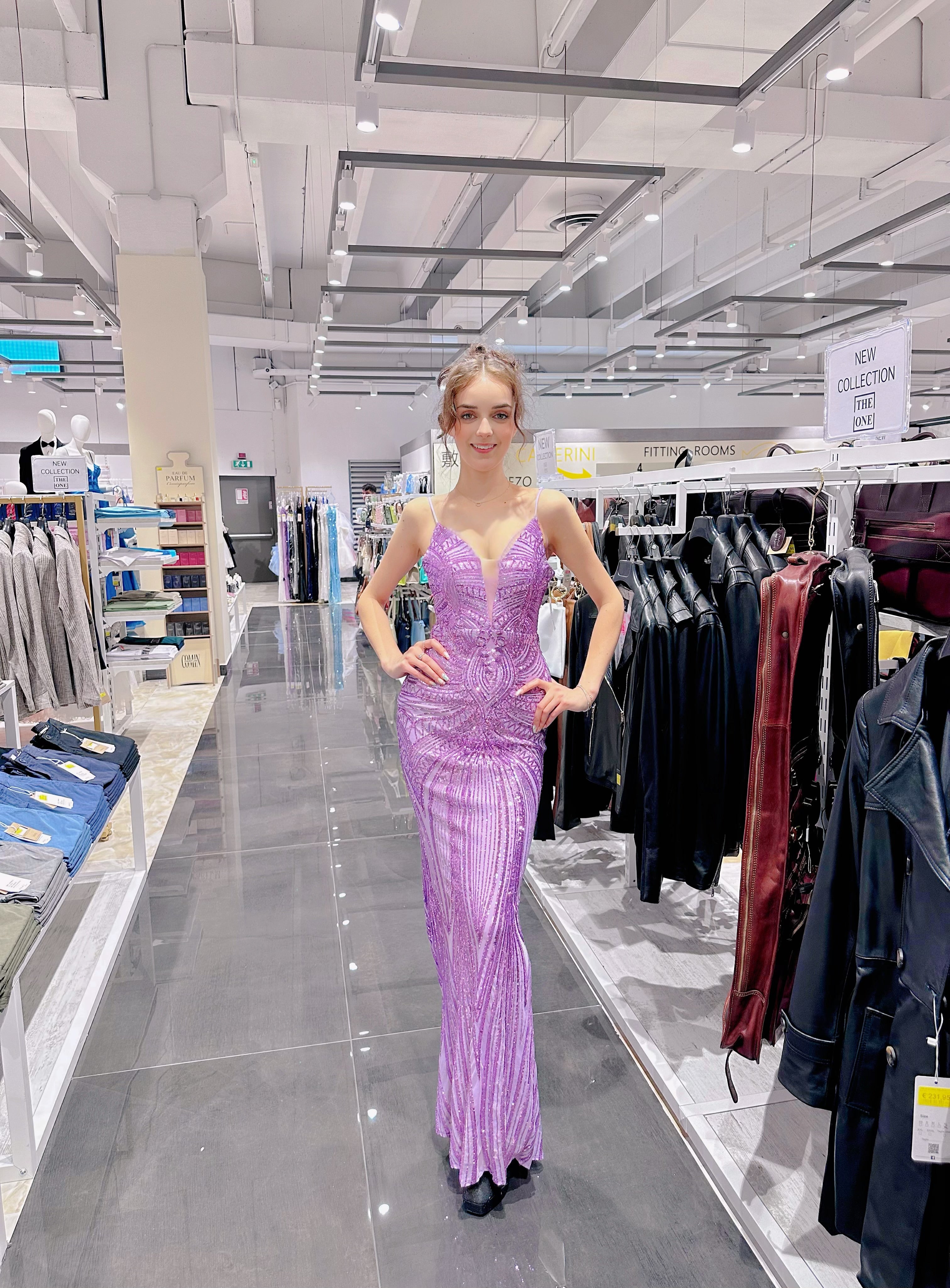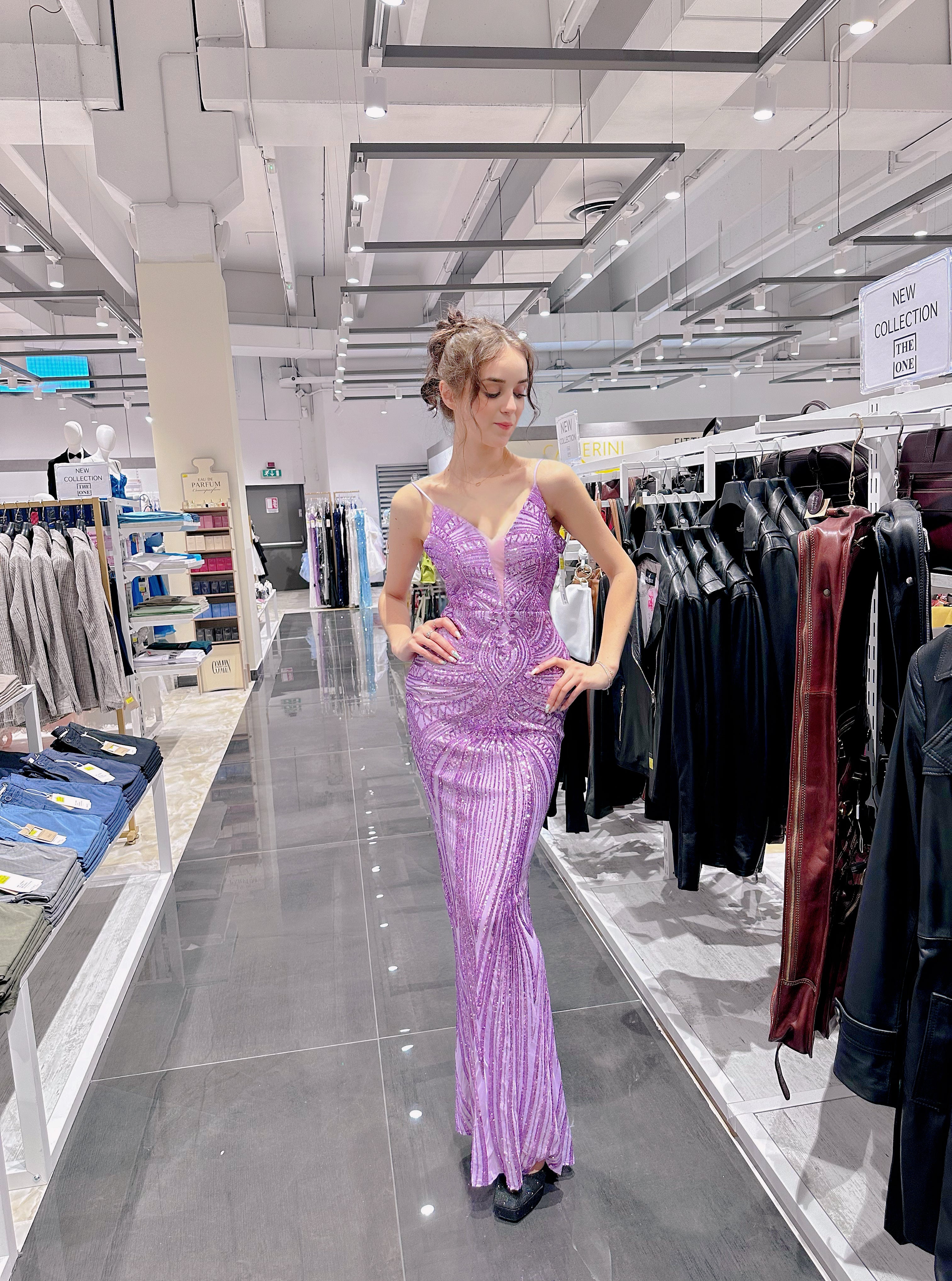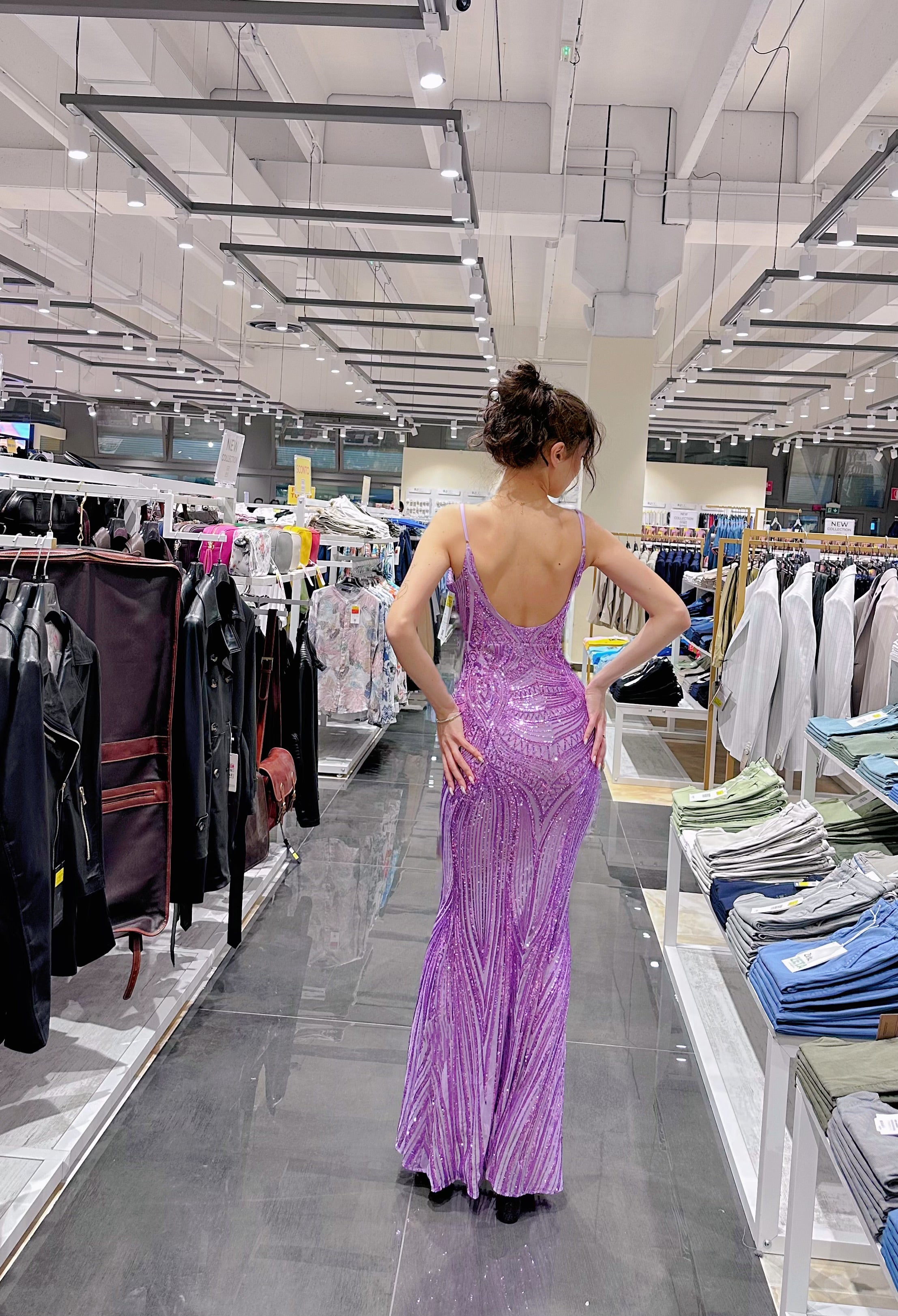Questo abito da sera lilla è un inno alla femminilità audace e sofisticata. Le spalline sottili e la profonda scollatura a V valorizzano il décolleté, mentre la schiena scoperta dona sensualità e leggerezza. L’intera superficie è ricamata con paillettes brillanti che riflettono la luce ad ogni movimento.