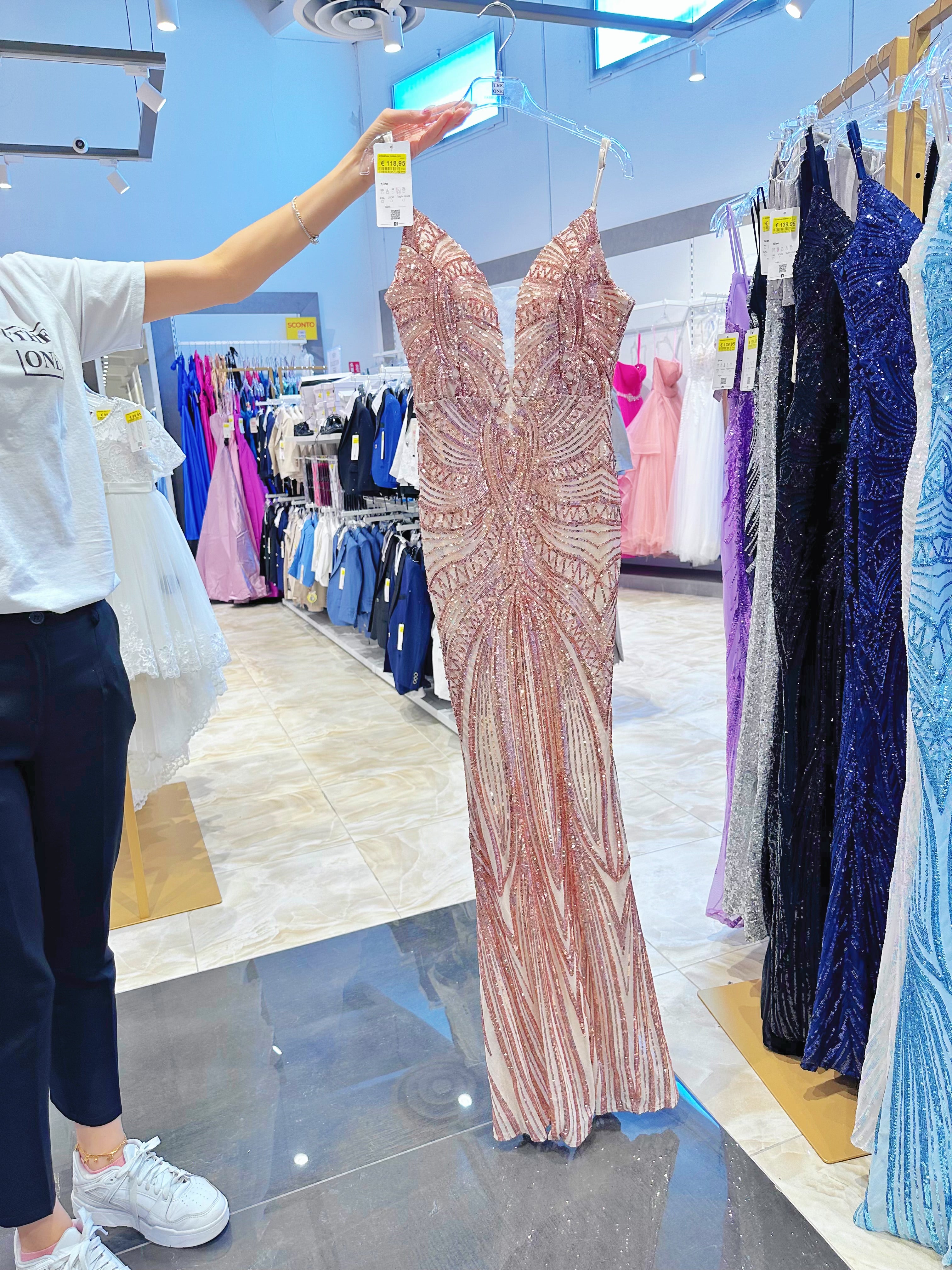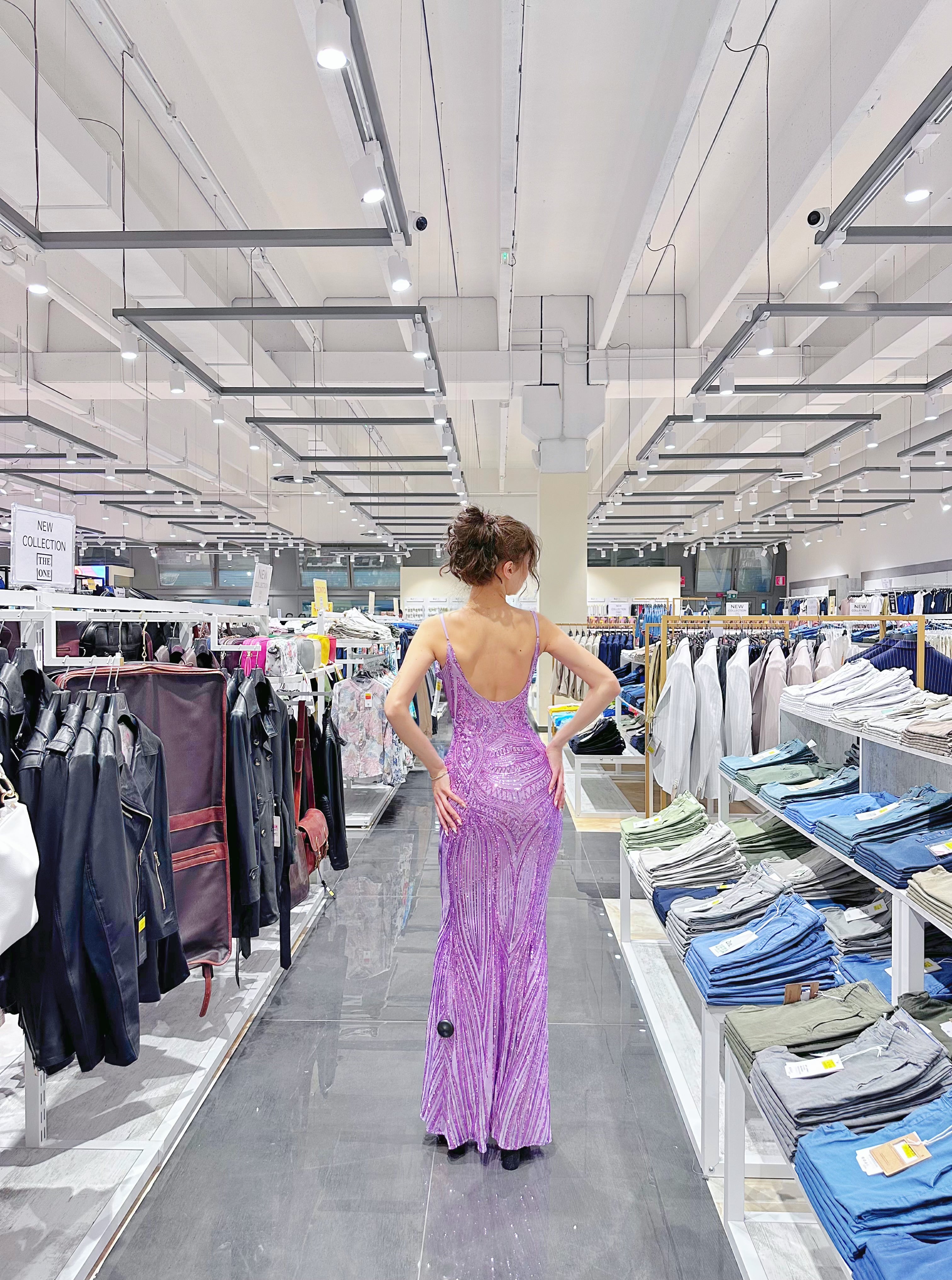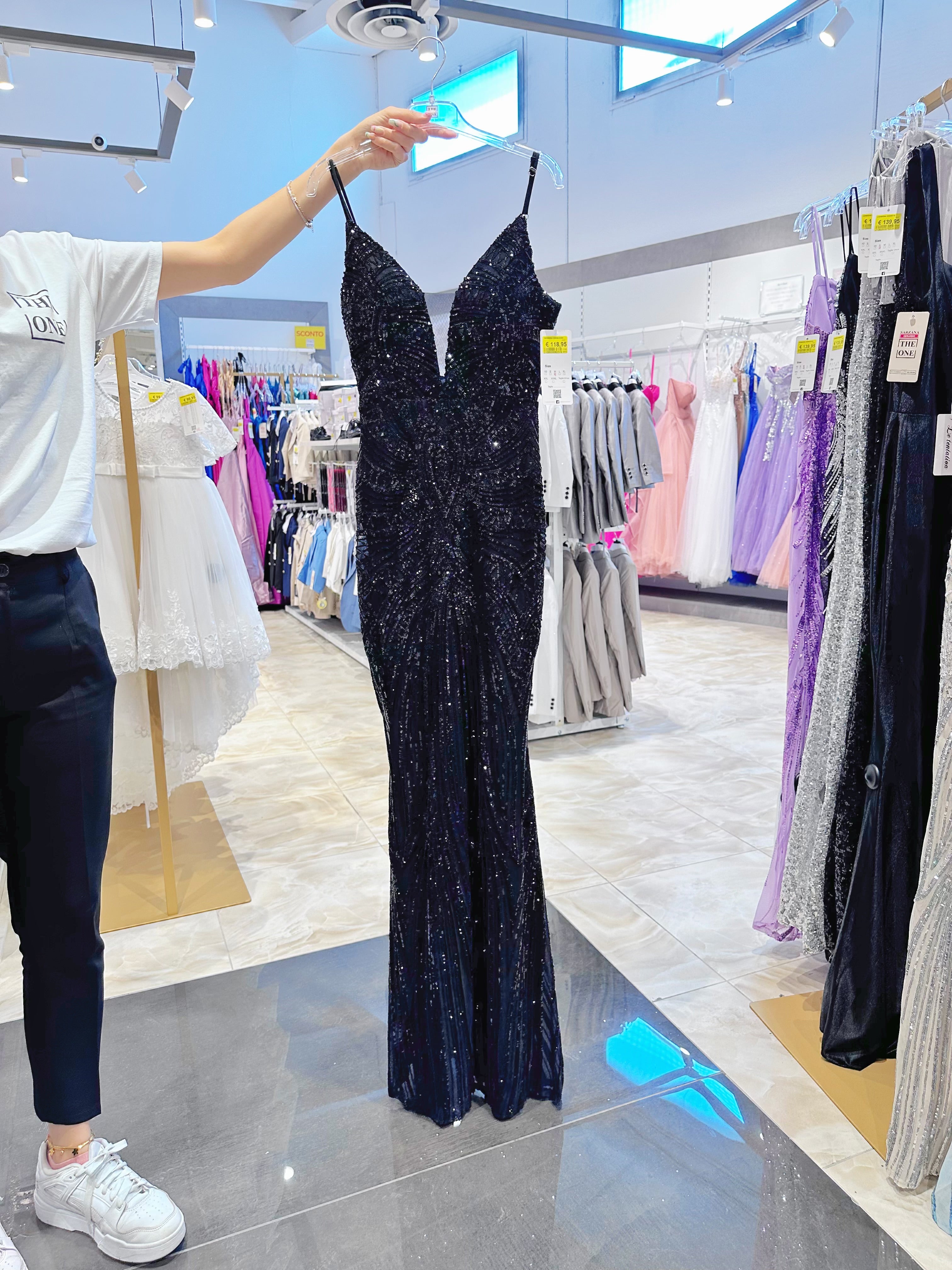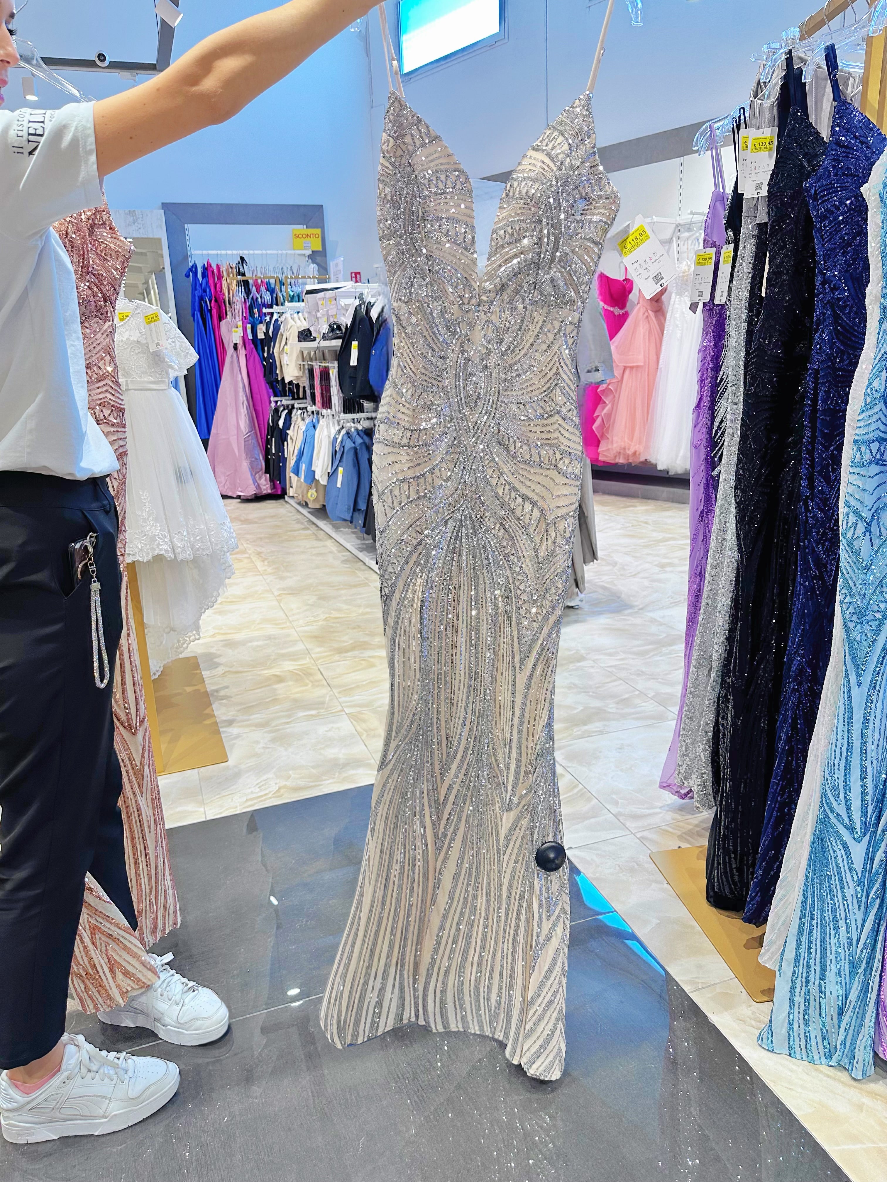 Questo abito da sera lilla è un inno alla femminilità audace e sofisticata. Le spalline sottili e la profonda scollatura a V valorizzano il décolleté, mentre la schiena scoperta dona sensualità e leggerezza. L’intera superficie è ricamata con paillettes brillanti che riflettono la luce ad ogni movimento.