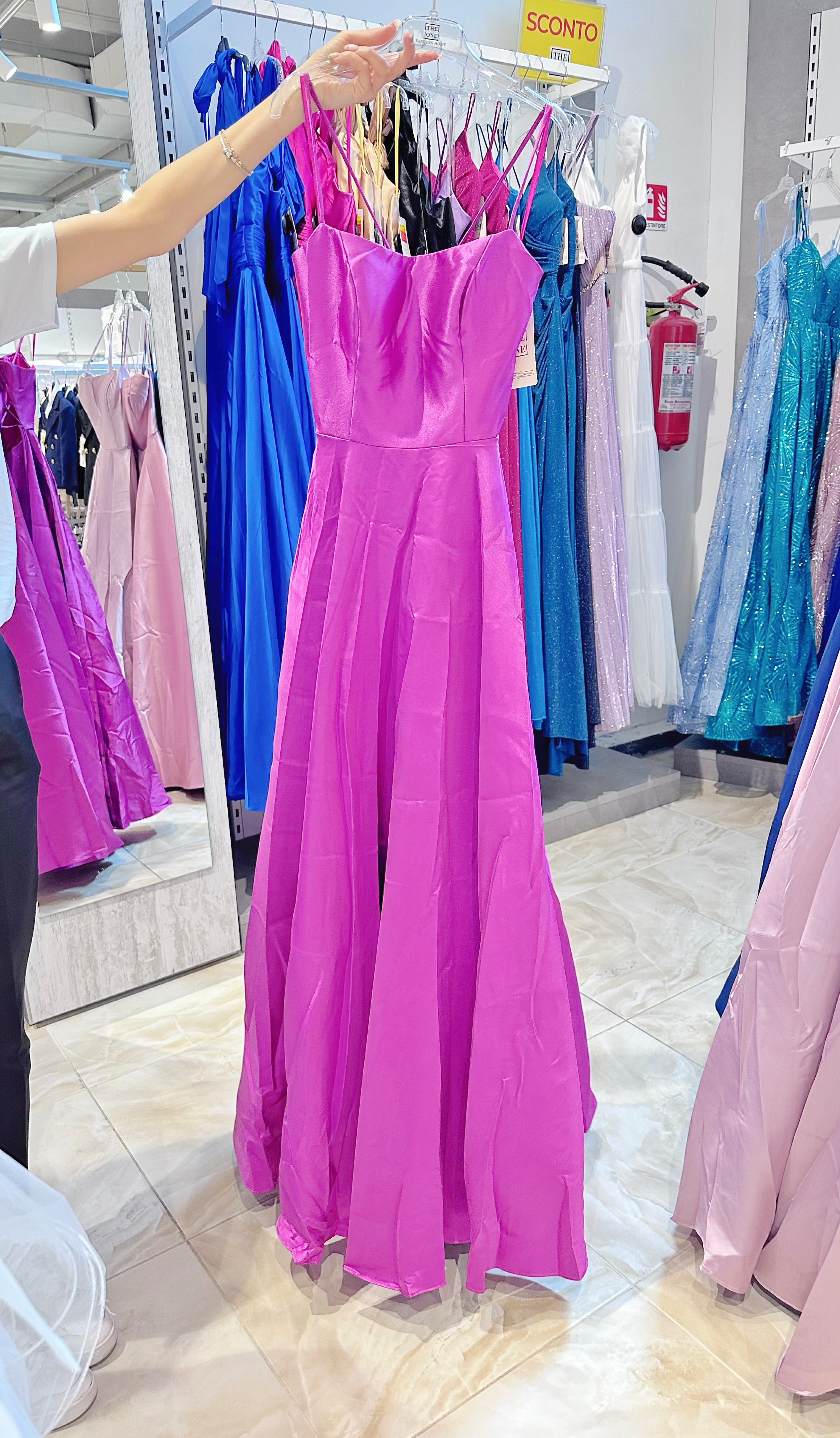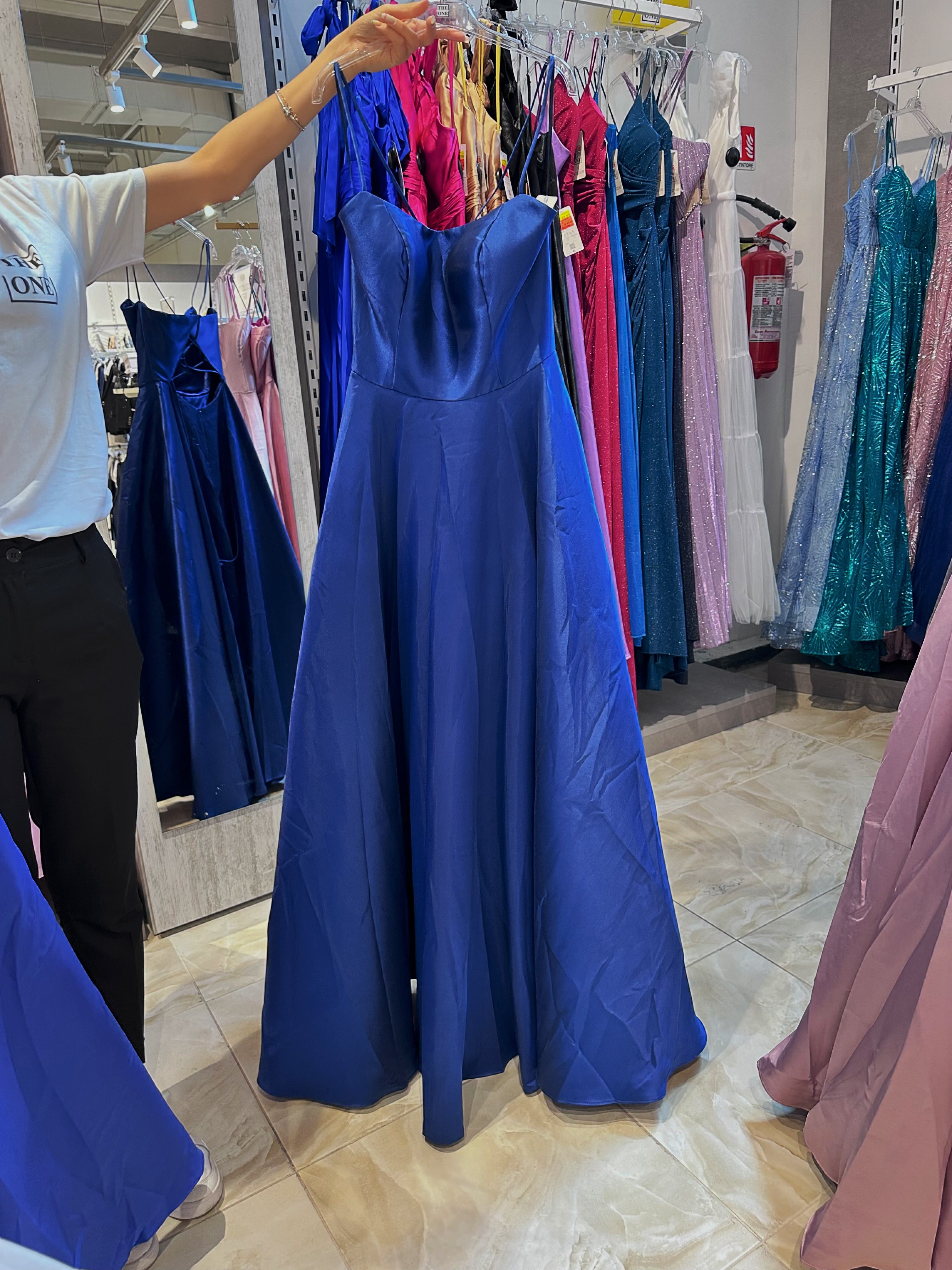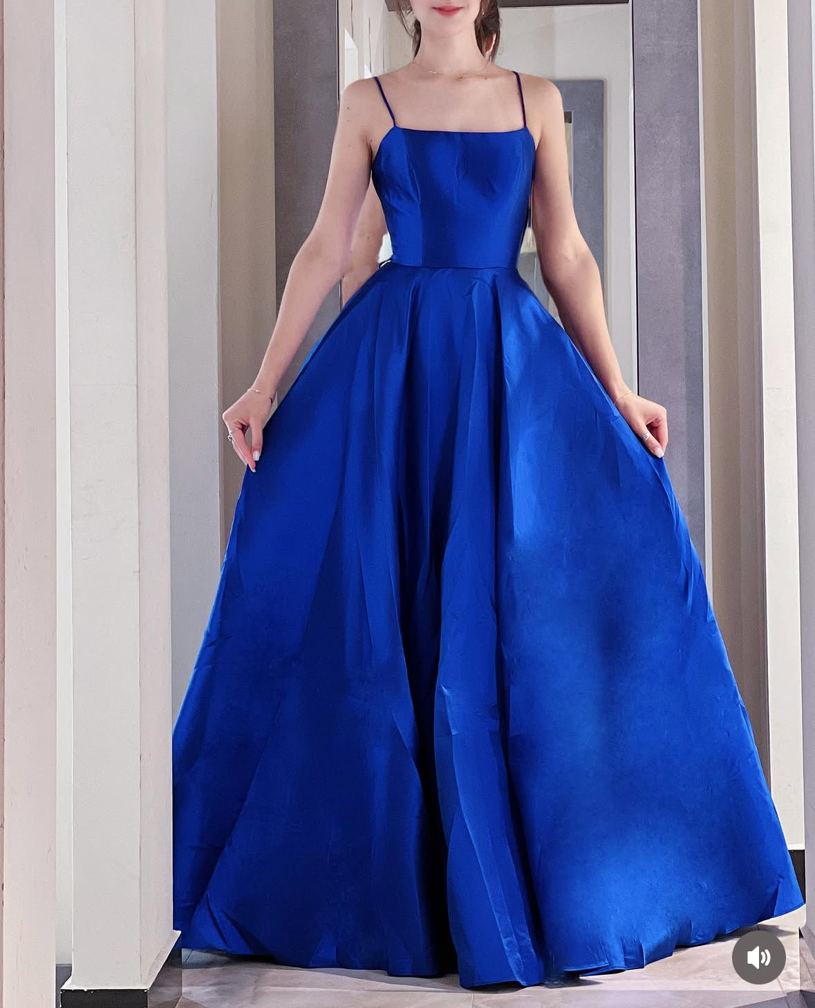 Lasciati conquistare dal fascino senza tempo di questo abito da sera in blu royal. Realizzato in tessuto satinato luminoso, il design minimal con spalline sottili si fonde con l’eleganza voluminosa della gonna a pieghe e una schiena incrociata regolabile. Il dettaglio segreto? Tasche laterali invisibili: praticità e stile in un solo gesto.