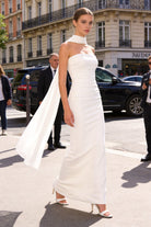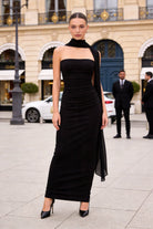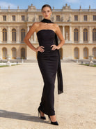 Il design tubino aderente scolpisce la silhouette con linee pulite, mentre la sciarpa integrata avvolge il collo creando un effetto fluido e distintivo.