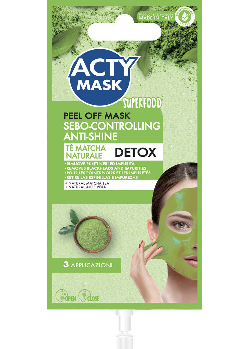 ACTY MASK Maschera viso Peel Off Detox, con Tè Matcha Naturale e Aloe Vera, rimuove le impurità e i punti neri dal viso. Regolarizza la secrezione sebacea, elimina e previene la lucidità del viso durante il giorno e lascia la pelle pulita e fresca.