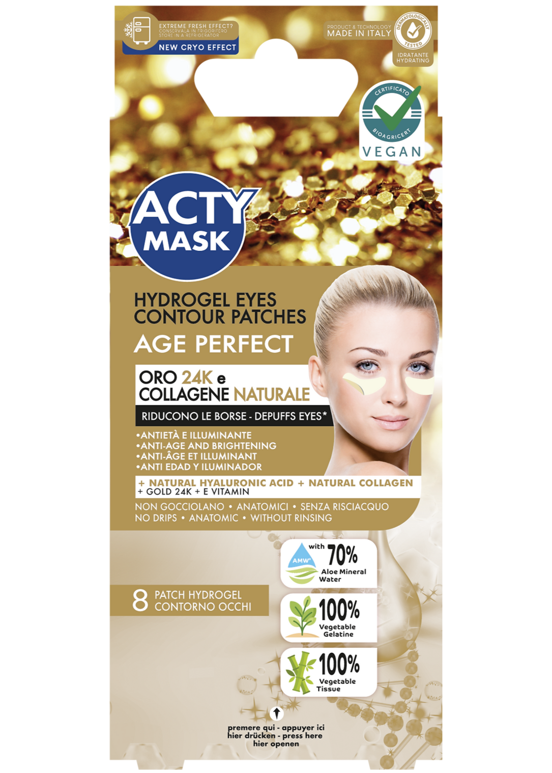 Un prodotto innovativo per un trattamento decongestionante antiage e illuminante, realizzato con tecnologia DermoScience Cryo Effect, uno speciale Hydrogel contenente un concentrato di principi attivi in grado di donare tono e idratazione al contorno occhi. Gli attivi contenuti conferiscono un’azione multipla: l’Oro 24K che conferisce luminosità alla pelle, l’Acido Ialuronico, con tre differenti pesi molecolari, crea un film idratante in grado di preservare l’elasticità della pelle; il Collagene, dall’effetto lifting, mantiene la pelle giovane e compatta; la Vitamina E, dall’effetto antiossidante, preserva la pelle dall’invecchiamento cutaneo. Lo speciale supporto microperforato permette la traspirazione e lo scambio termico cutaneo, amplificando l’effetto cryo del gel. Senza necessità di risciacquo, pratici e facili da usare, grazie alla forma anatomica. Il loro speciale supporto in Bambù compostabile favorisce un’adeguata traspirazione cutanea.
