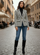 Lasciati conquistare da questa splendida giacca blazer donna in tweed a quadri, ispirata al classico stile Chanel. Un capo senza tempo che unisce l'eleganza francese alla versatilità italiana, perfetto per la donna moderna che ama distinguersi con classe.