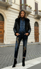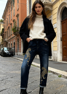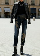 Questi jeans non sono solo un capo d'abbigliamento, sono un pezzo statement che trasforma qualsiasi outfit. Le applicazioni artigianali in strass dorati richiedono ore di lavoro manuale, rendendo ogni paio unico e prezioso.