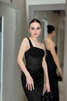 Abito elegante nero monospalla in pizzo collezione esclusiva theone ferrara abito da sera italiano 14302
