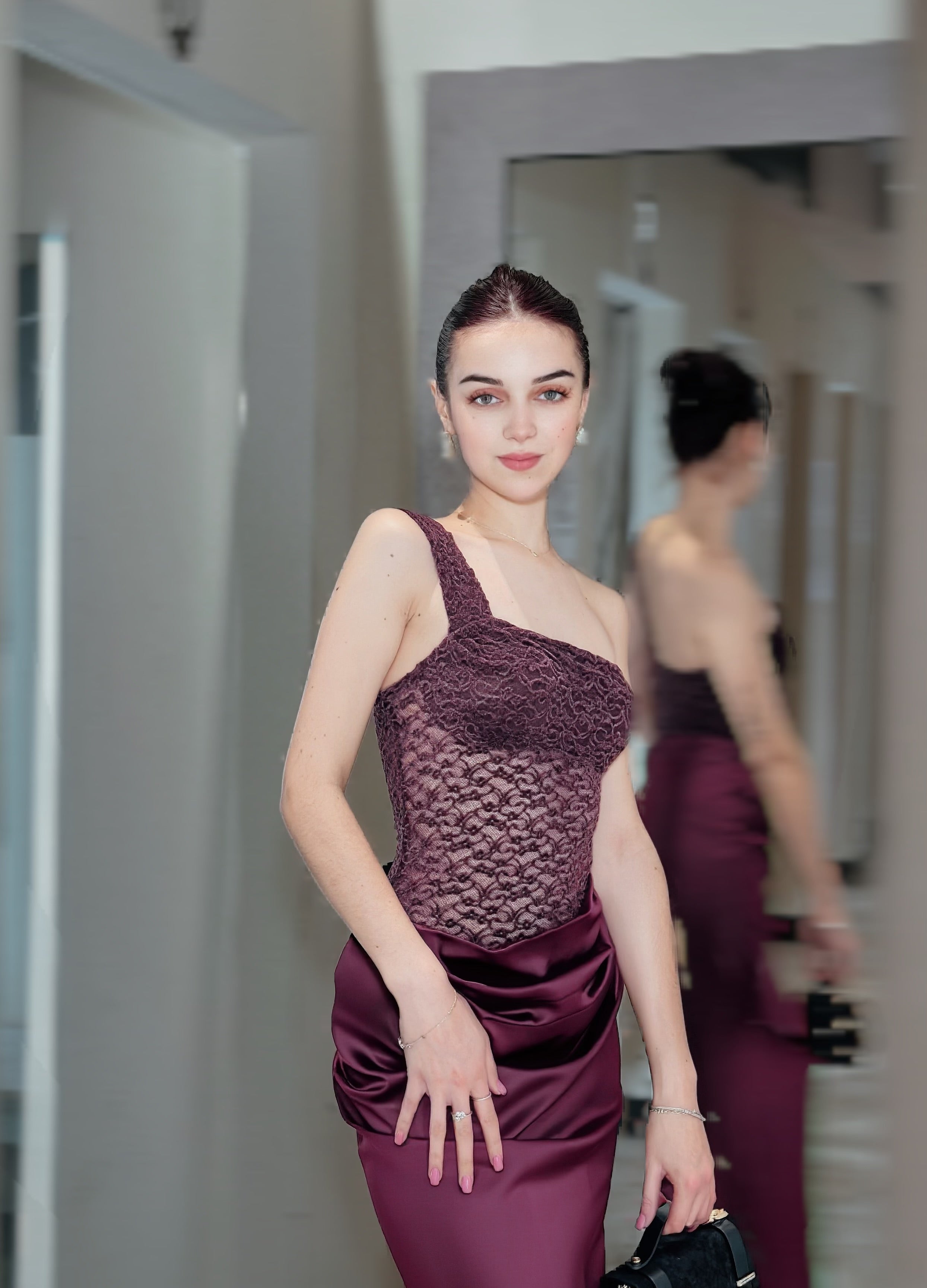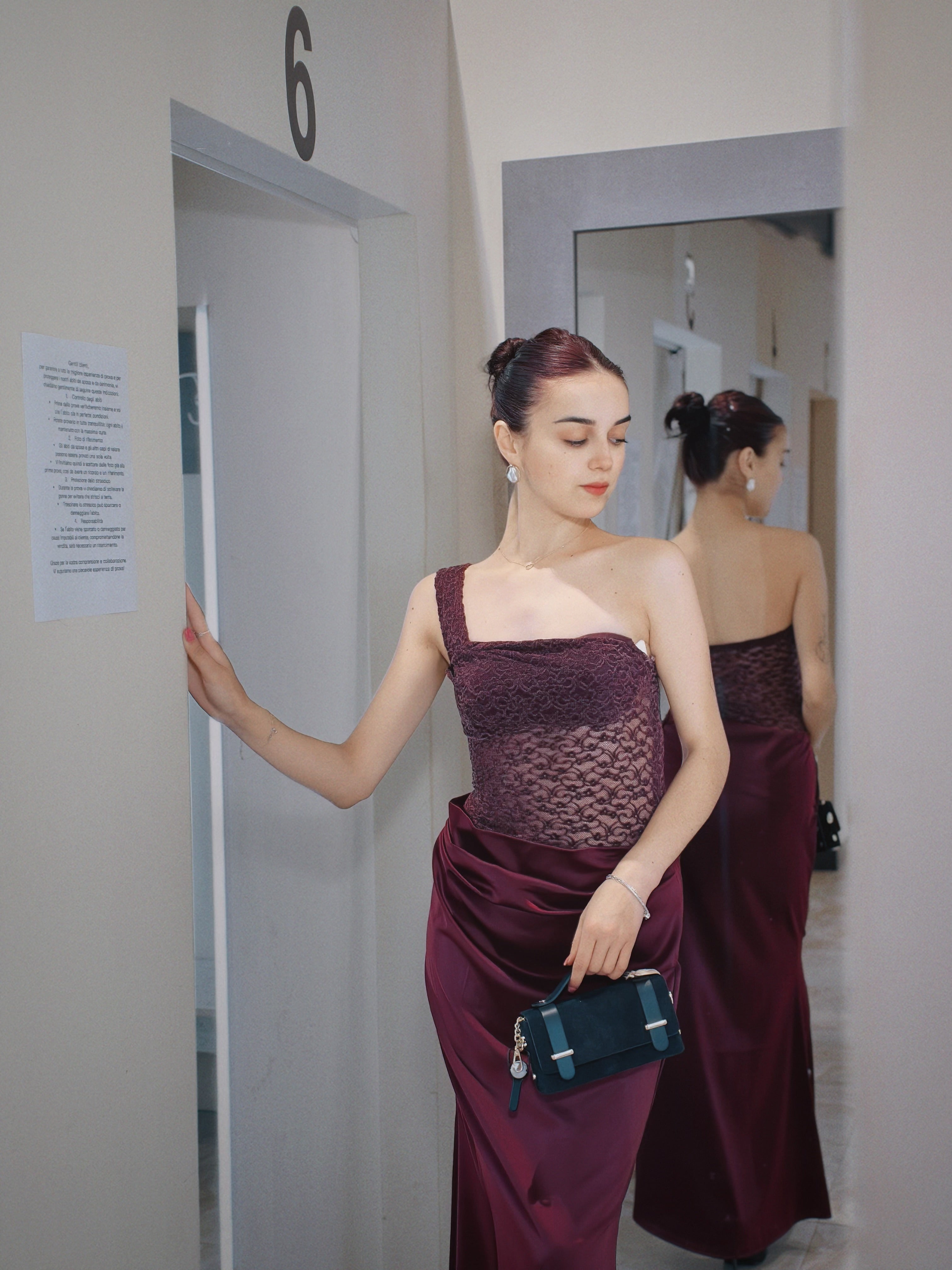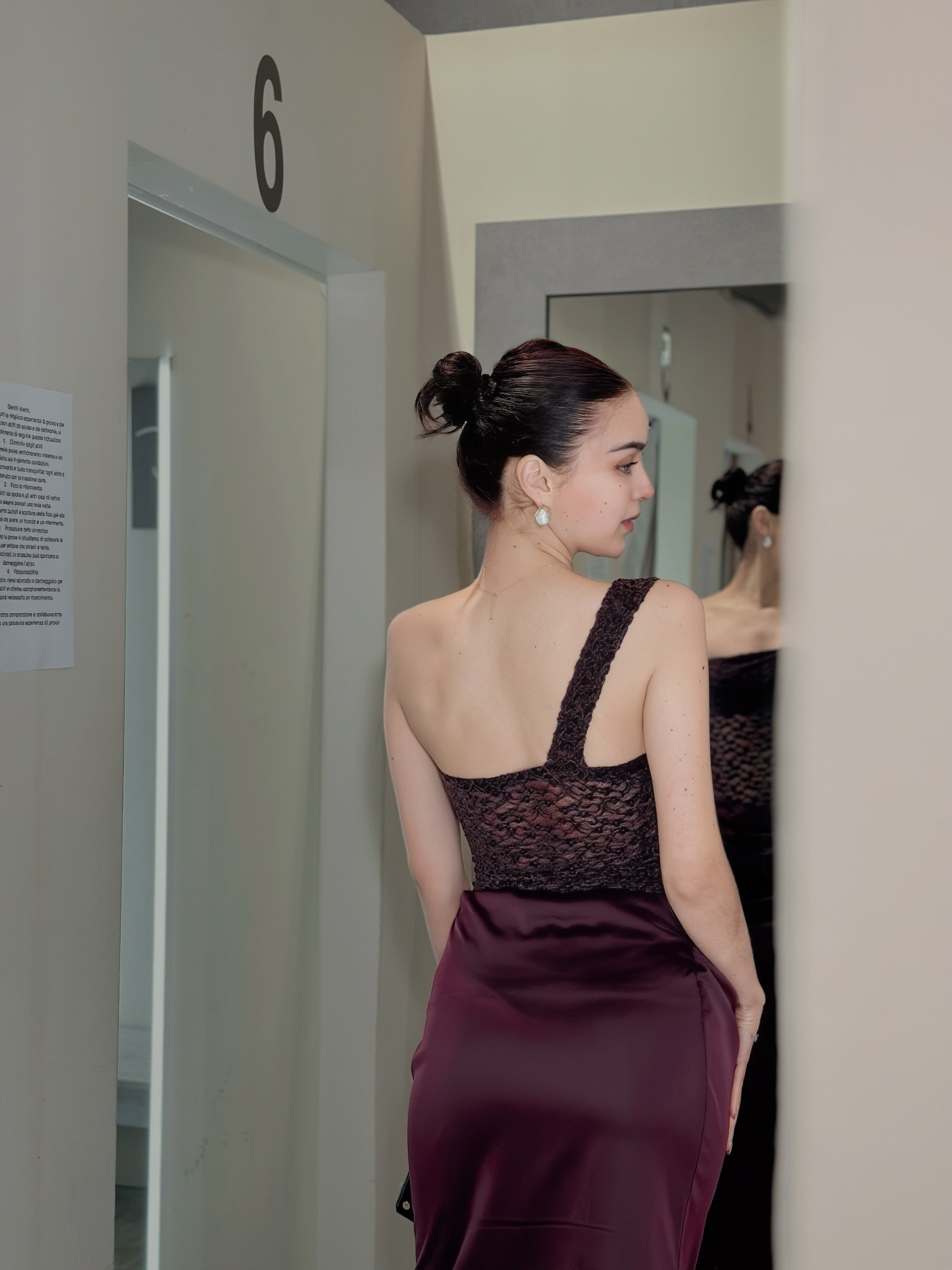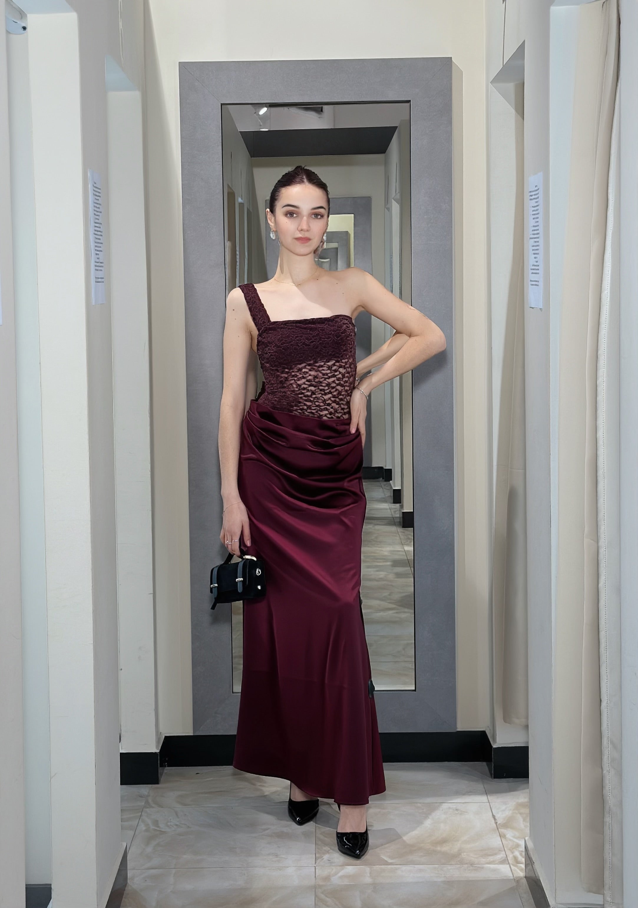 Il corpino in pizzo lavorato definisce la forma con raffinatezza, mentre la gonna in raso setoso cattura la luce a ogni passo, creando un movimento naturale e armonioso.