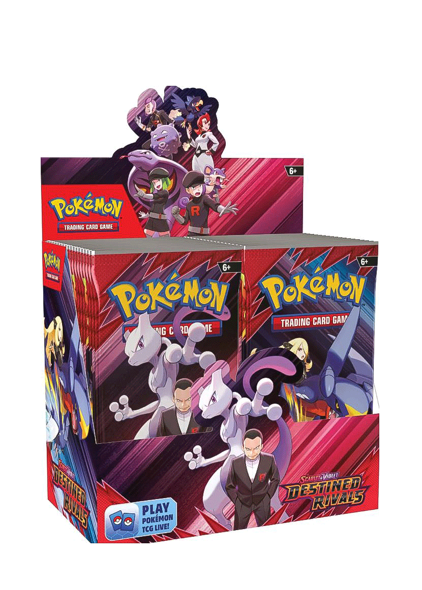 Destini rivali predestinati è celebre per le sue carte che esplorano il lato più enigmatico dell’universo pokémon. preparati a trovare supporti per le oscure macchinazioni del team rocket e la potenza inarrestabile di giovanni. cerca le versioni più formidabili di pokémon leggendari e artificiali, come il leggendario mewtwo, le cui abilità possono capovolgere qualsiasi partita. all’interno di ogni busta, scoprirai un mix dinamico di carte comuni, non comuni, rare e foil, inclusi i temibili pokémon-ex e una miriade di potenti carte allenatore.