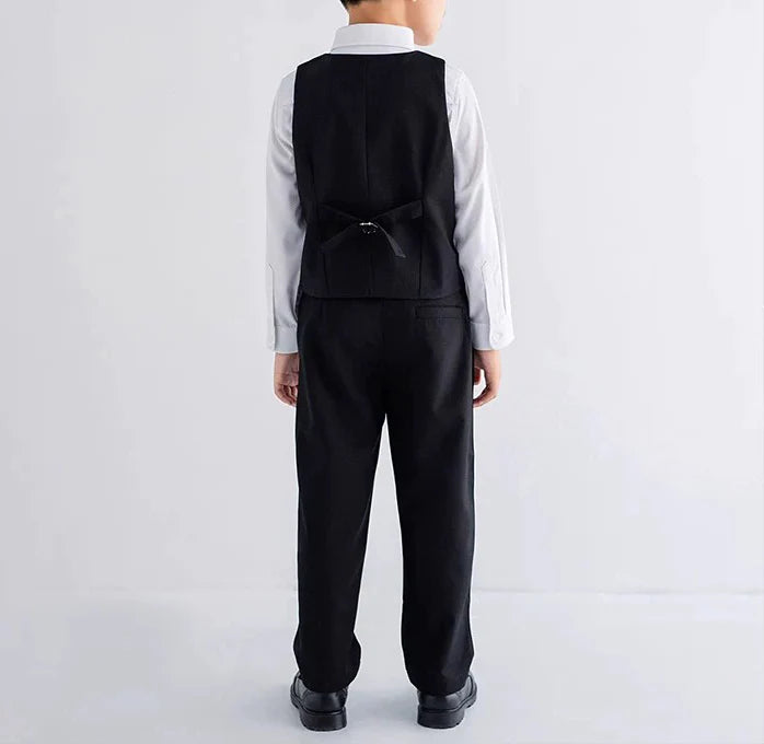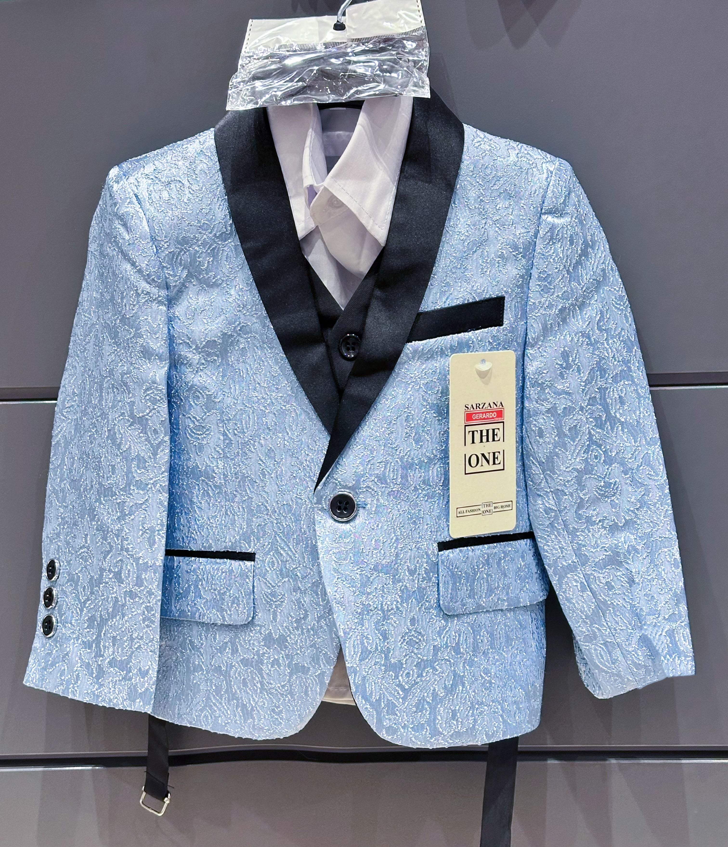 Questo set 5 pezzi include tutto ciò che serve per un look impeccabile: giacca jacquard blu, gilet nero, camicia bianca, pantaloni eleganti e papillon coordinato.