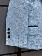 - Tessuto jacquard blu con motivo elegante e luminoso.