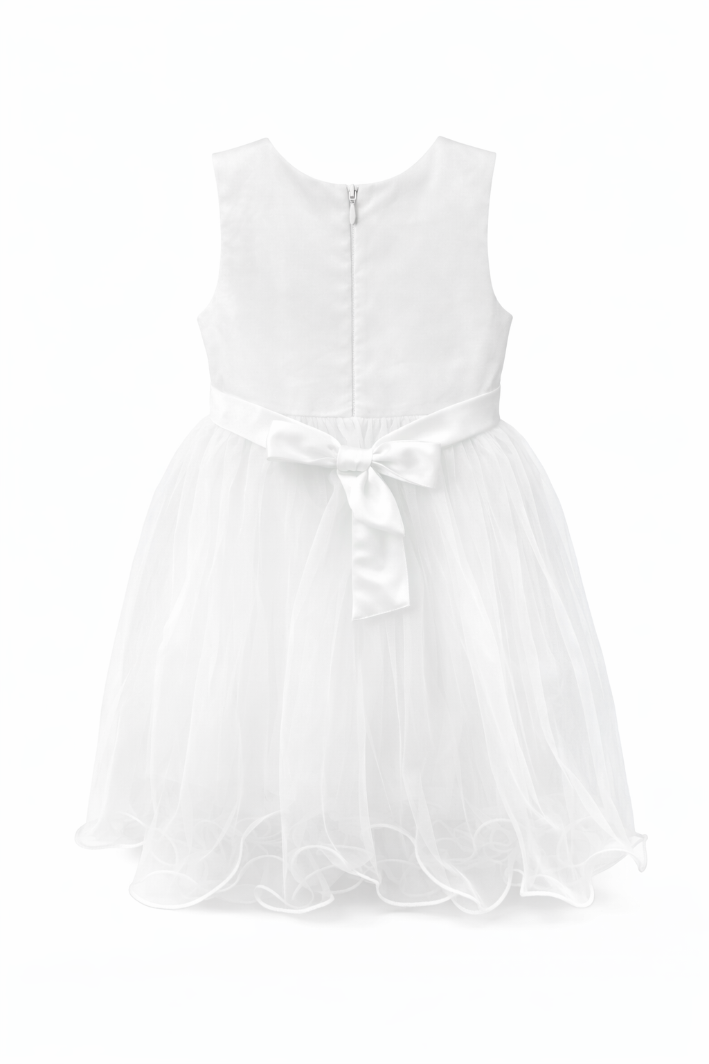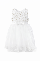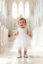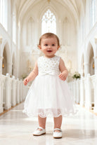 Un delicato abito da cerimonia per neonata 6–36 mesi in bianco, con gonna in tulle leggero, fiocco in vita e piccoli dettagli dorati: perfetto per battesimo, matrimonio, chiesa, festa di compleanno e foto speciali.
