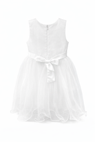 Il corpetto bianco è impreziosito da delicati dettagli dorati che donano luminosità senza risultare eccessivi. La gonna in tulle è vaporosa e leggera, creando un effetto “principessa” mentre la bimba si muove. Il fiocco in vita aggiunge un tocco romantico e rende l’abito ancora più speciale.