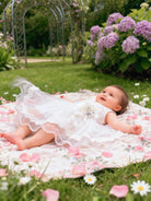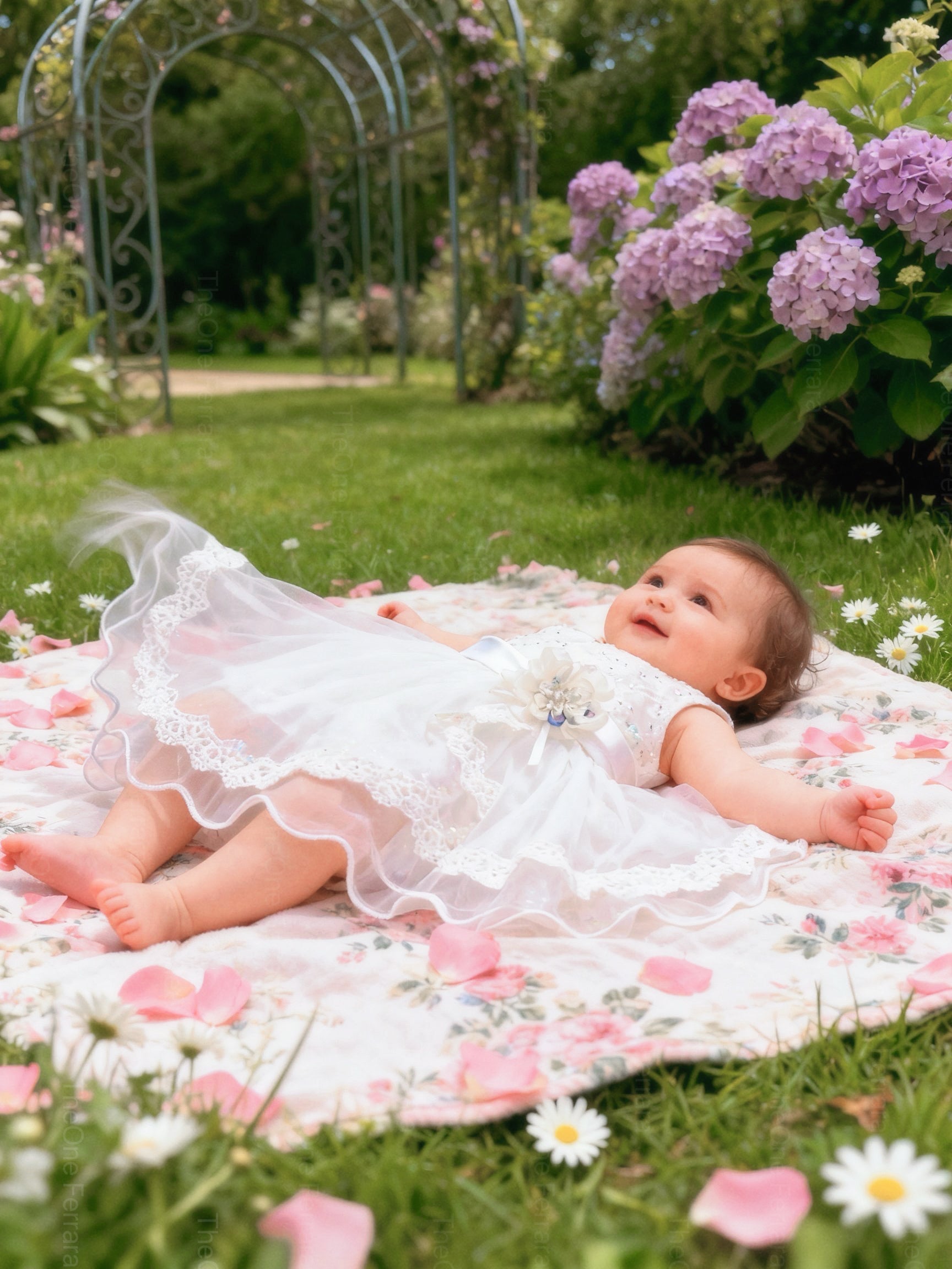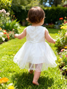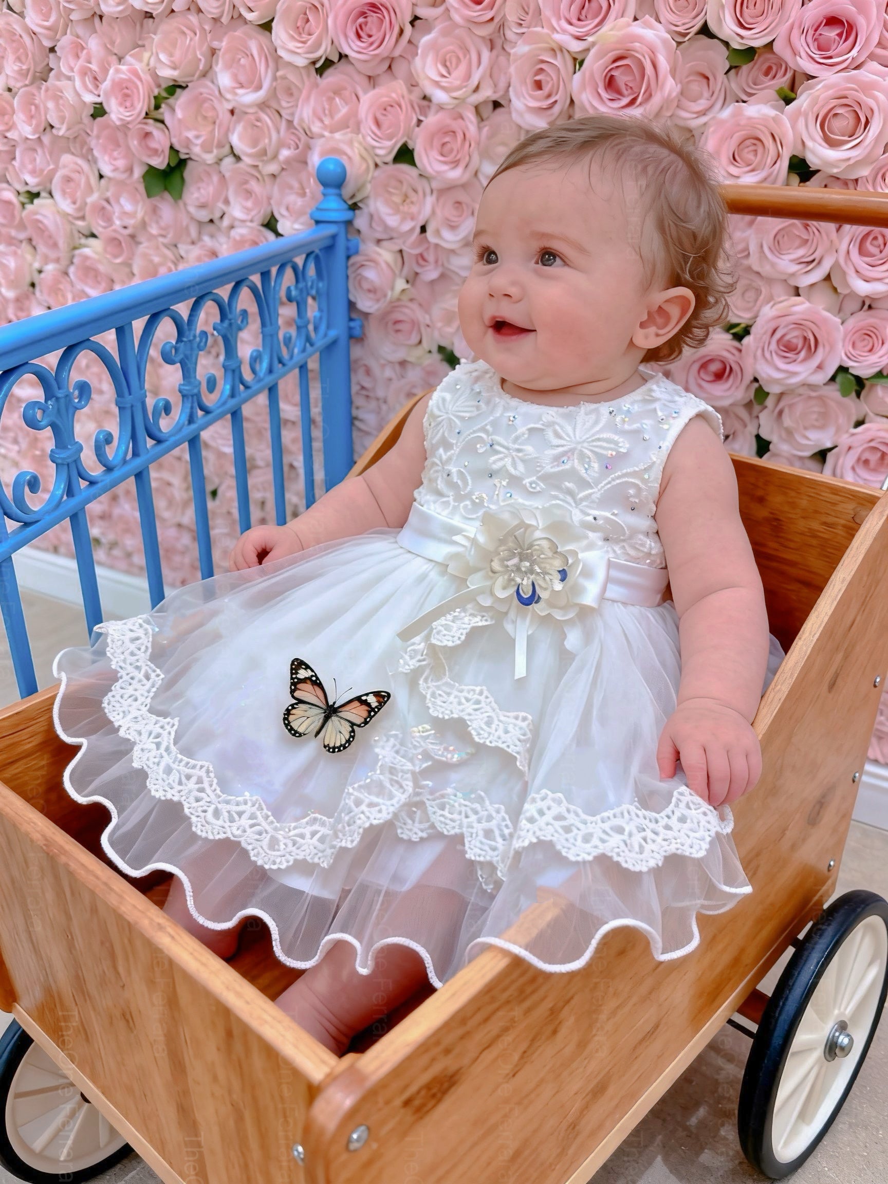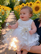 Questo abito da battesimo neonata combina eleganza e dolcezza: il corpetto è decorato con ricami e piccoli strass che donano brillantezza senza esagerare, mentre la gonna in tulle è morbida e vaporosa, perfetta per muoversi in libertà.