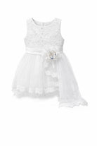 Elegantissimo abito da cerimonia per neonata 6–36 mesi in bianco con ricami impreziositi da strass, fiore decorativo in vita, gonna in tulle leggero e bordo in pizzo: perfetto per battesimo, chiesa, matrimonio e foto speciali.