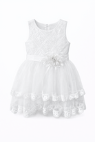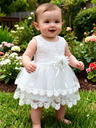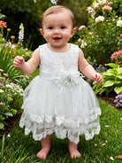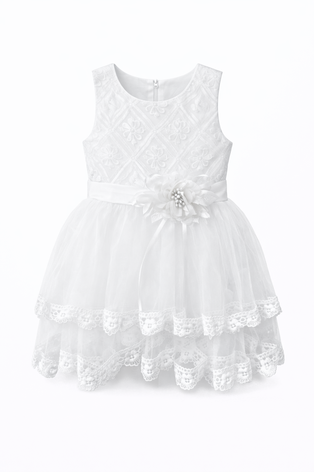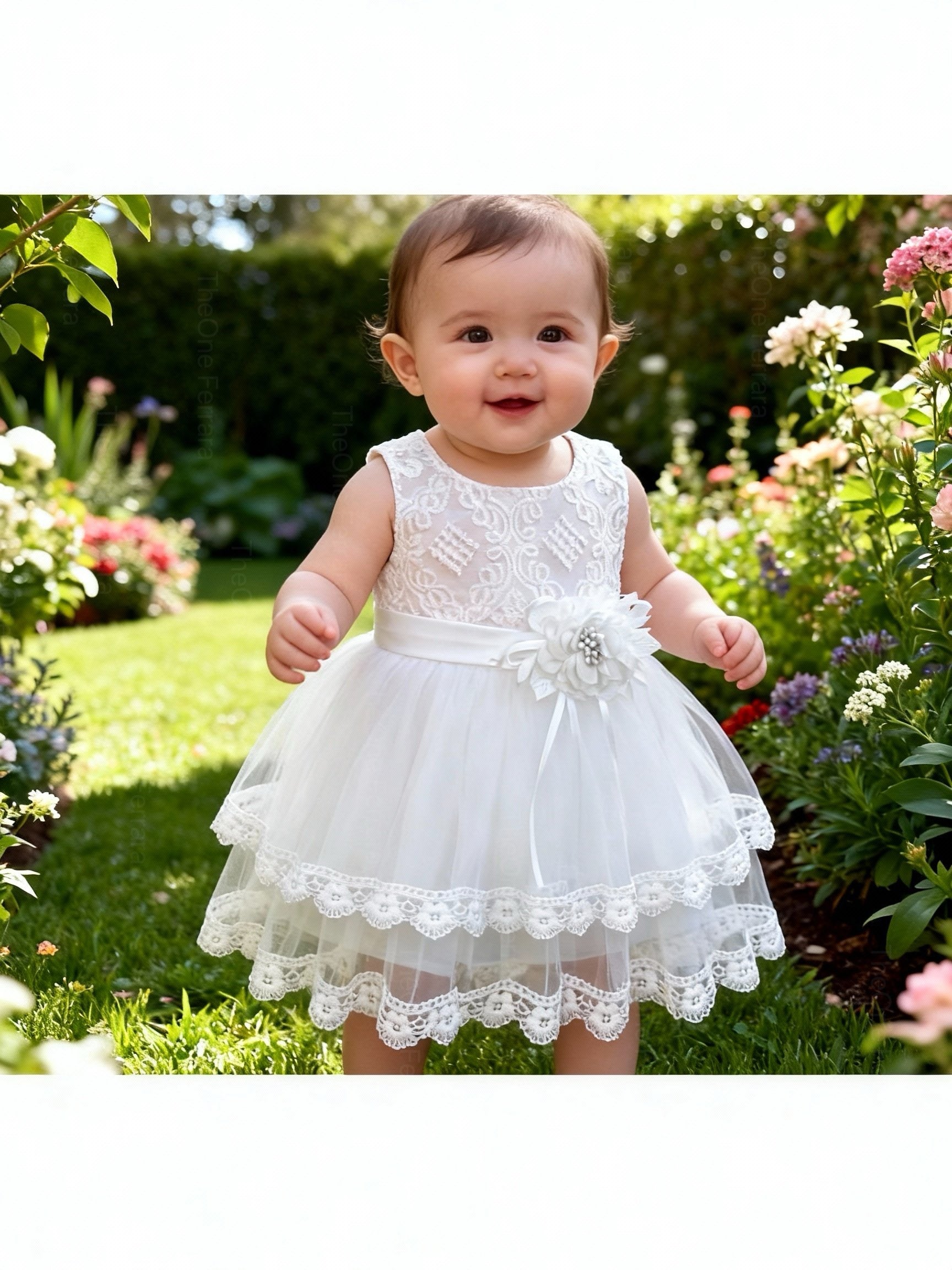Dolcissimo abito da cerimonia per neonata 6–36 mesi in bianco con corpetto ricamato, fiore decorativo in vita, gonna in tulle a strati e bordo in pizzo: perfetto per battesimo, chiesa, compleanno e foto speciali.