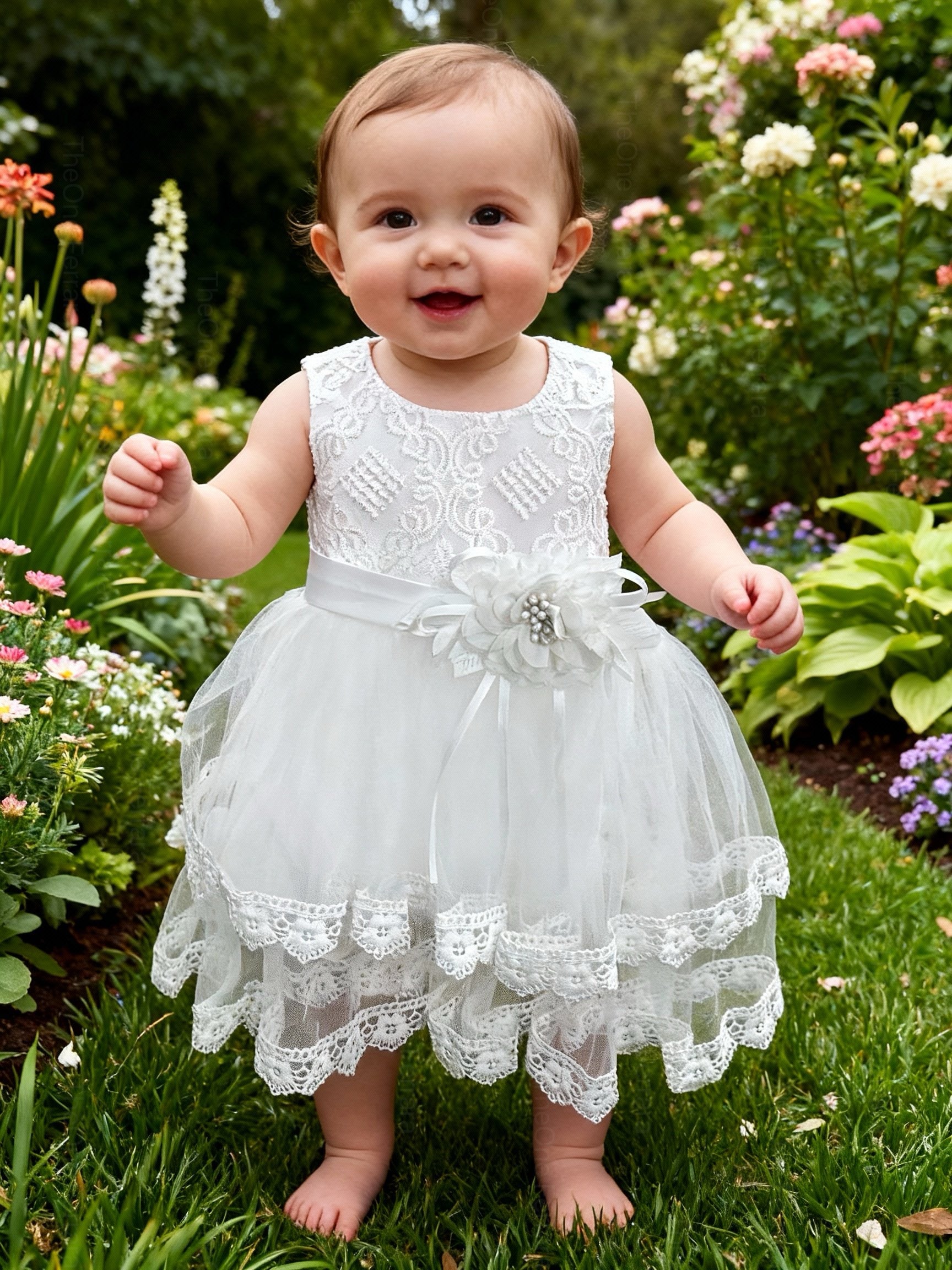 Il fiore decorativo in vita illumina il look, mentre il fiocco sul retro aggiunge un tocco romantico perfetto per cerimonie in chiesa, feste di famiglia e servizi fotografici.