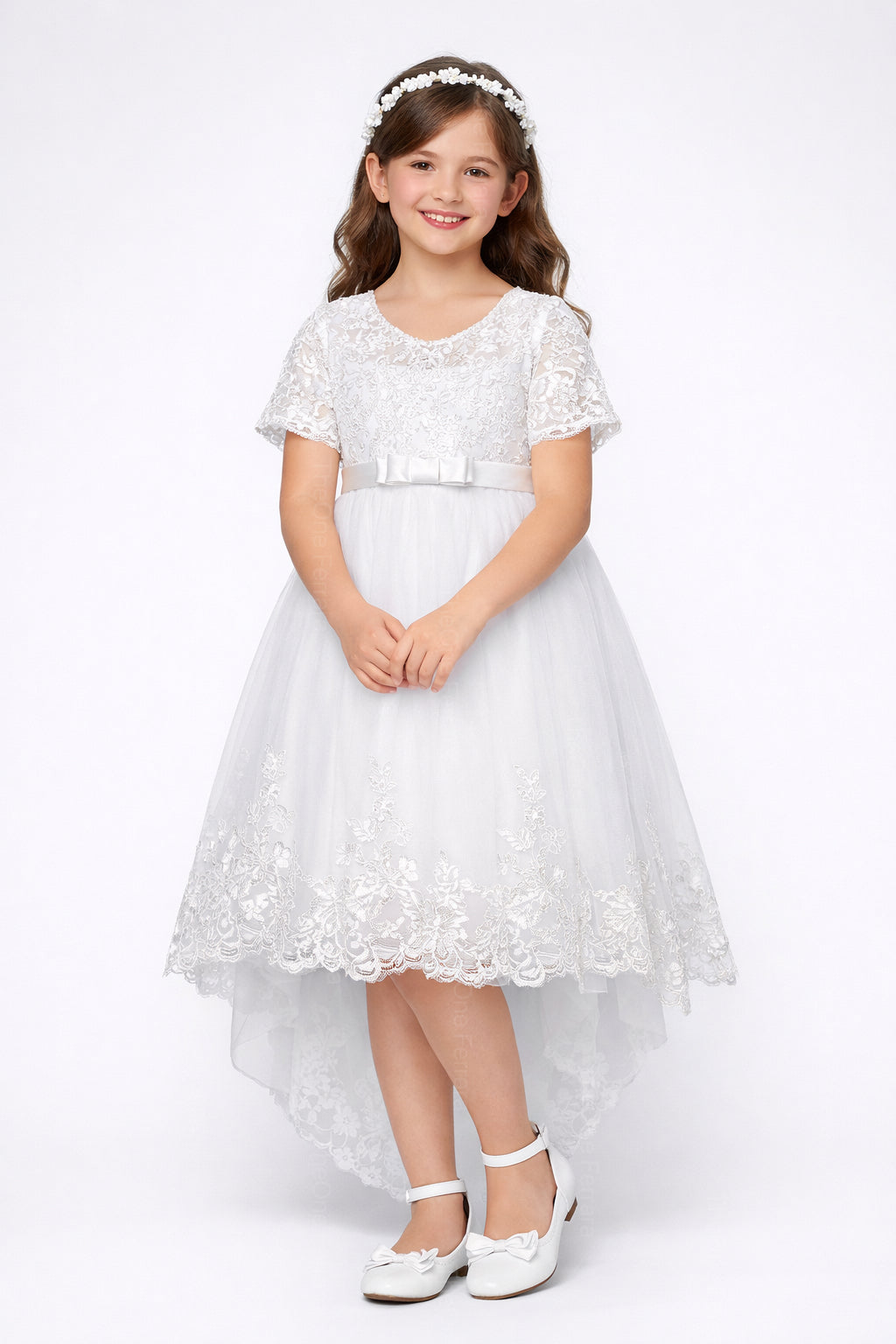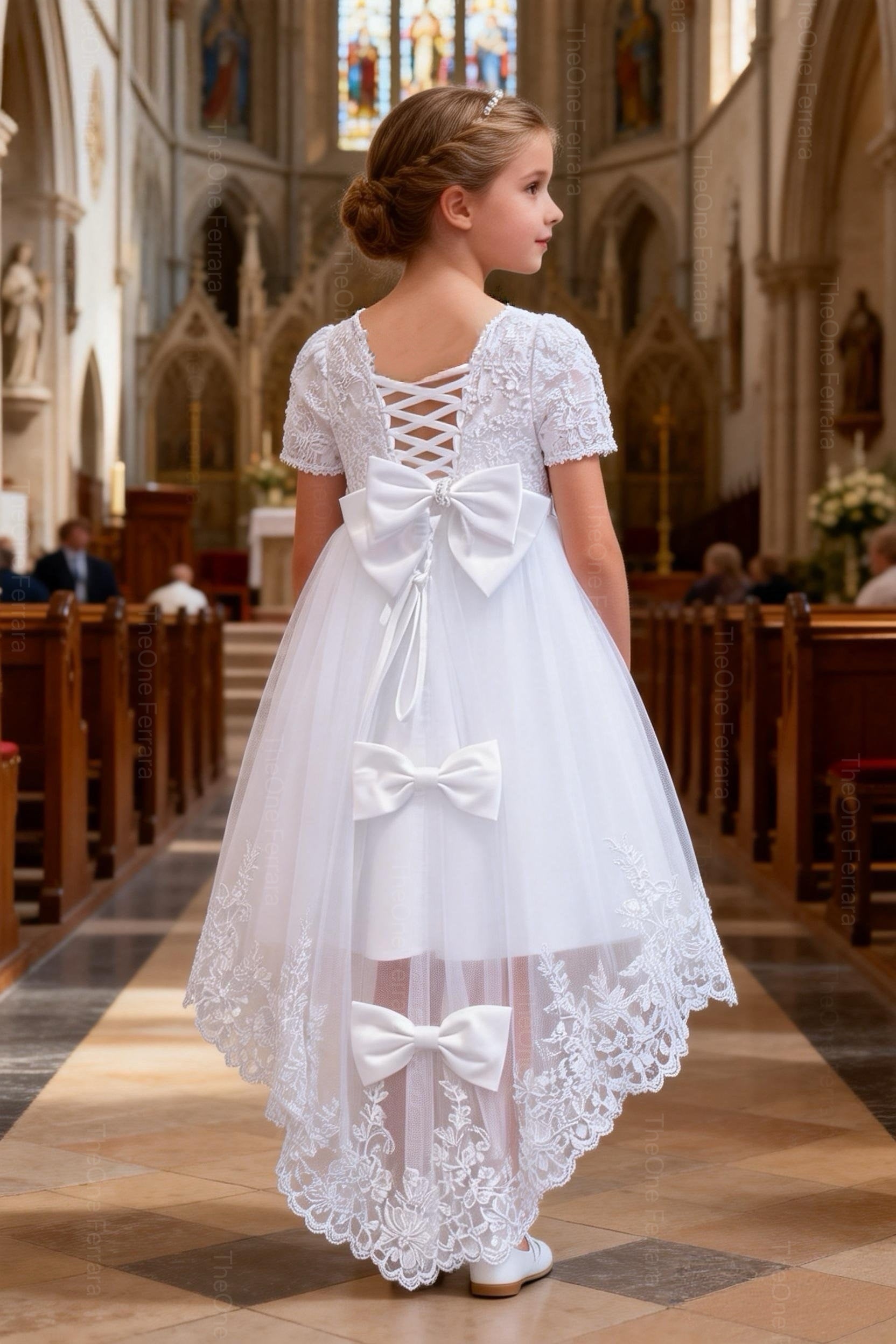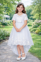 Abito Cerimonia Bambina Bianco in Pizzo e Tulle Comunione, Damigella, Festa 4-14 Anni 3637-TheOne