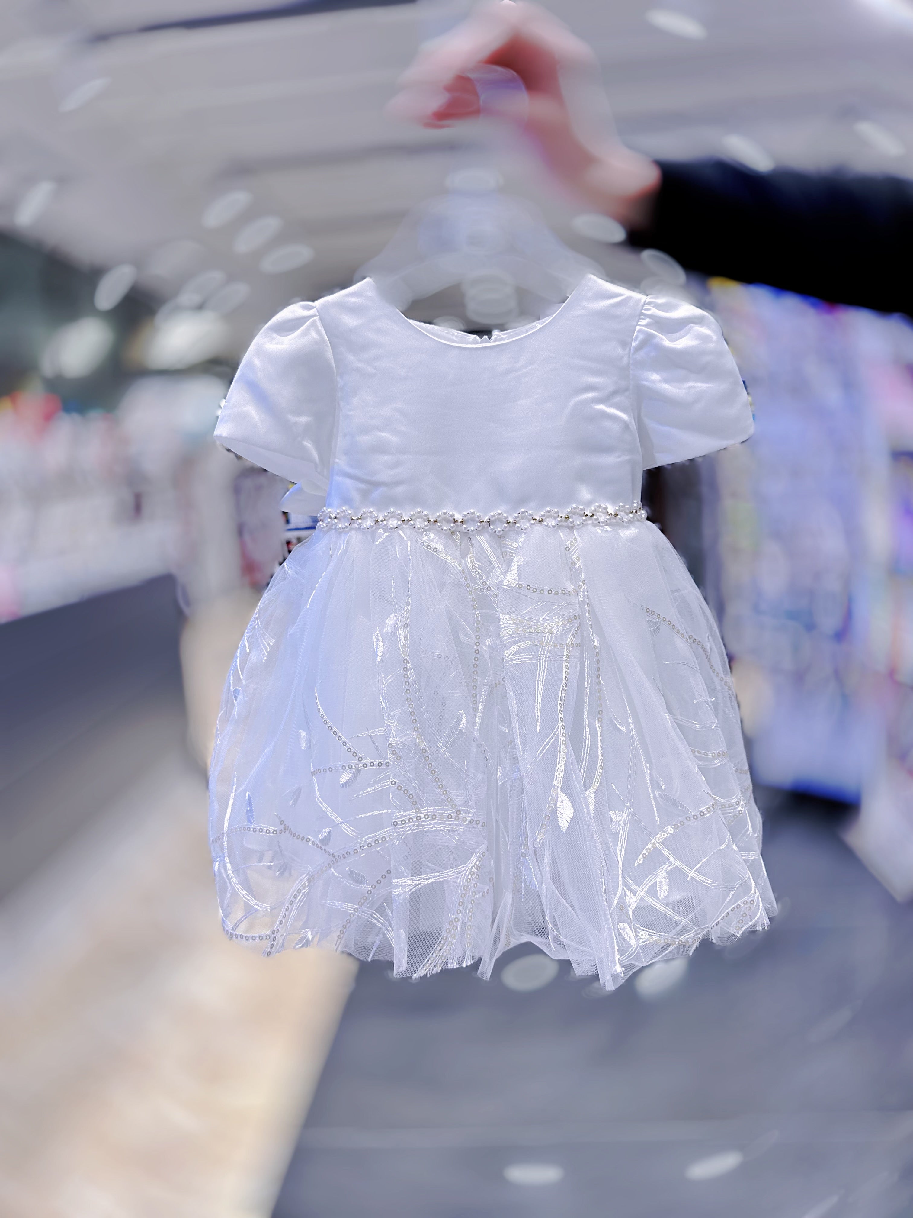 Vestito bianco bambina con perline e tulle 3M–36M Battesimo, Cerimonia, Matrimonio