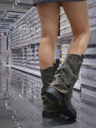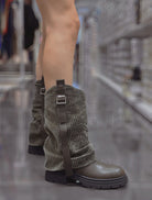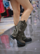 Stivaletti verdi in velluto a coste con cinturino | Stivali donna stile workwear a metà polpaccio-RQY126