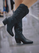 Stivali da cowboy da donna – Tacco largo, punta affusolata, stivali neri a metà polpaccio-HL219