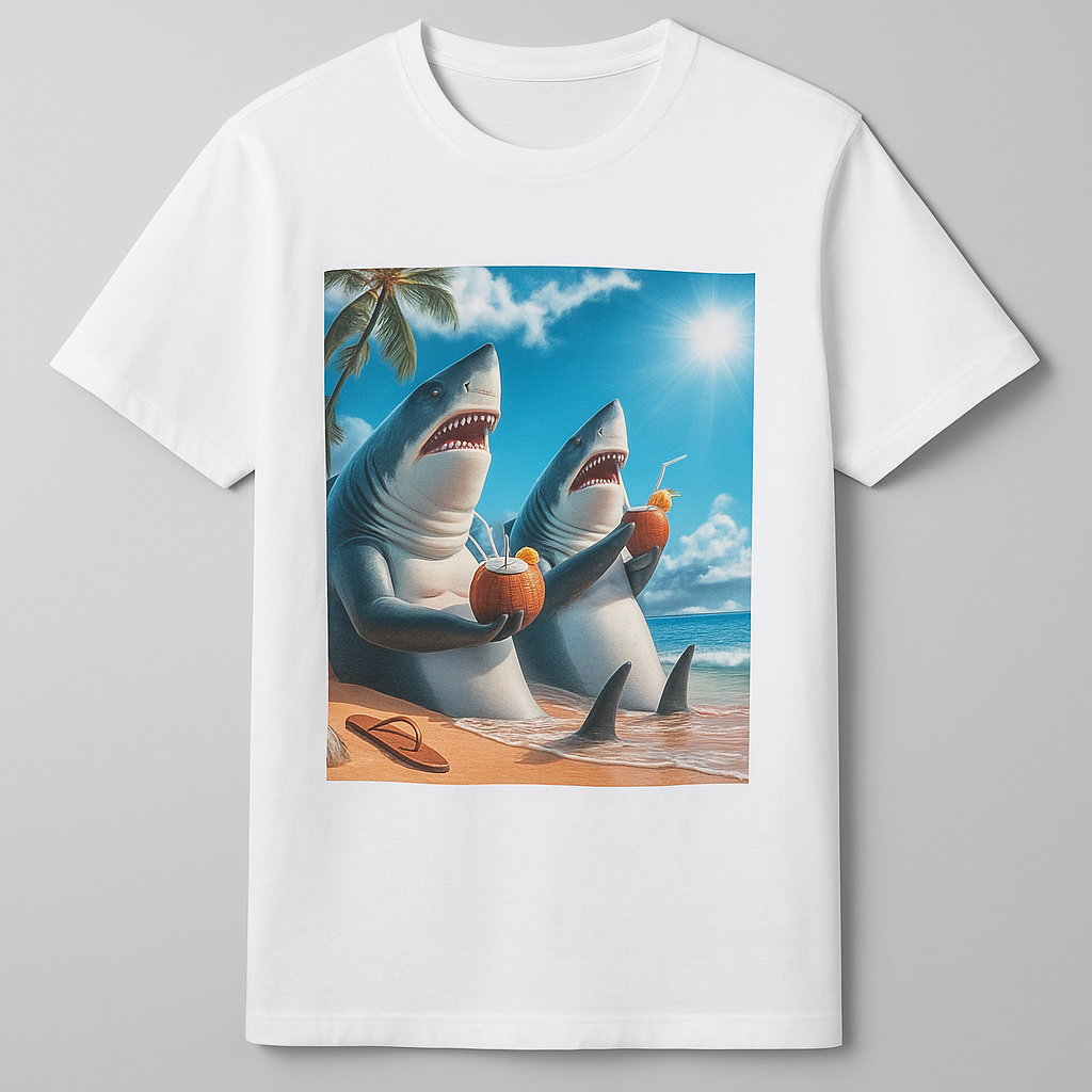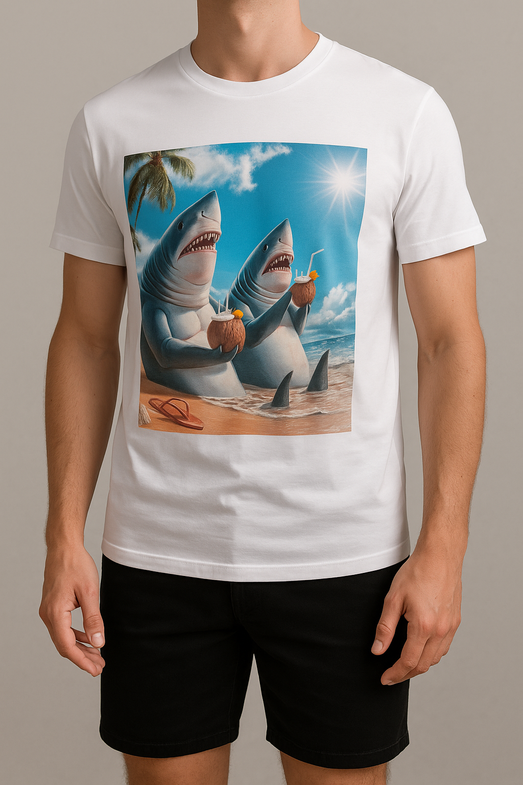 T-shirt uomo 100% cotone con squali sulla spiaggia. Stile divertente da mare, perfetta per l’estate. Disponibile ora in tutte le taglie.