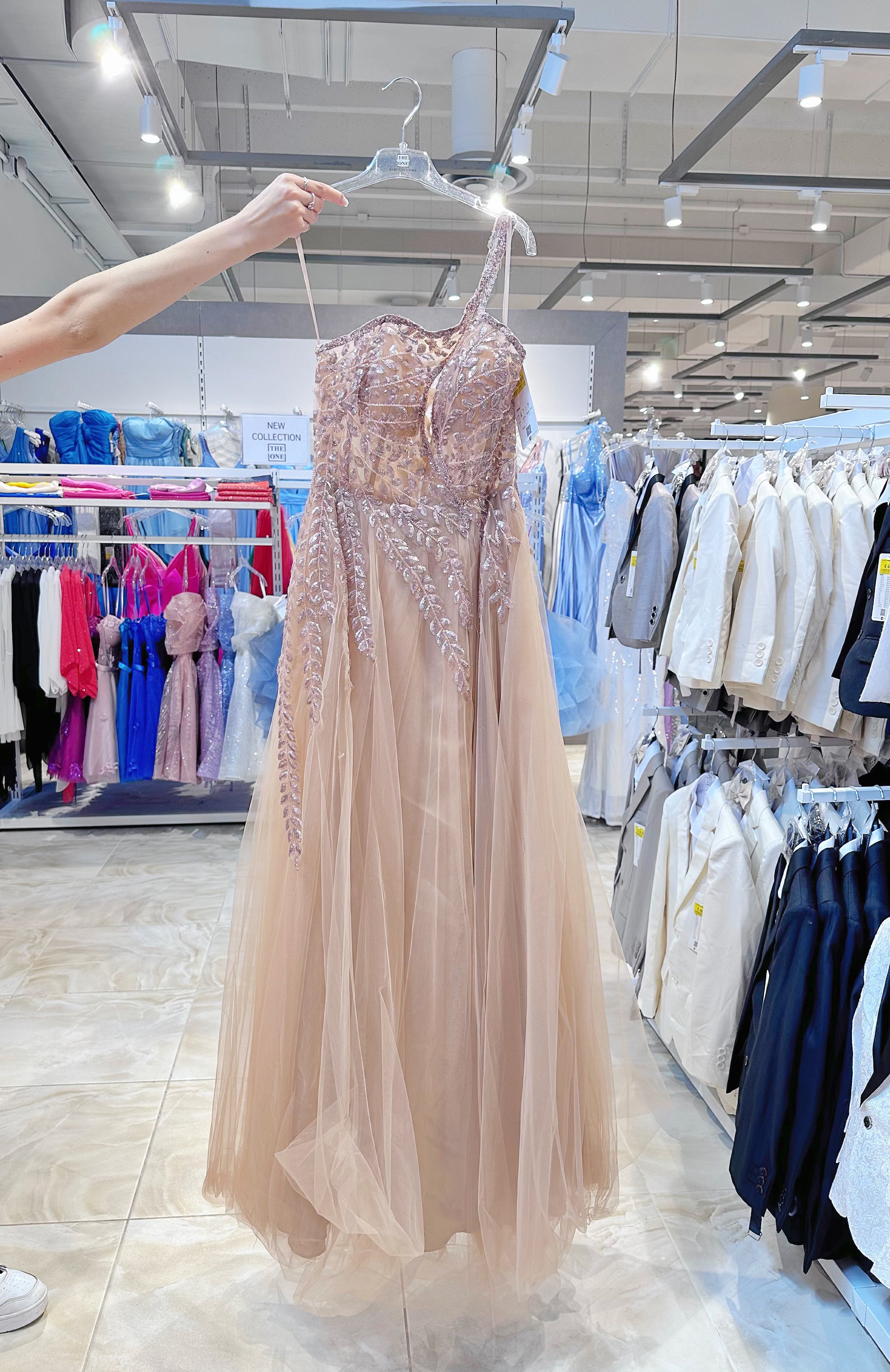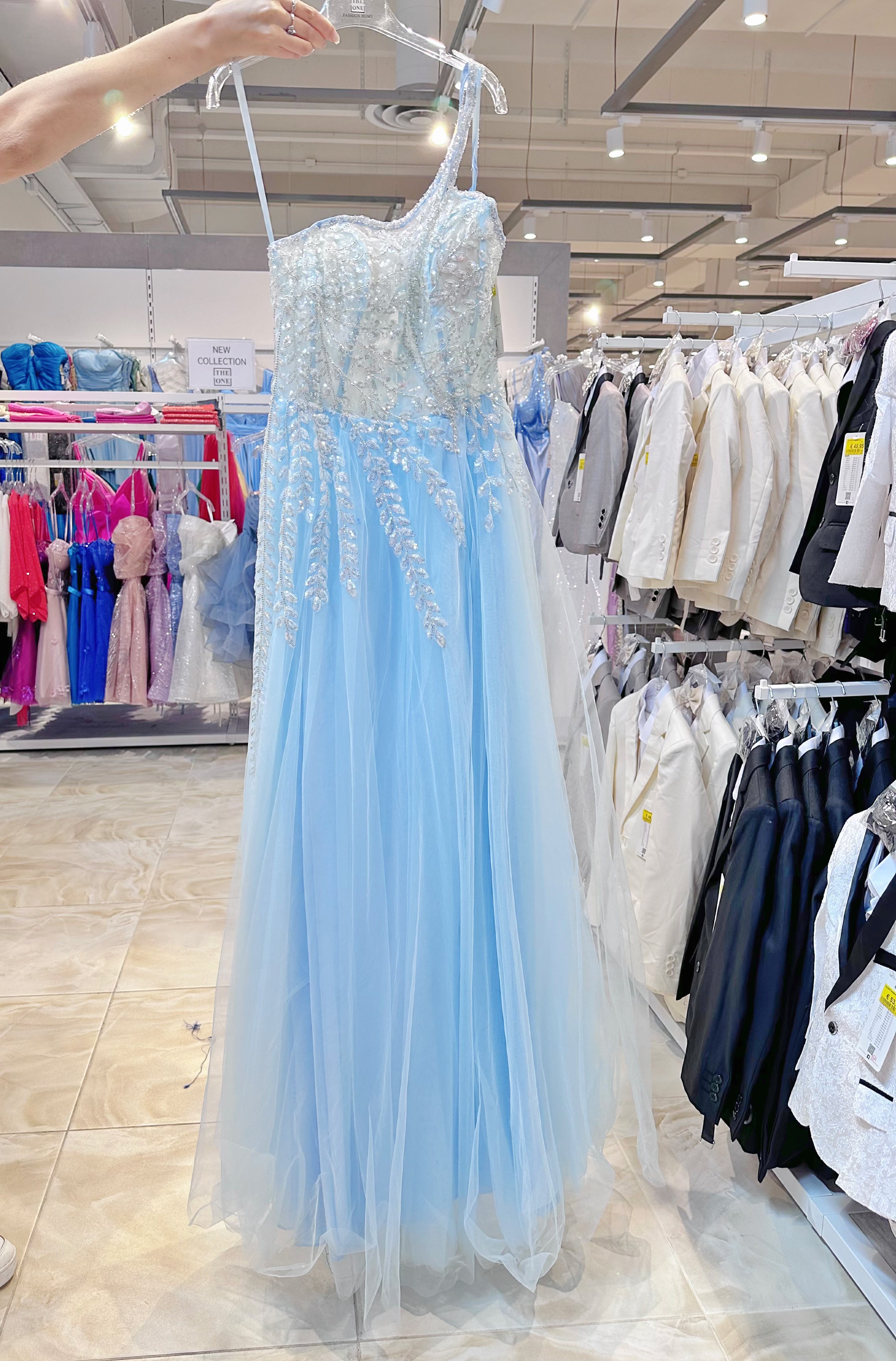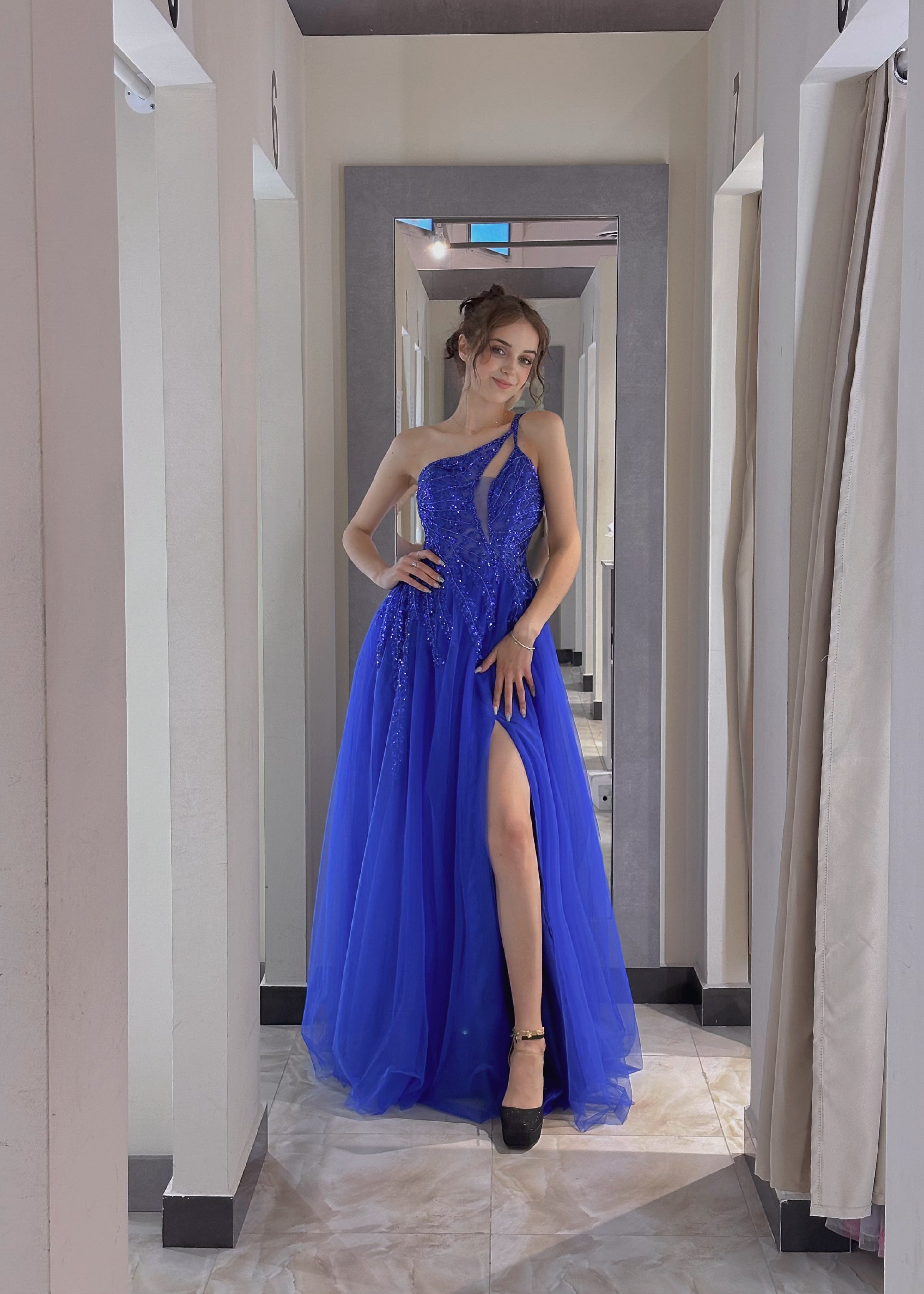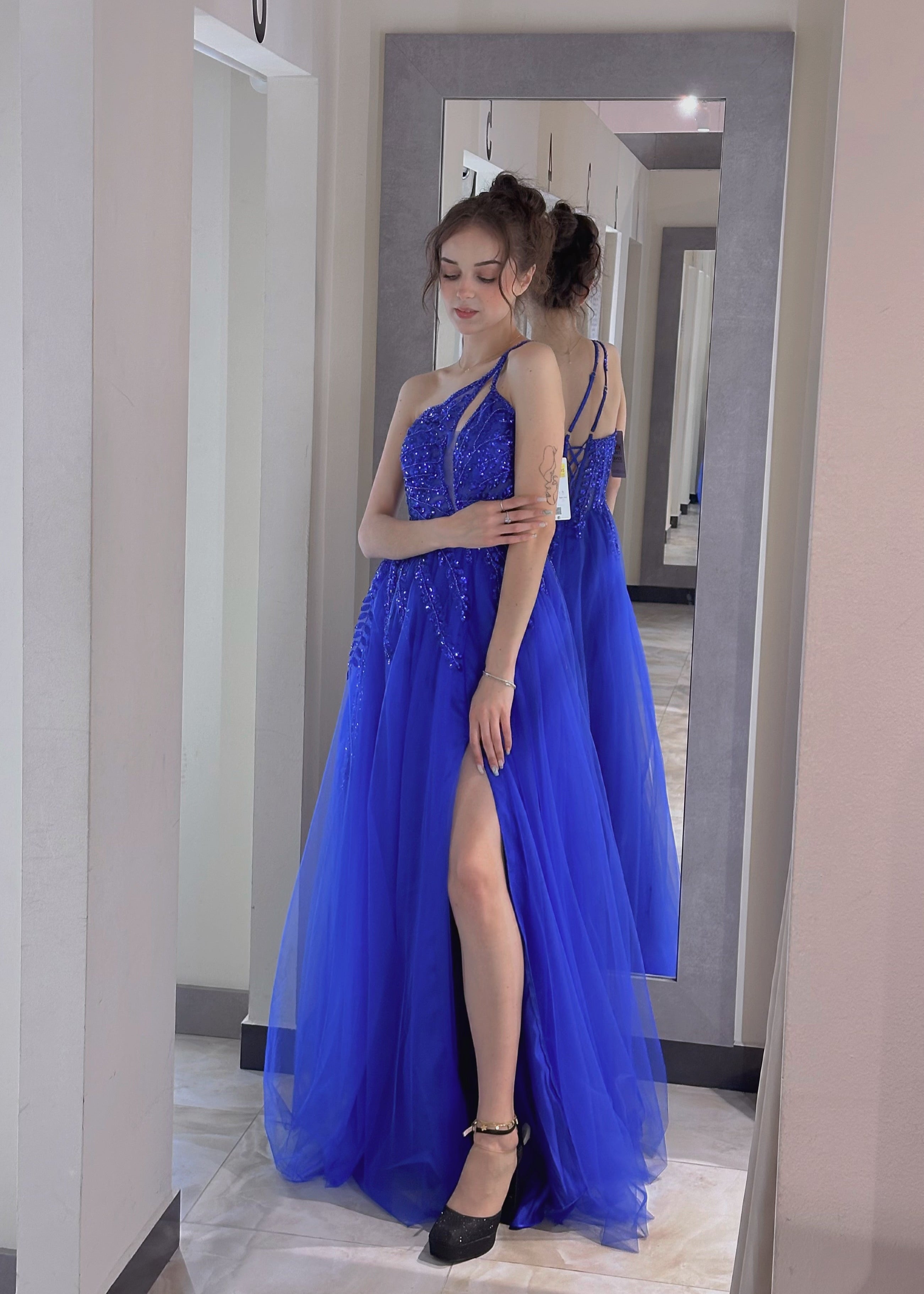 Fatti notare ad ogni passo con questo affascinante abito da sera blu reale. Caratterizzato da uno scollo monospalla elegante e dettagli in perline applicate a mano, questo abito emana eleganza e sicurezza. Lo strato di tulle fluido crea un movimento etereo, mentre lo spacco alto dona un tocco moderno e audace.