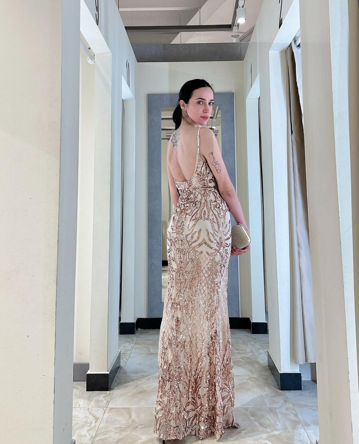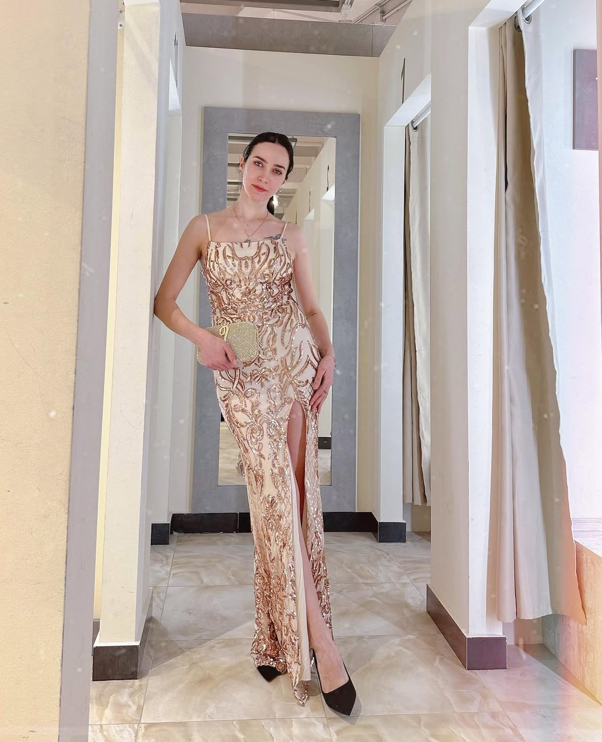 Un abito da sera che sembra scolpito nella luce. Il fondo color champagne abbinato a ricami in paillettes bronzo crea un effetto scintillante e regale. Il design con spalline sottili e schiena scoperta esalta la femminilità, mentre lo spacco profondo aggiunge un tocco audace.