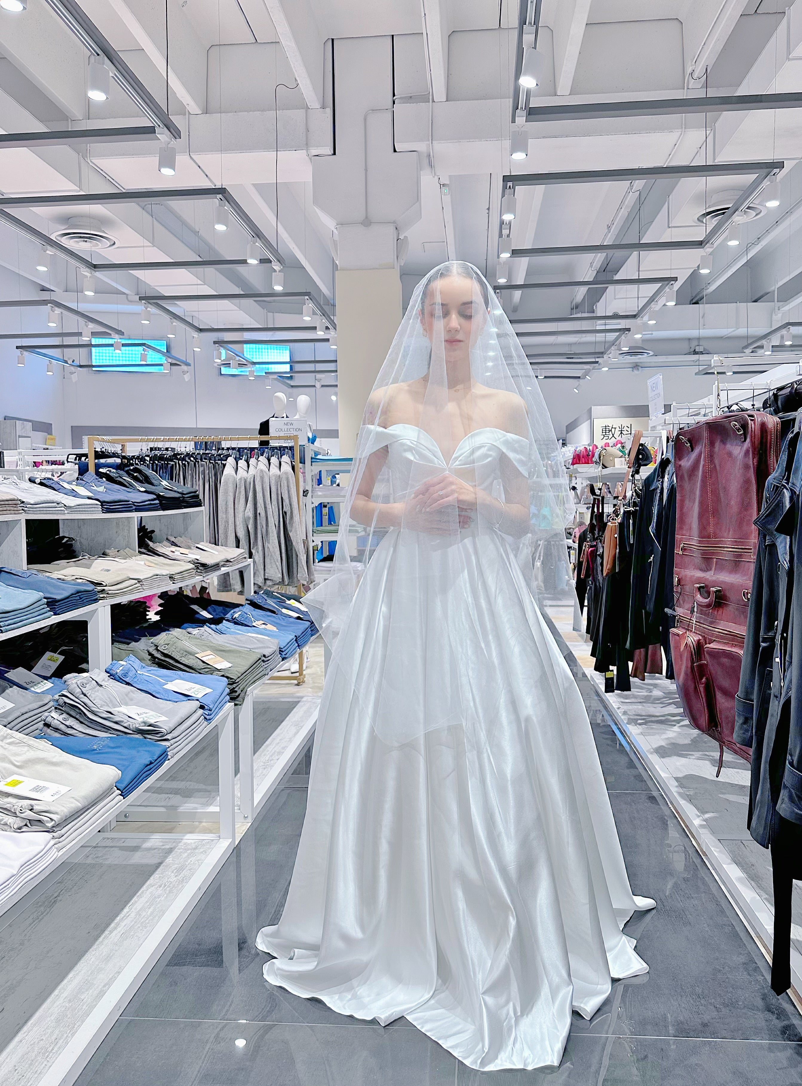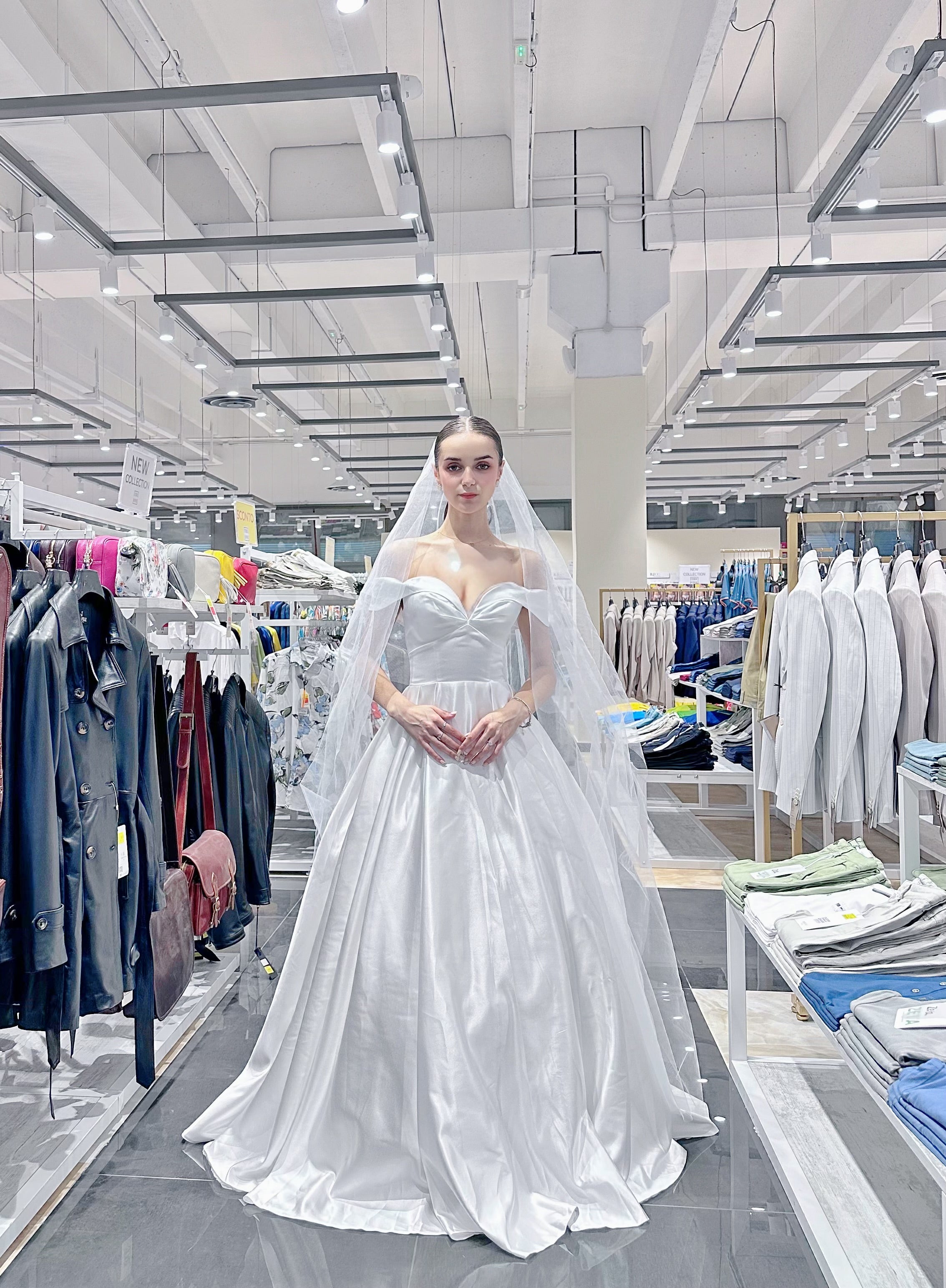 Celebra il tuo giorno speciale con un tocco di raffinatezza. Questo abito da sposa in raso, con scollo a cuore e maniche off-shoulder, unisce l’eleganza classica alla grazia moderna. La gonna ampia in stile A-line dona movimento e leggerezza, perfetta per ogni sposa che sogna un ingresso indimenticabile.