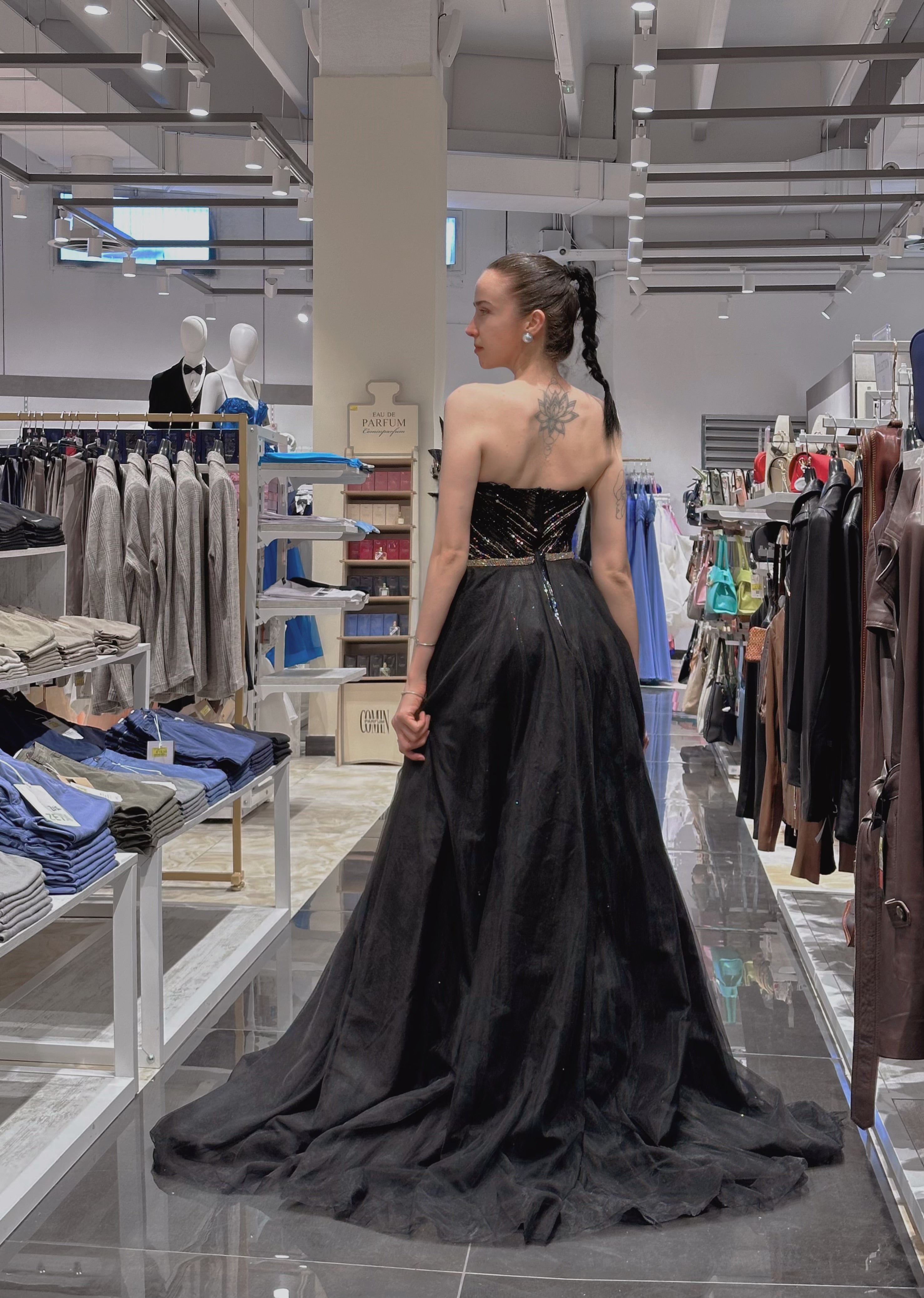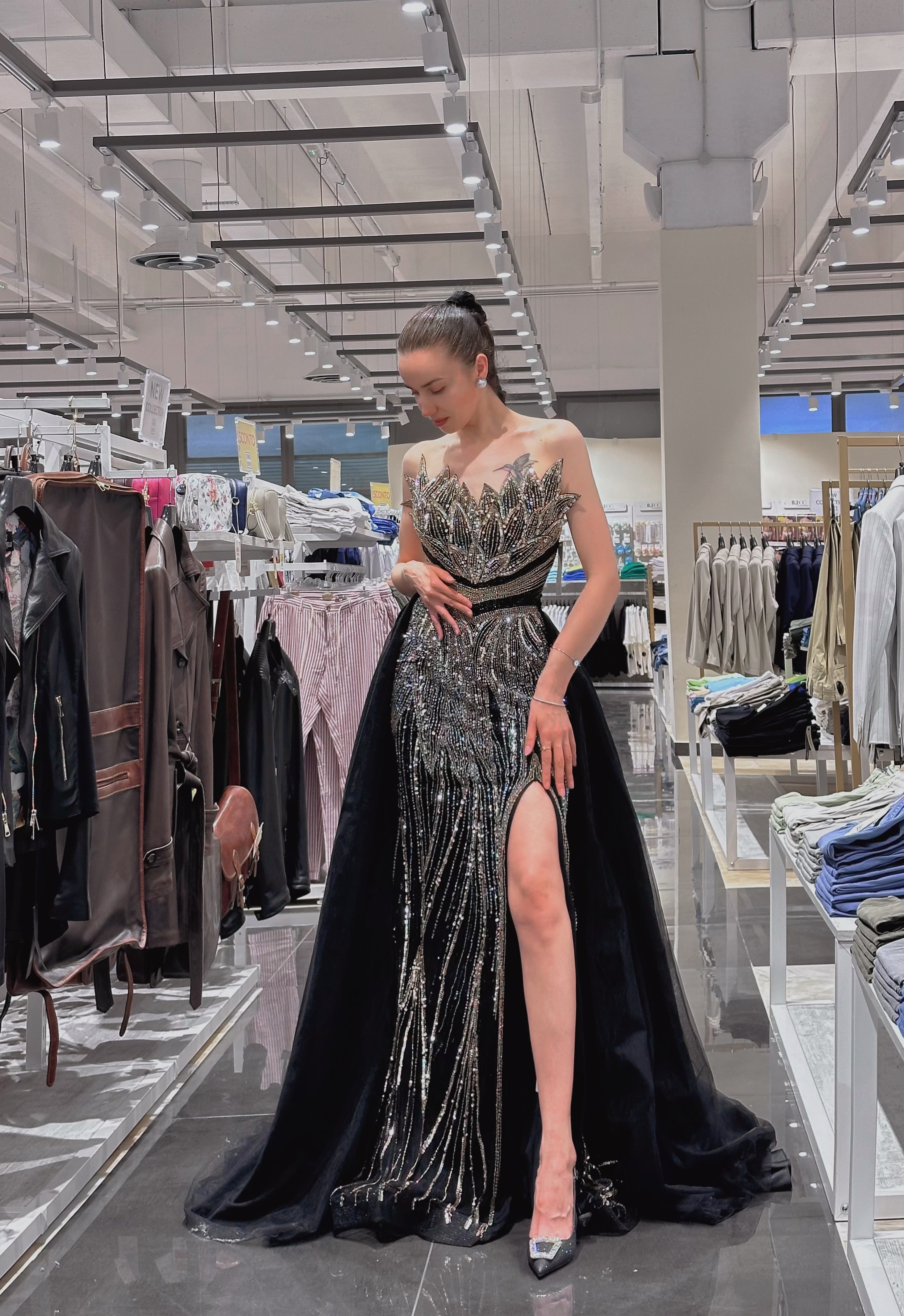 Ricami a mano di livello couture: Perline, paillettes e dettagli scintillanti creano una silhouette scolpita e regale.