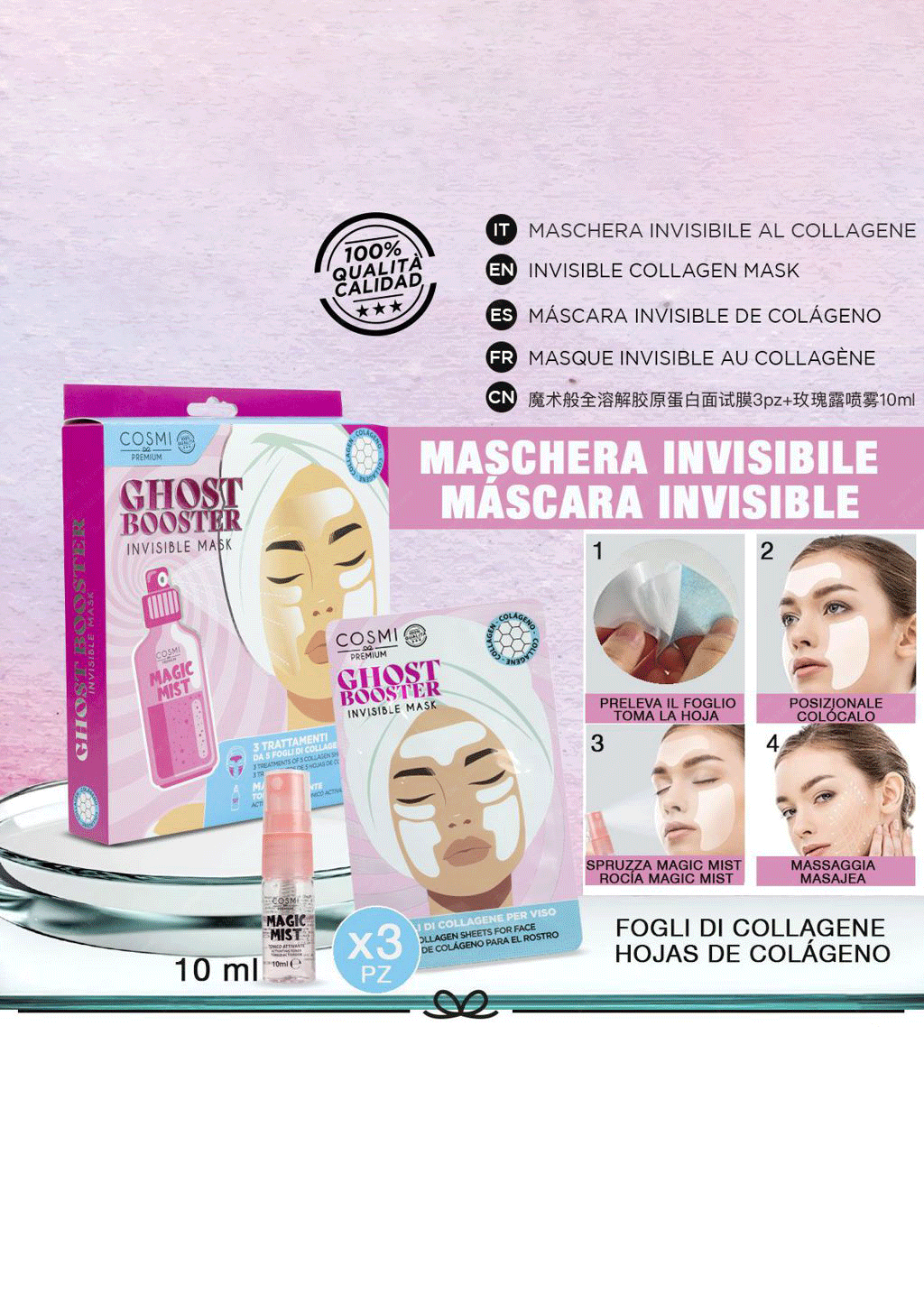 Ghostbooster è un velo di collagene da applicare sulle zone critiche del viso, che si scioglie a contatto con la magic mist, il tonico attivante.