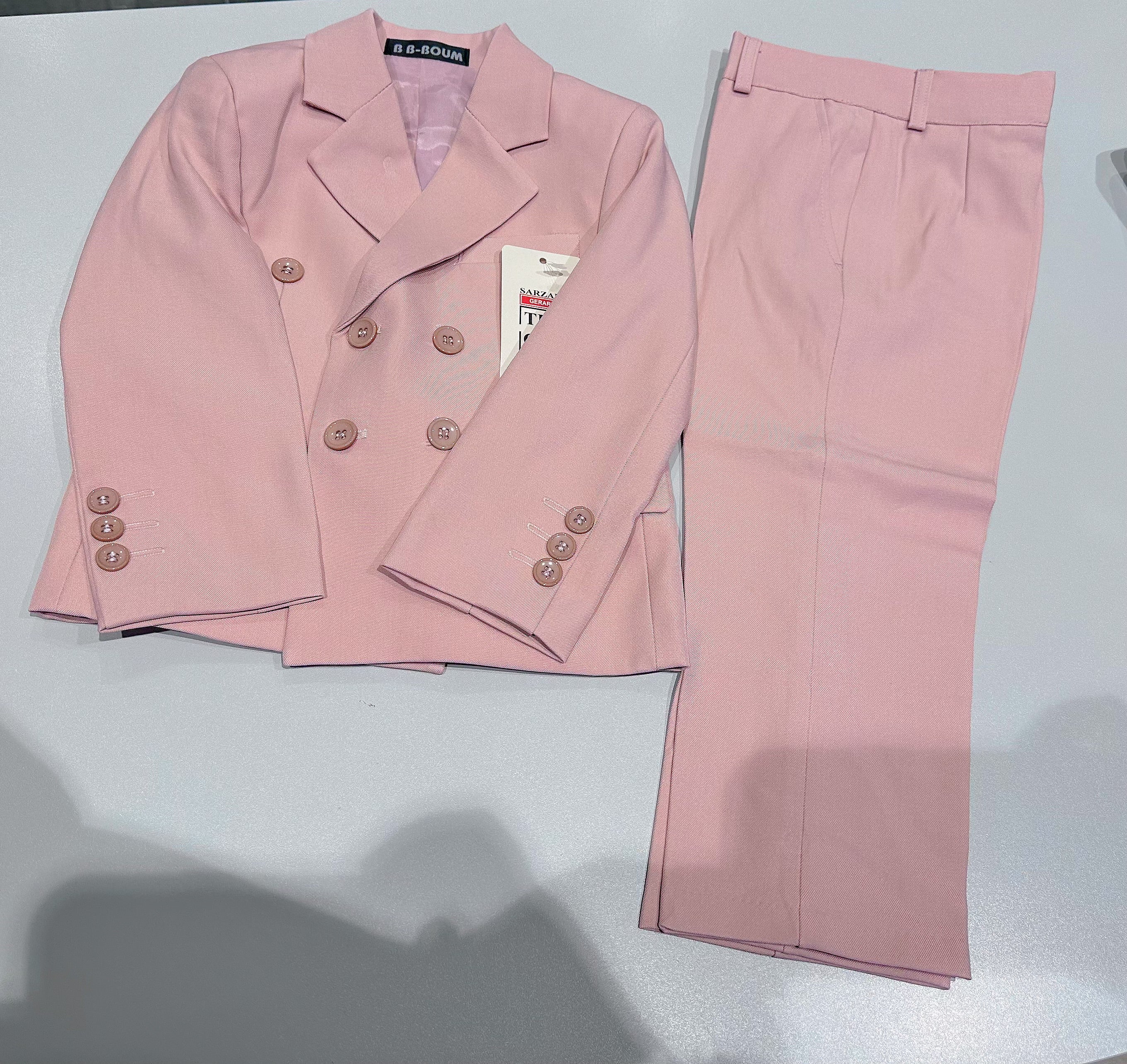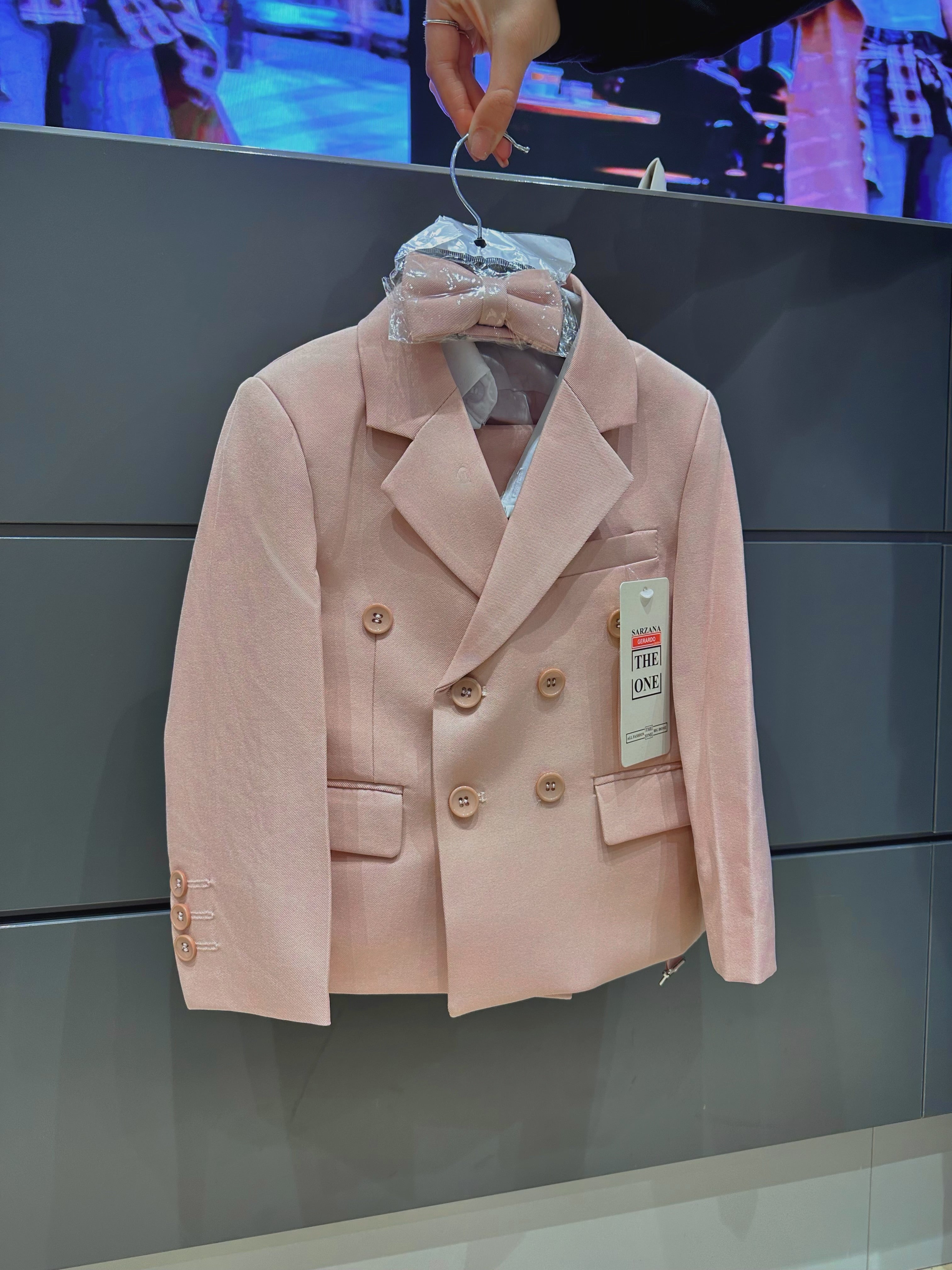 Proposto in un raffinato rosa cipria, questo outfit rappresenta la scelta ideale per matrimoni, battesimi, eventi esclusivi e servizi fotografici.