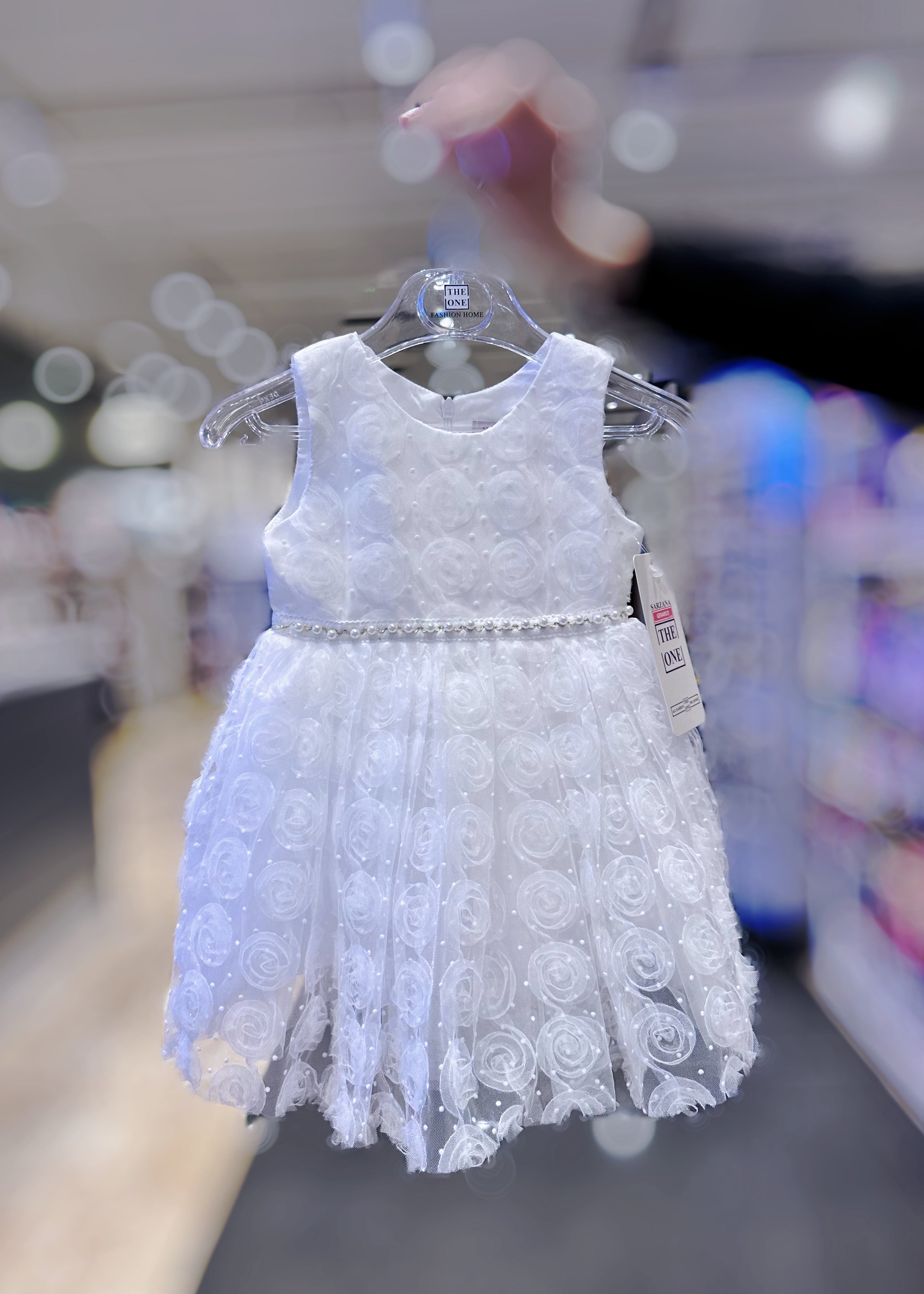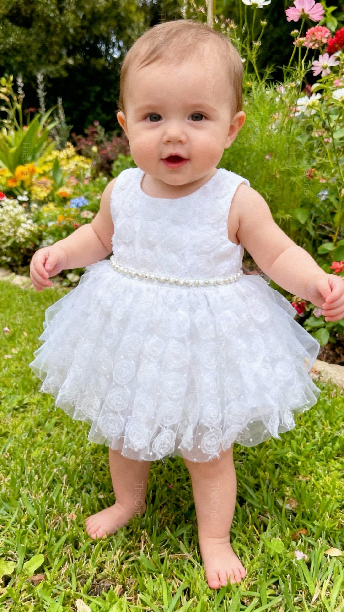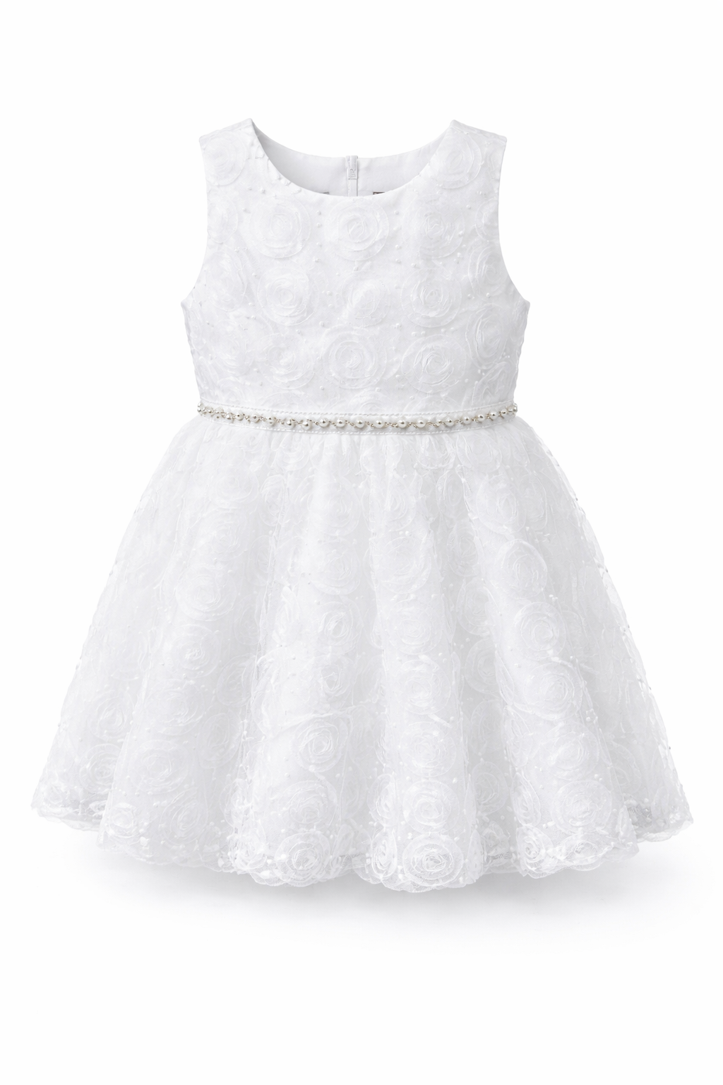 Elegante abito da cerimonia bambina 6 mesi–12 anni in bianco con tulle effetto rose 3D, raffinata cintura di perle e gonna vaporosa: perfetto per battesimo, comunione, matrimonio, compleanno e foto speciali.