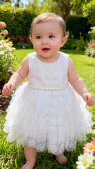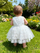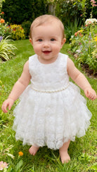 Questo abito da battesimo per bambina è realizzato con un delicato tulle decorato da rose in rilievo che dona un effetto elegante e raffinato.