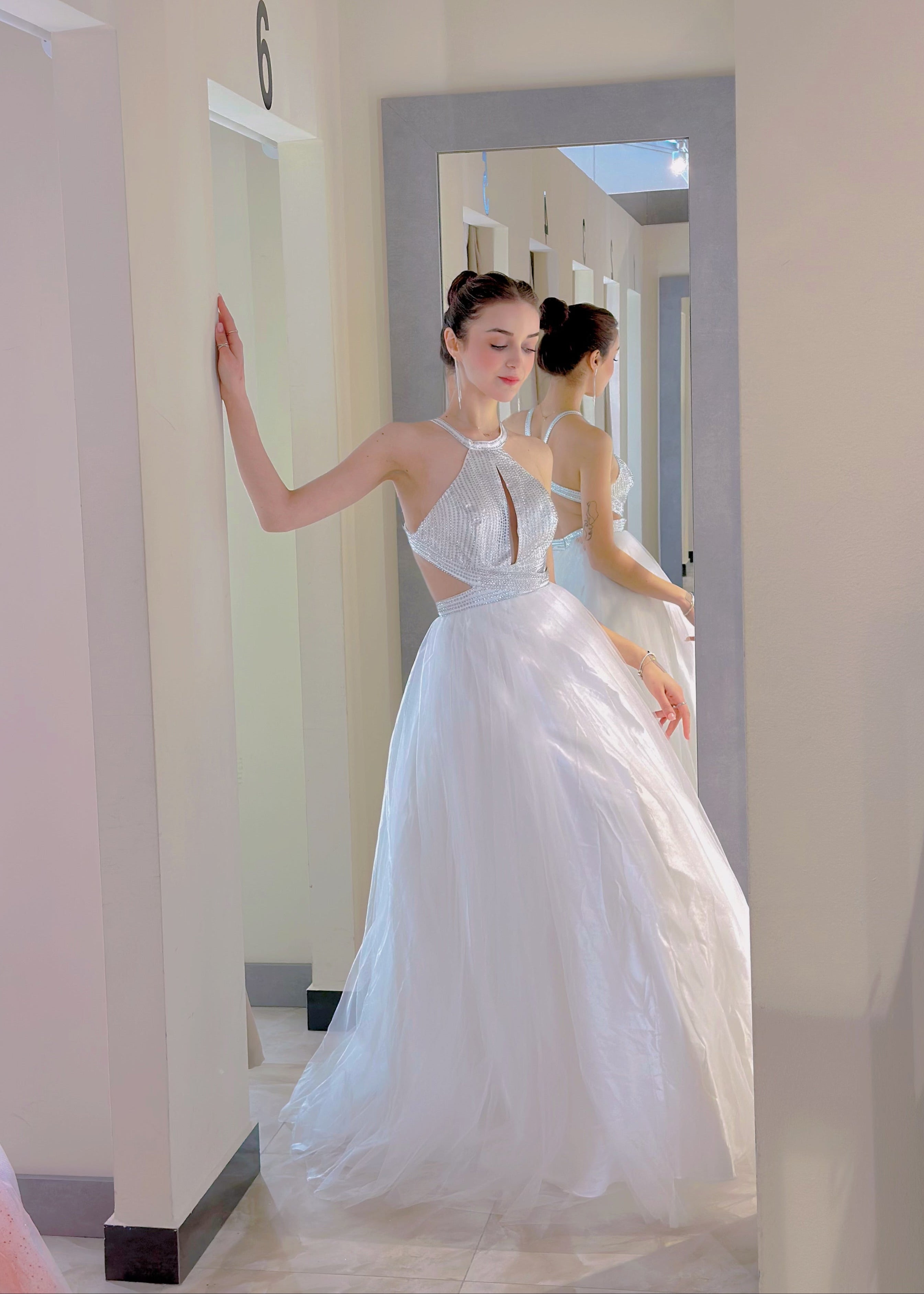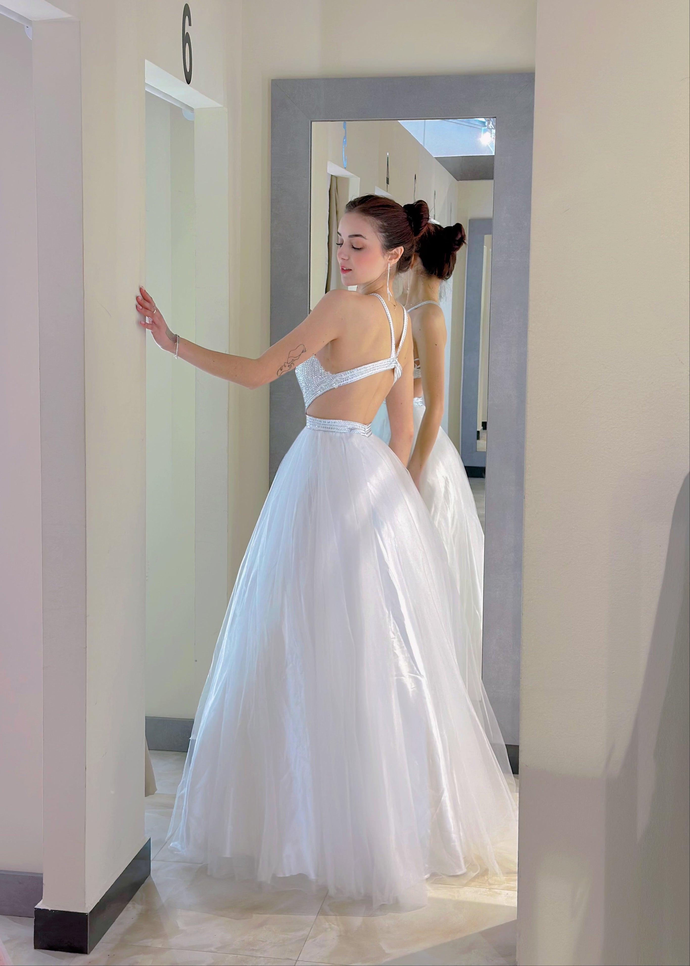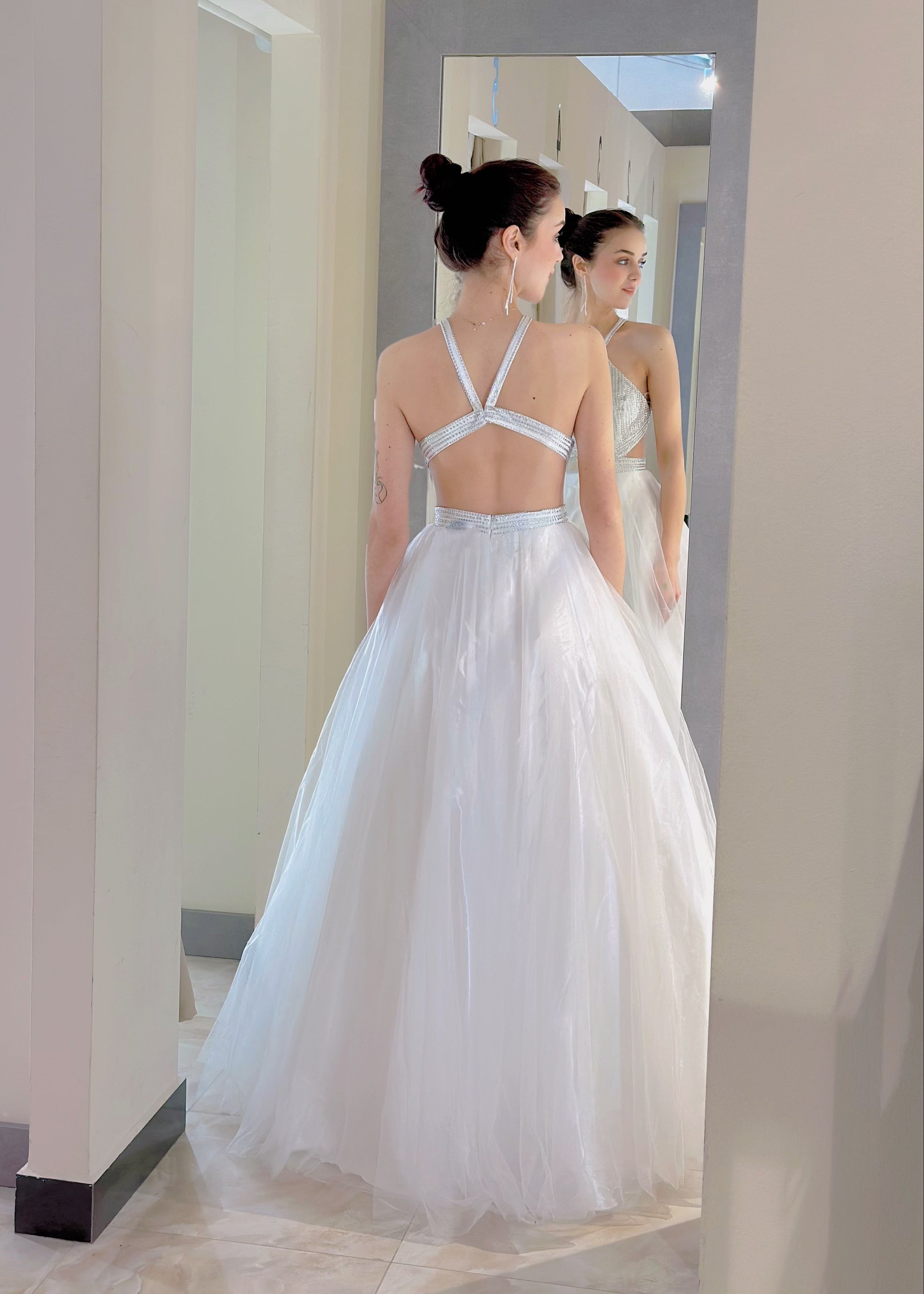 👗 Brilla come una vera regina! Questo elegante abito da sera bianco iridescente è perfetto per eventi speciali. Il suo design sofisticato, con corpetto incrociato e schiena scoperta, esalta la silhouette con un tocco di modernità e femminilità.