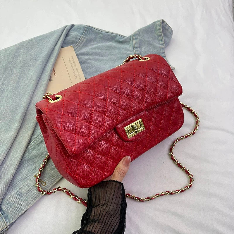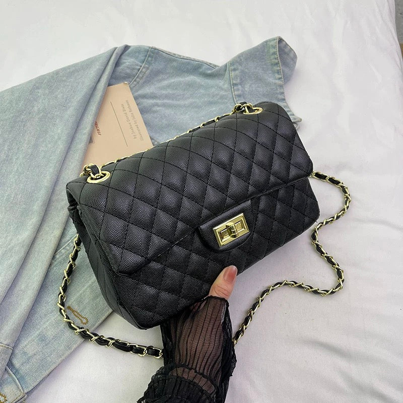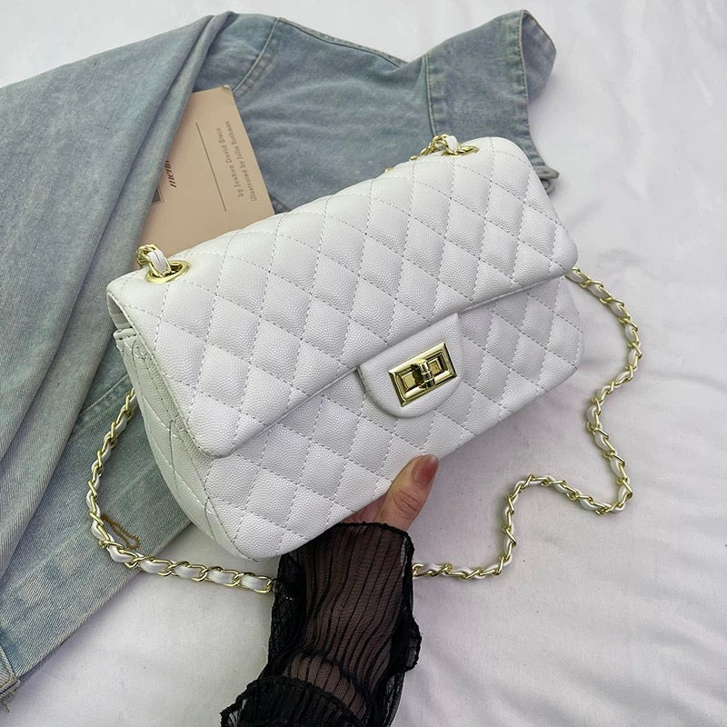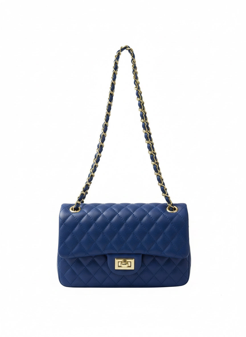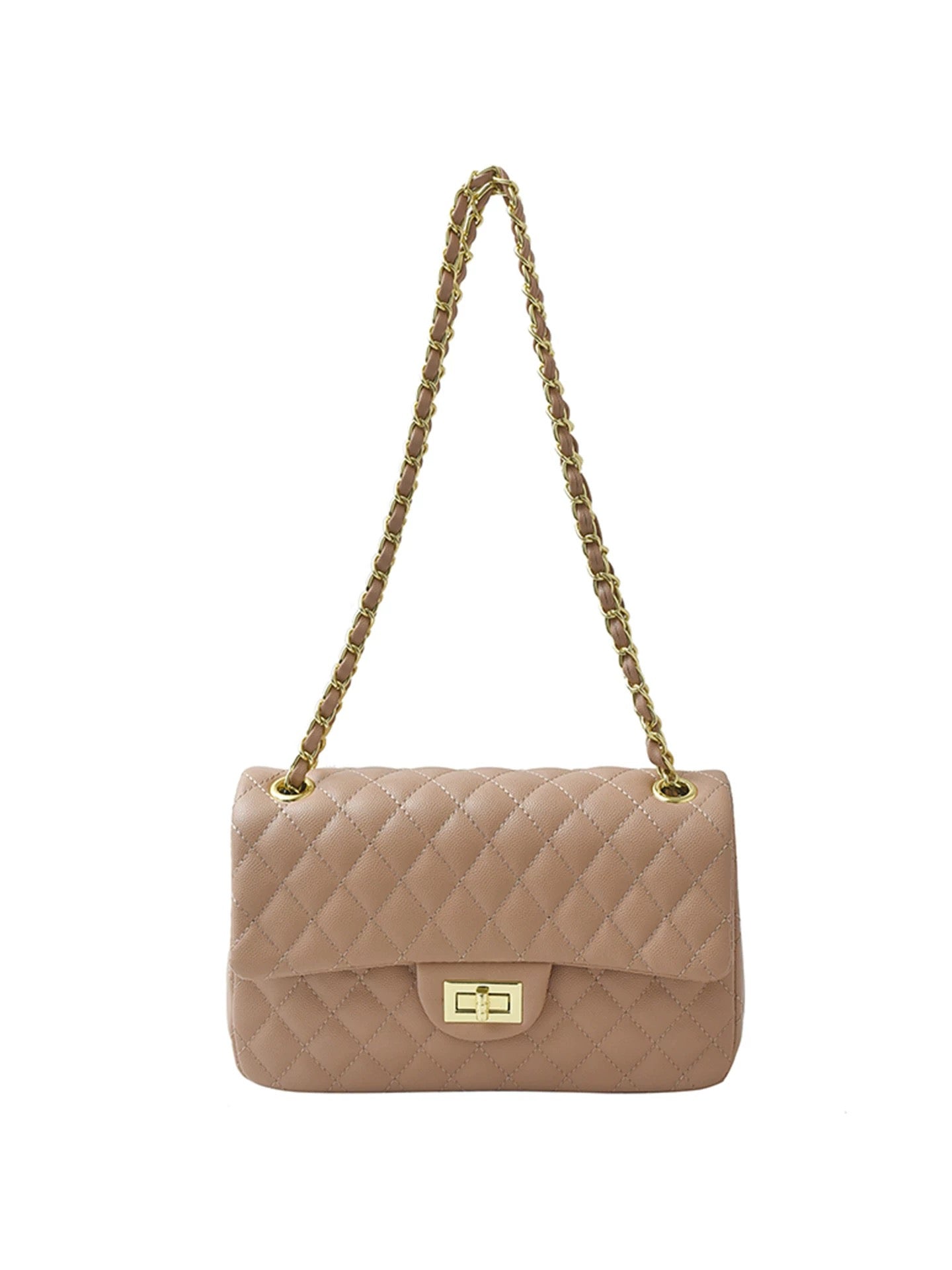 La lavorazione trapuntata a rombi dona un tocco raffinato e moderno, mentre la catena metallica e la chiusura girevole aggiungono carattere e sicurezza. Una borsa pensata per accompagnarti ogni giorno, dal lavoro al tempo libero.
