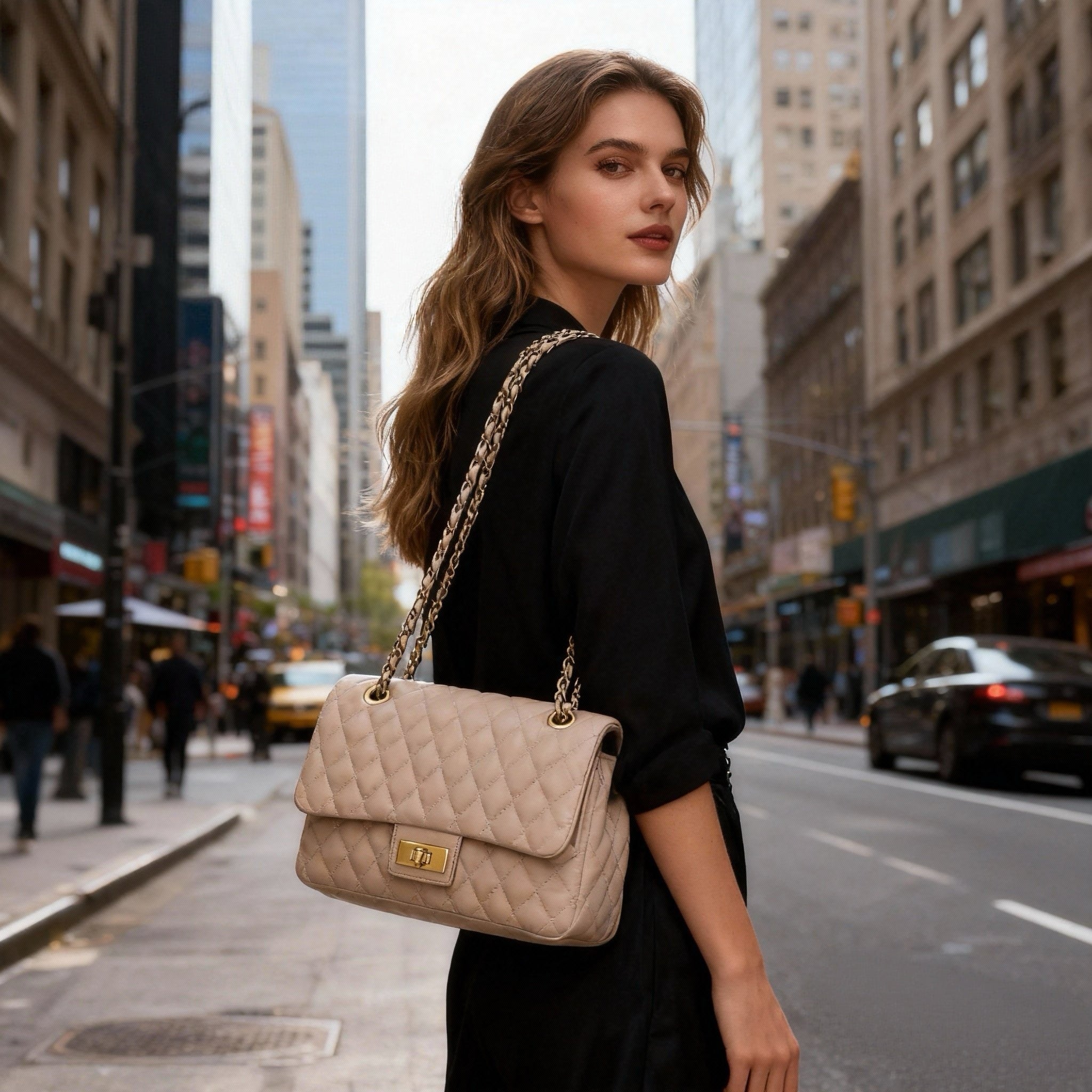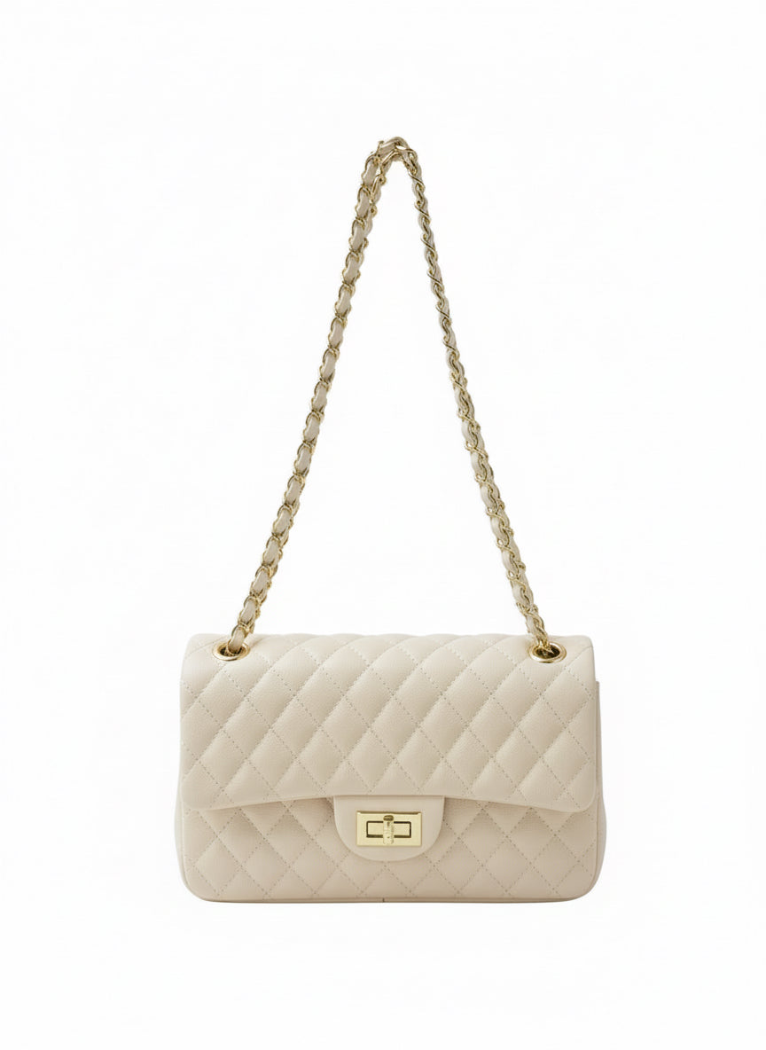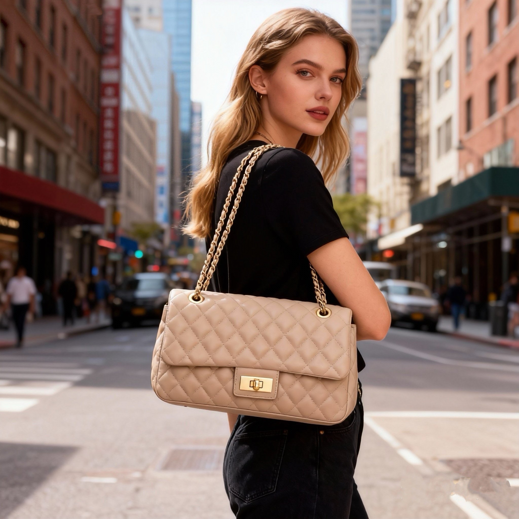Questa borsa donna trapuntata a spalla è ispirata allo stile urbano delle donne italiane: linee pulite, design senza tempo e un’eleganza discreta adatta a ogni occasione.