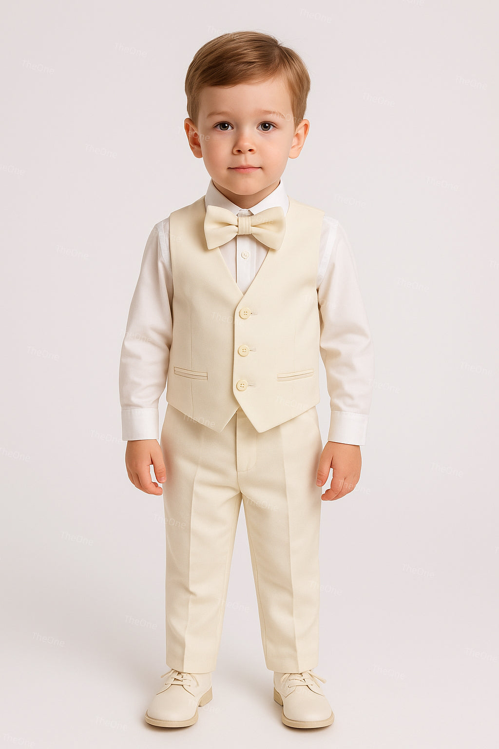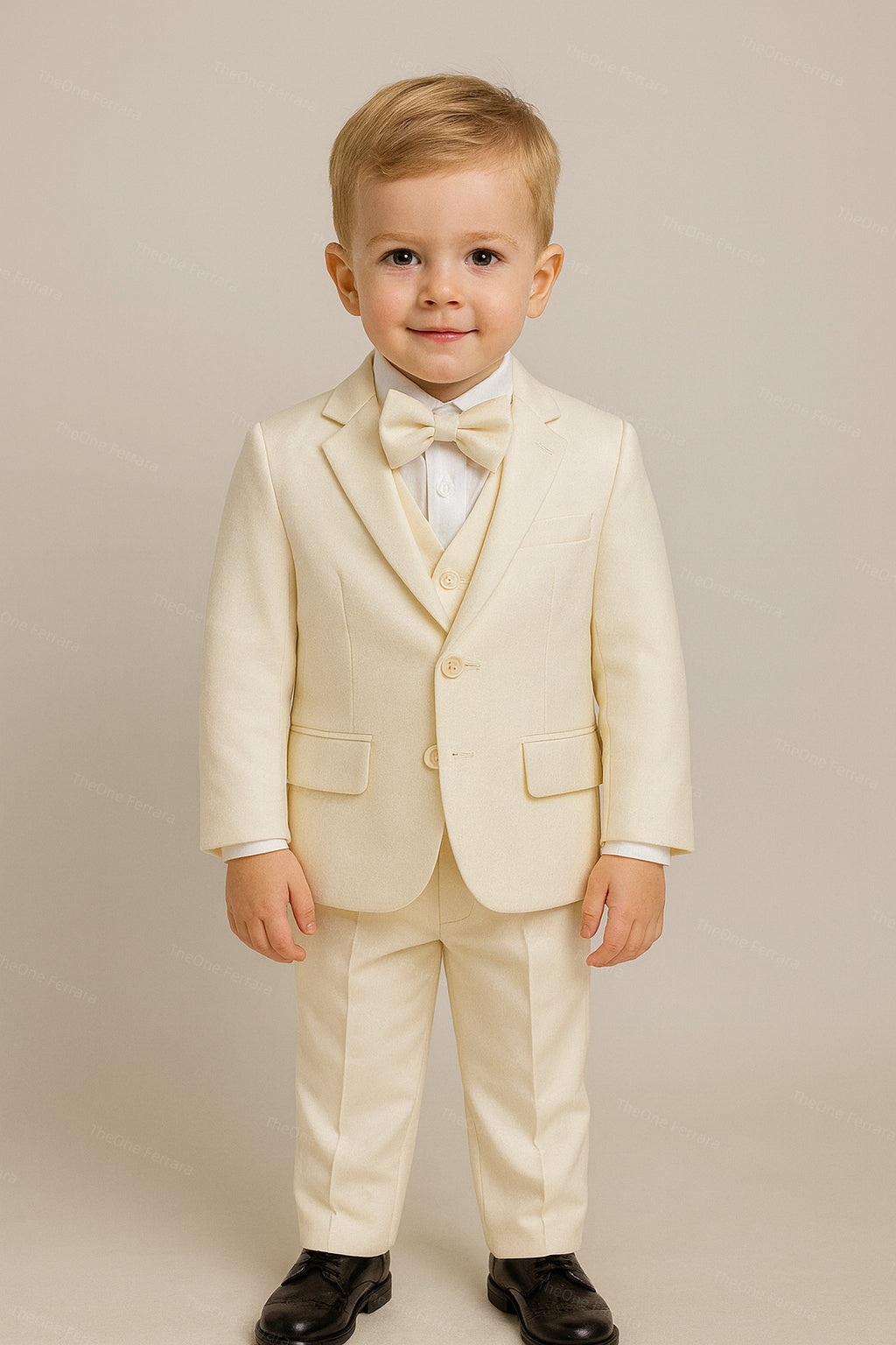 Completo Cerimonia Bambino 5 Pezzi – Abito Elegante Bianco Avorio con Giacca, Gilet, Camicia, Pantaloni e Papillon B61 ,4-14Anni TheOne