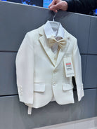 Il set comprende giacca bianco avorio, gilet coordinato, camicia bianca, pantaloni eleganti e papillon in tinta, creando un look impeccabile e molto raffinato.