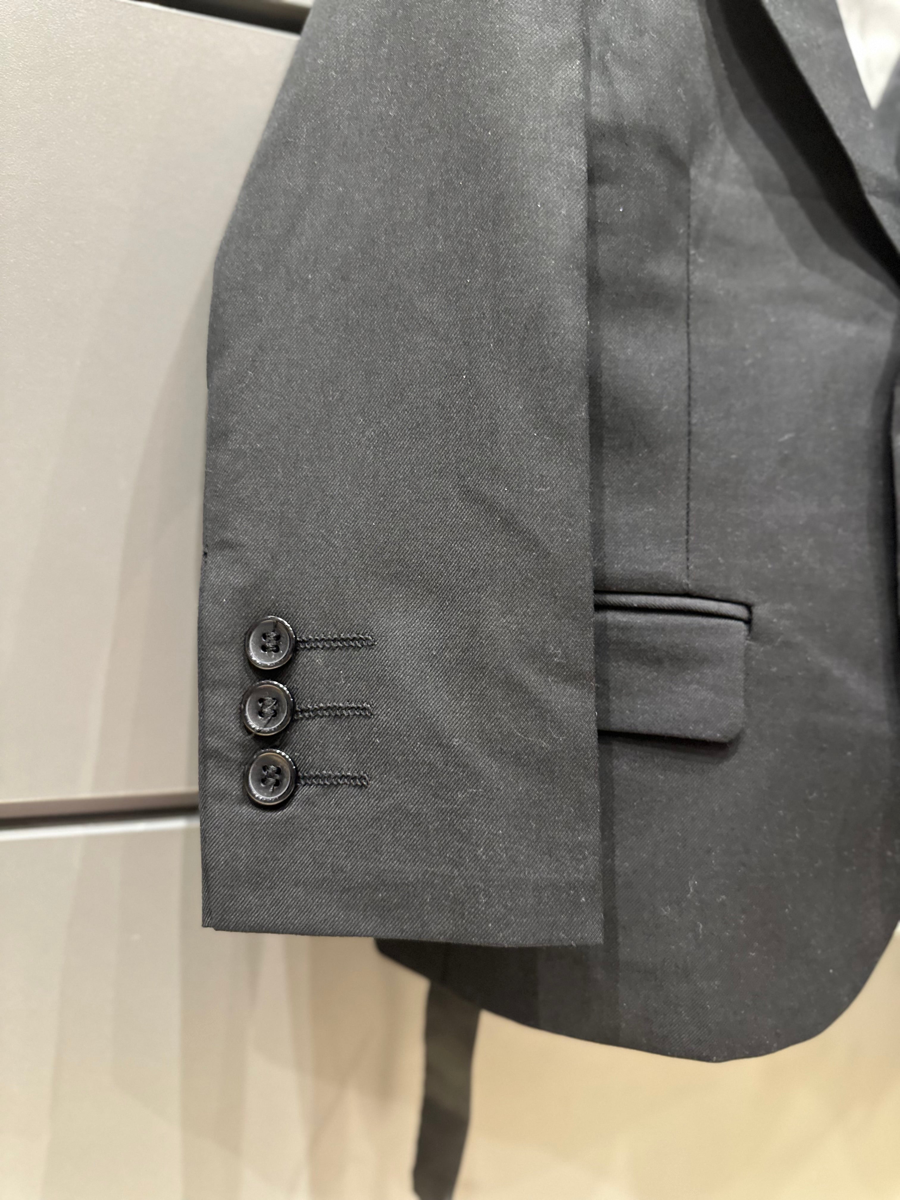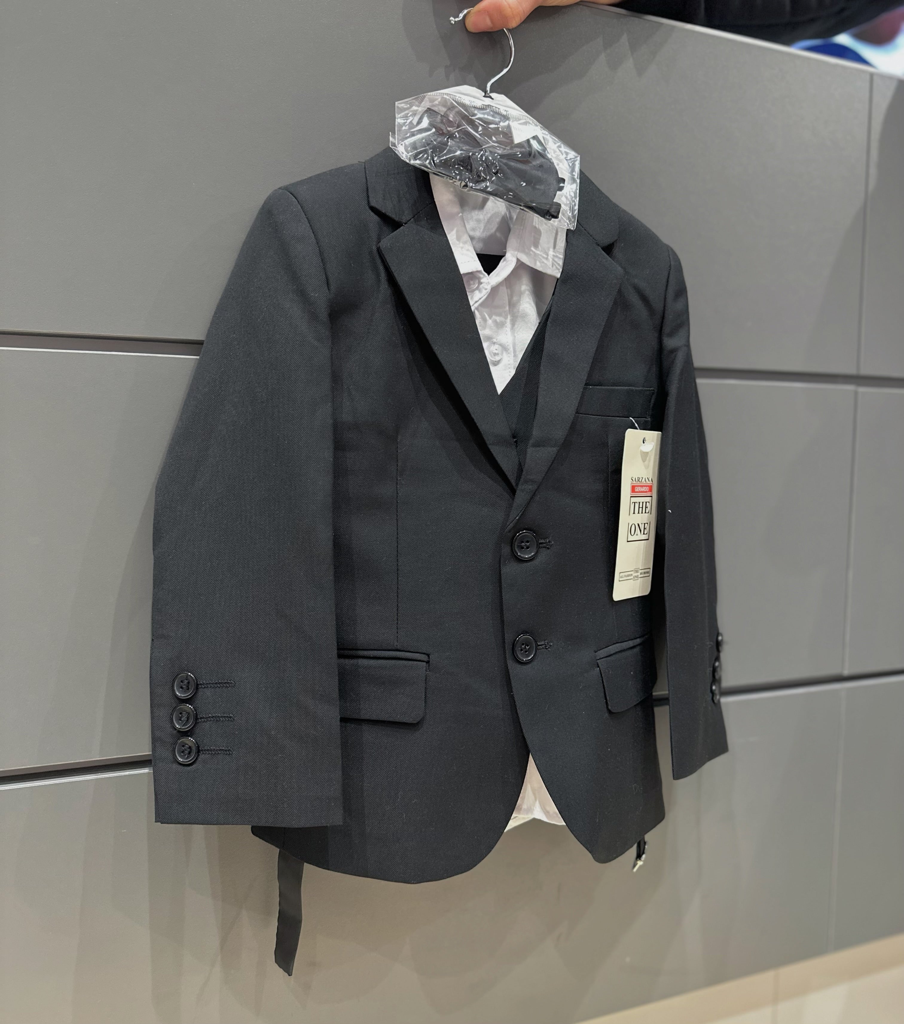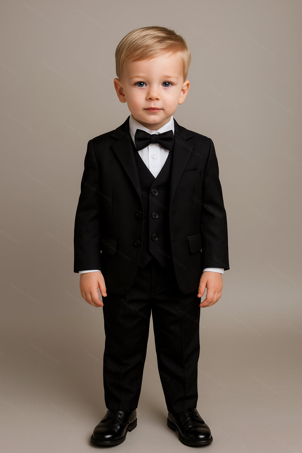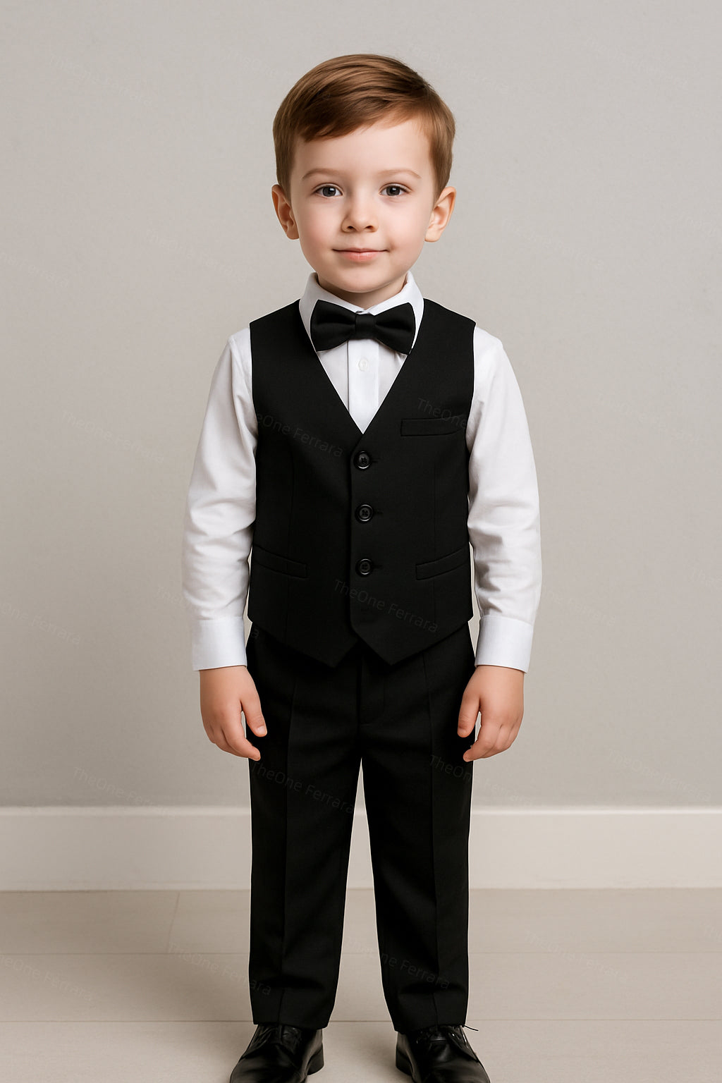 Il design nero totale conferisce raffinatezza e sobrietà, rendendo questo outfit ideale per piccoli paggetti o per qualsiasi evento speciale che richieda uno stile formale e curato.